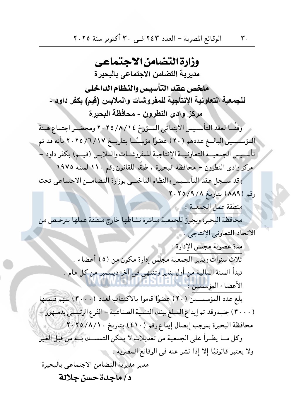 كما نشرت الوقائع المصرية في العدد 243، بتاريخ 30 أكتوبر 2025، قرار وزارة التضامن الاجتماعي، مديرية التضامن الاجتماعي بالبحيرة، بشأن ملخص عقد التأسيس والنظام الداخلى للجمعية التعاونية الإنتاجية للمفروشات والملابس "قيم" بكفر داود - مركز وادى النطرون - محافظة البحيرة.