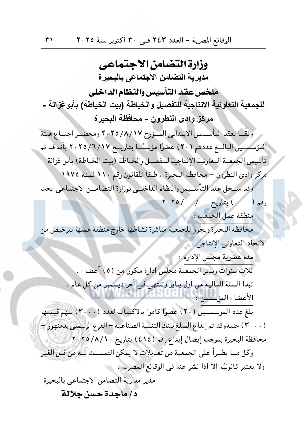 وأيضا نشرت الوقائع المصرية في العدد 243، بتاريخ 30 أكتوبر 2025، قرار وزارة التضامن الاجتماعي، مديرية التضامن الاجتماعي بالبحيرة، بشأن ملخص عقد التأسيس والنظام الداخلى للجمعية التعاونية الإنتاجية للتفصيل والخياطة "بيت الخياطة" بأبو غزالة - مركز وادى النطرون - محافظة البحيرة.