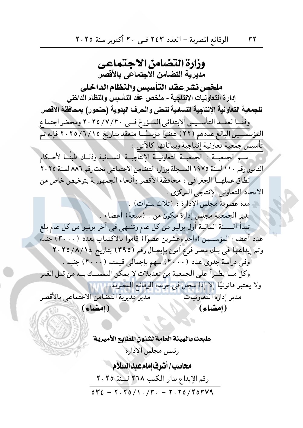 ونشرت الوقائع المصرية في العدد 243، بتاريخ 30 أكتوبر 2025، قرار وزارة التضامن الاجتماعي، مديرية التضامن الاجتماعي بالأقصر، بشأن ملخص عقد التأسيس والنظام الداخلى، إدارة التعاونيات الإنتاجية – بشأن ملخص عقد التأسيس والنظام الداخلى للجمعية التعاونية الإنتاجية النسائية للحلى والحرف اليدوية "حتحور" بمحافظة الأقصر.