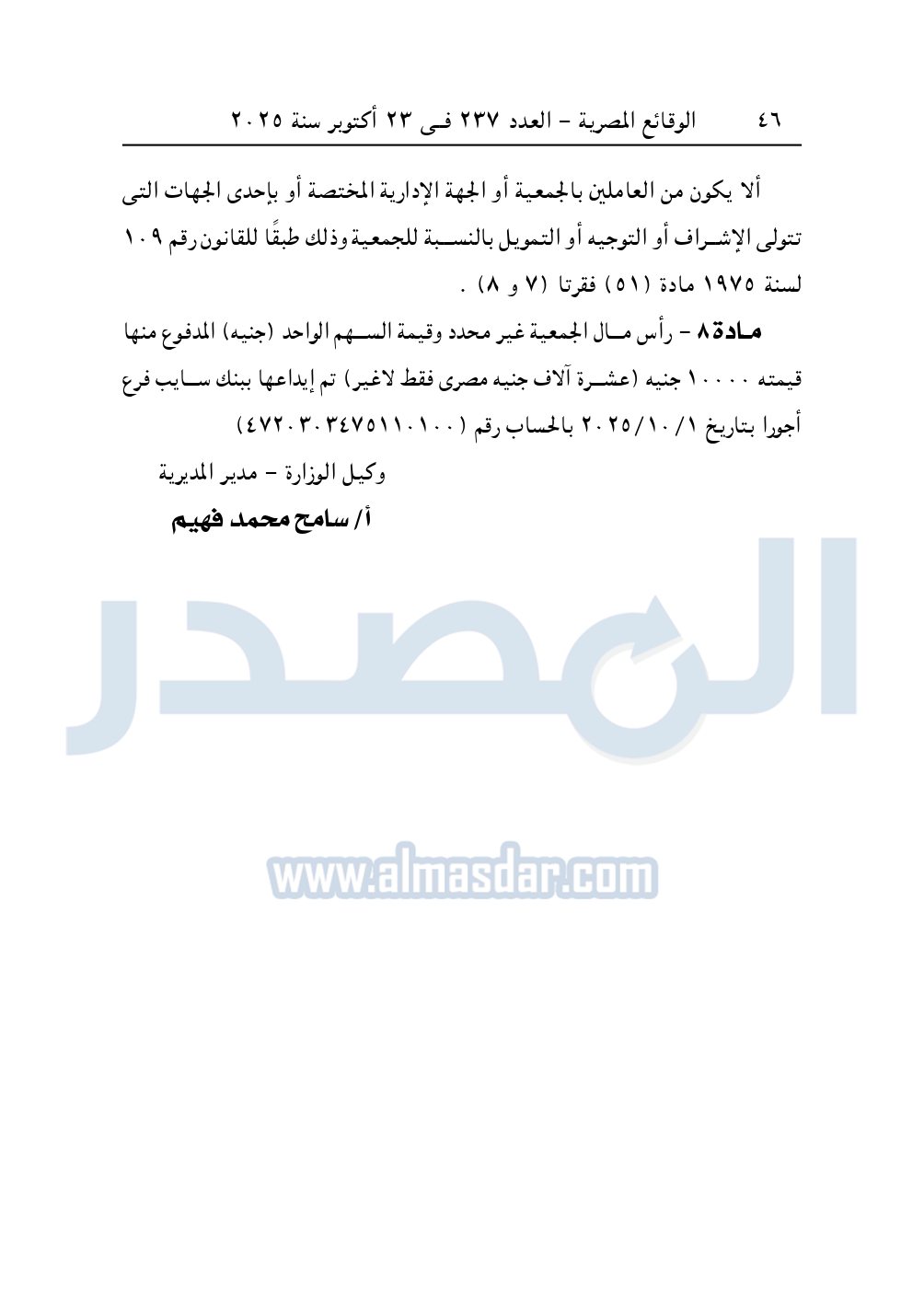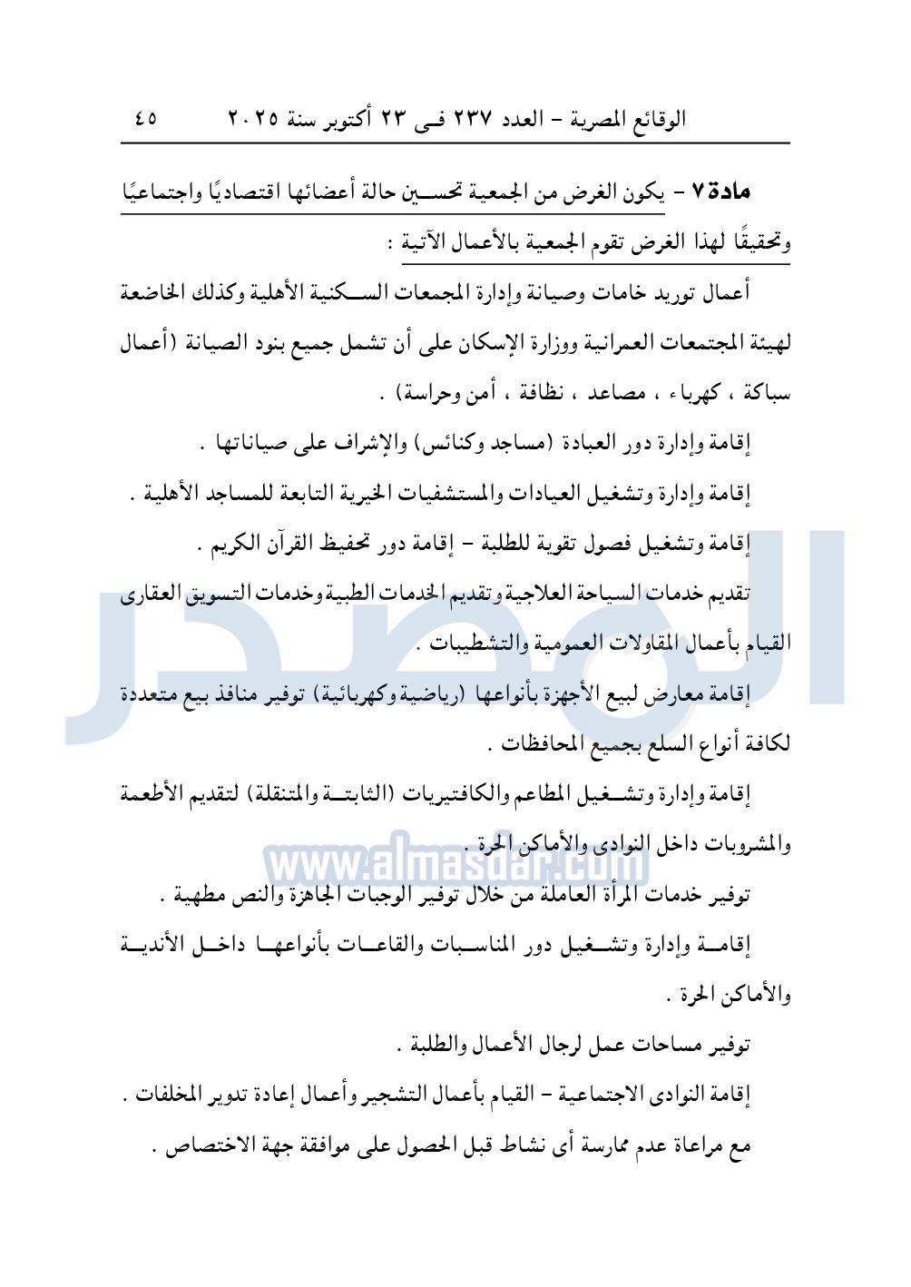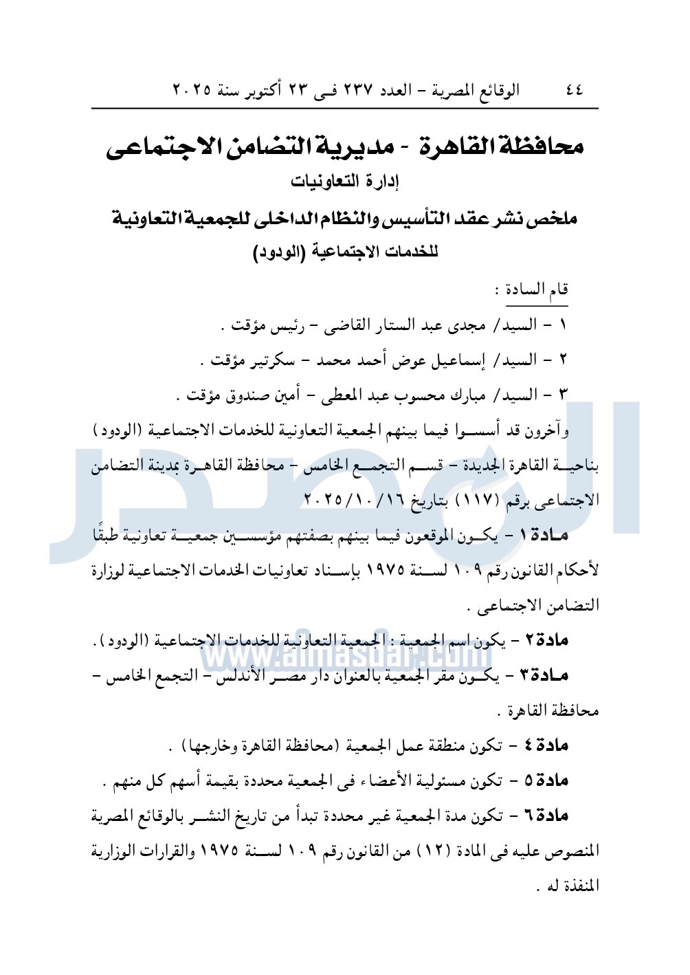 كما نشرت الوقائع المصرية في العدد 237، بتاريخ 23 أكتوبر 2025، قرار مديرية التضامن الاجتماعي، محافظة القاهرة، إدارة التعاونيات، بشأن ملخص نشر عقد التأسيس والنظام الداخلى للجمعية التعاونية للخدمات الاجتماعية "الودود".