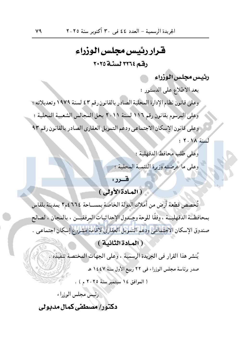 نشرت الجريدة الرسمية في العدد 44، بتاريخ 30 أكتوبر 2025، قرار رئيس مجلس الوزراء، رقم 3264 لسنة 2025، بشأن تخصيص قطعة أرض لإقامة مشروع إسكان اجتماعي بالدقهلية.
