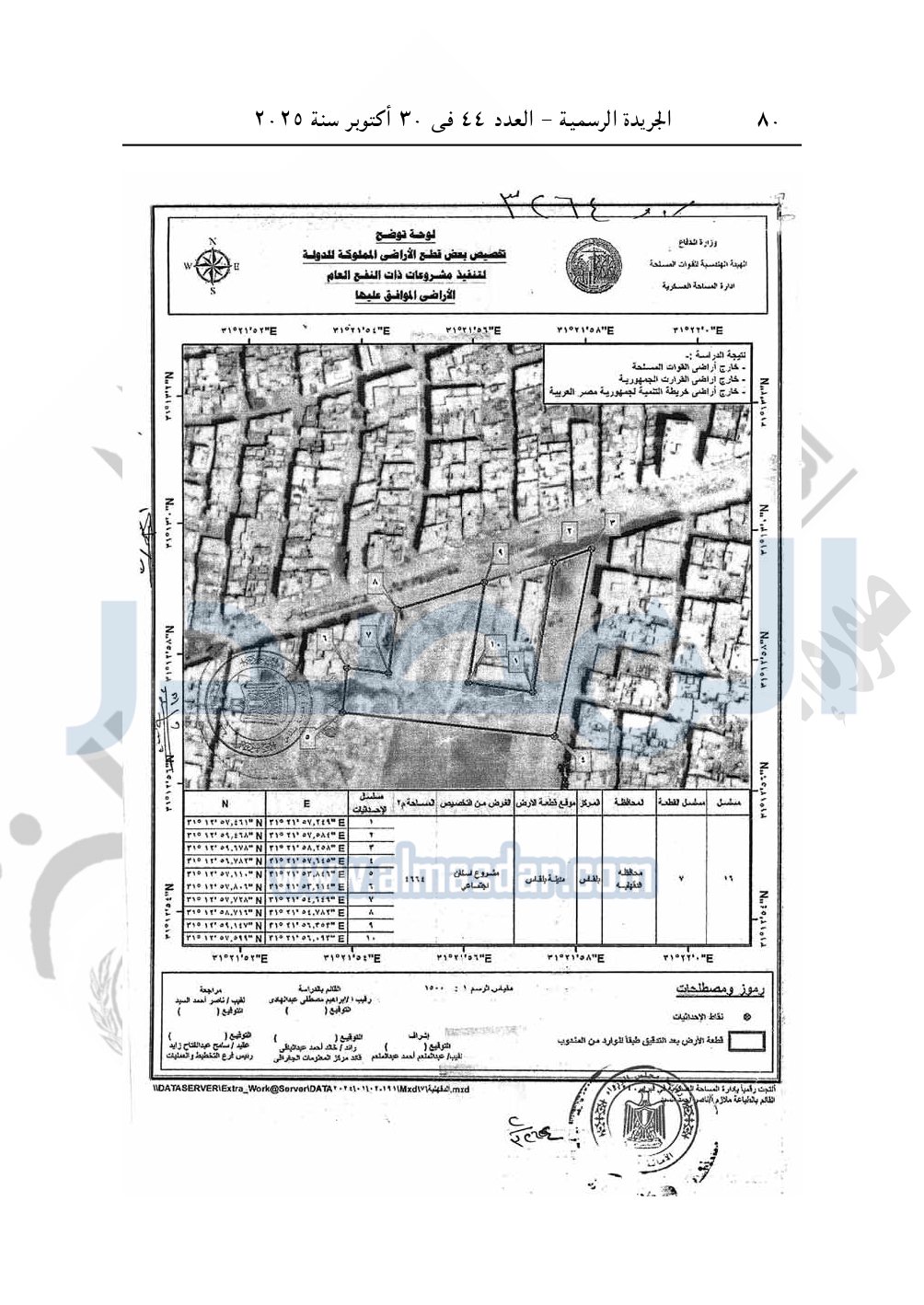 تخصص قطعة أرض من أملاك الدولة الخاصة بمساحة 4664م2 بمدينة بلقاس بمحافظة الدقهلية، وفقًا للوحة وجدول الإحداثيات المرفقين، بالمجان، لصالح صندوق الإسكان الاجتماعي ودعم التمويل العقاري لإقامة مشروع إسكان اجتماعي.