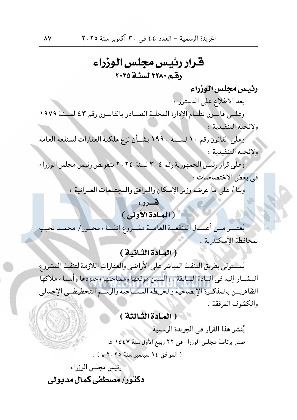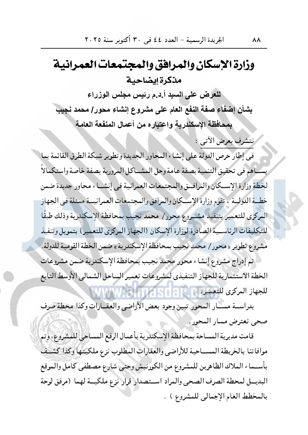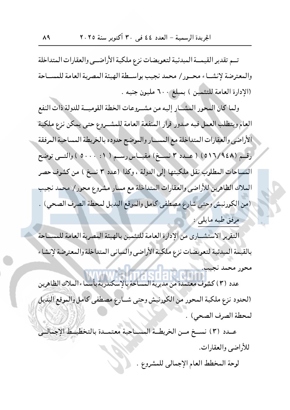 نشرت الجريدة الرسمية في العدد 44، بتاريخ 30 أكتوبر 2025، قرار رئيس مجلس الوزراء، رقم 3280 لسنة 2025، بشأن نزع ملكية أرضي وعقارات لإنشاء محور محمد نجيب بمحافظة الإسكندرية.