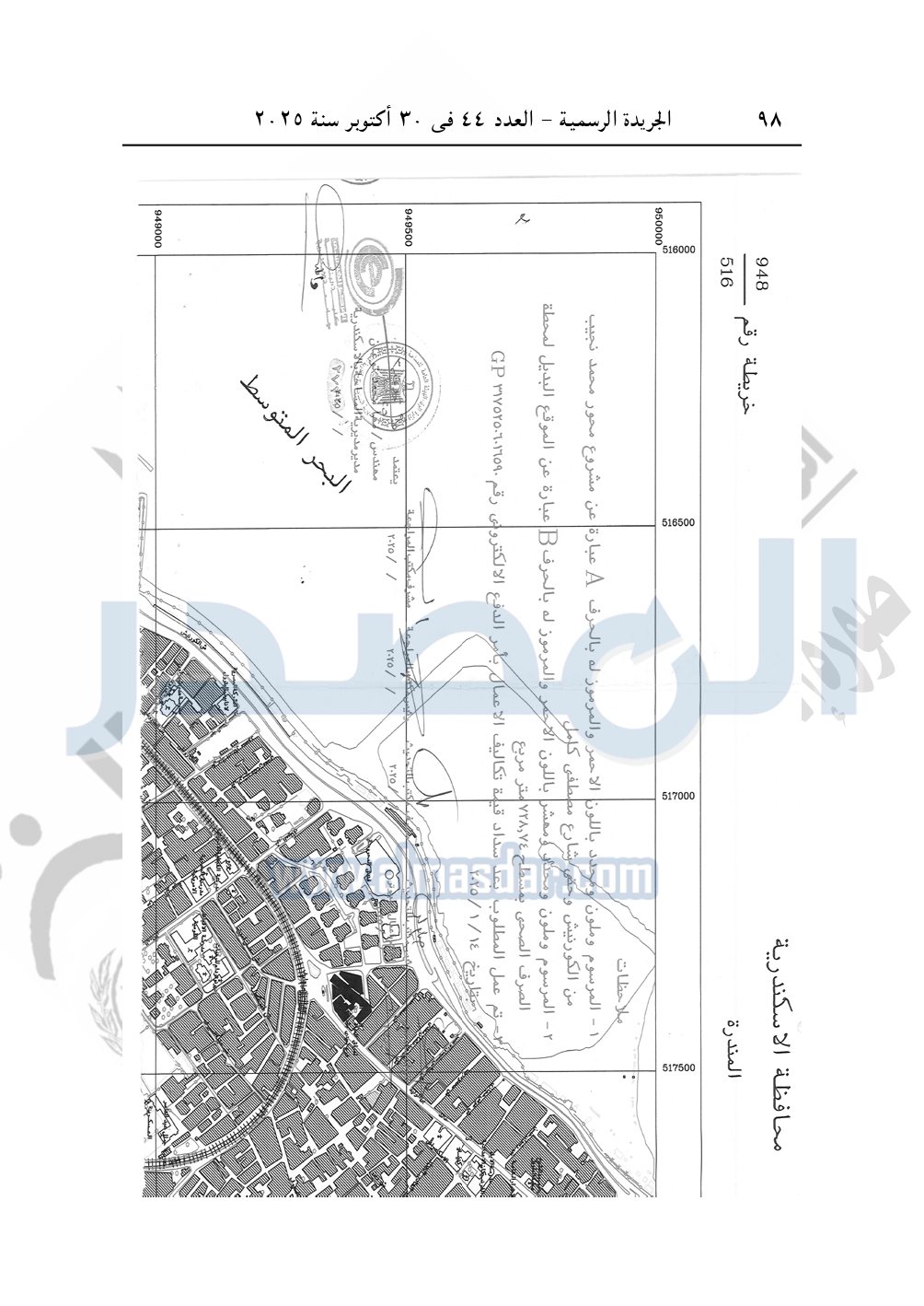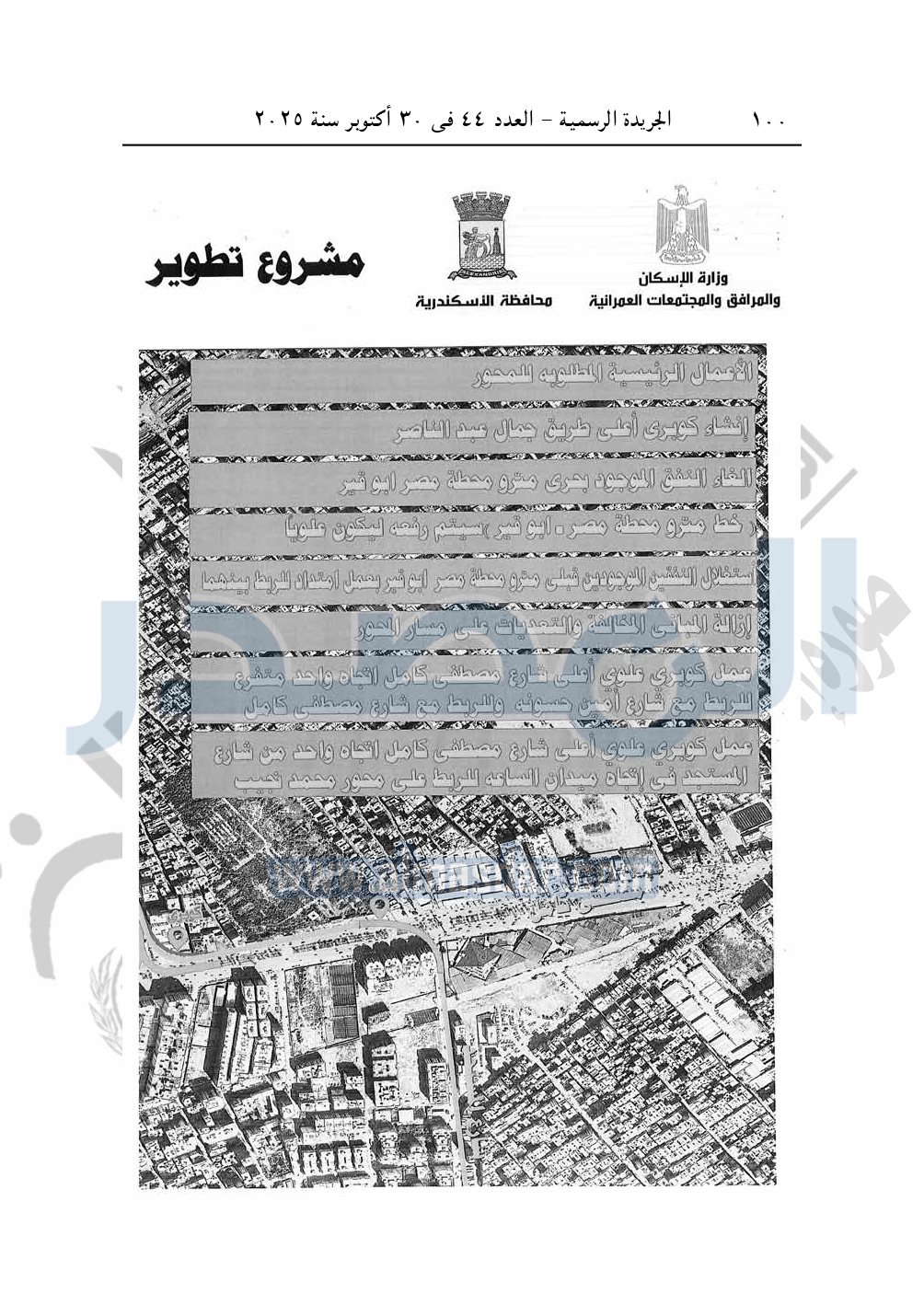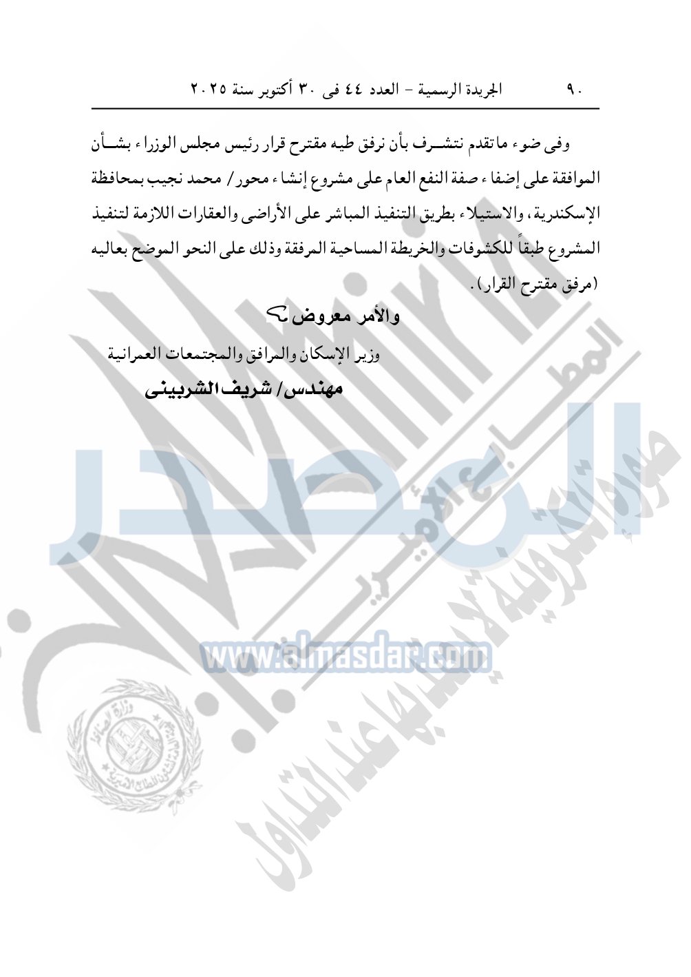 نشرت الجريدة الرسمية في العدد 44، بتاريخ 30 أكتوبر 2025، قرار رئيس مجلس الوزراء، رقم 3280 لسنة 2025، بشأن نزع ملكية أرضي وعقارات لإنشاء محور محمد نجيب بمحافظة الإسكندرية.