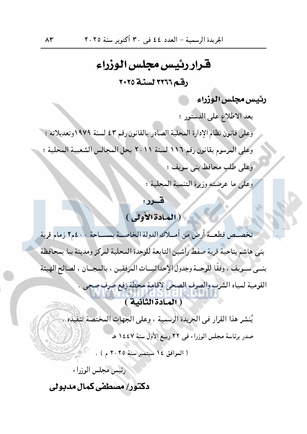 نشرت الجريدة الرسمية في العدد 44، بتاريخ 30 أكتوبر 2025، قرار رئيس مجلس الوزراء، رقم 3266 لسنة 2025، بشأن تخصيص قطعة أرض لإقامة محطة رفع صرف صحي ببنى سويف.