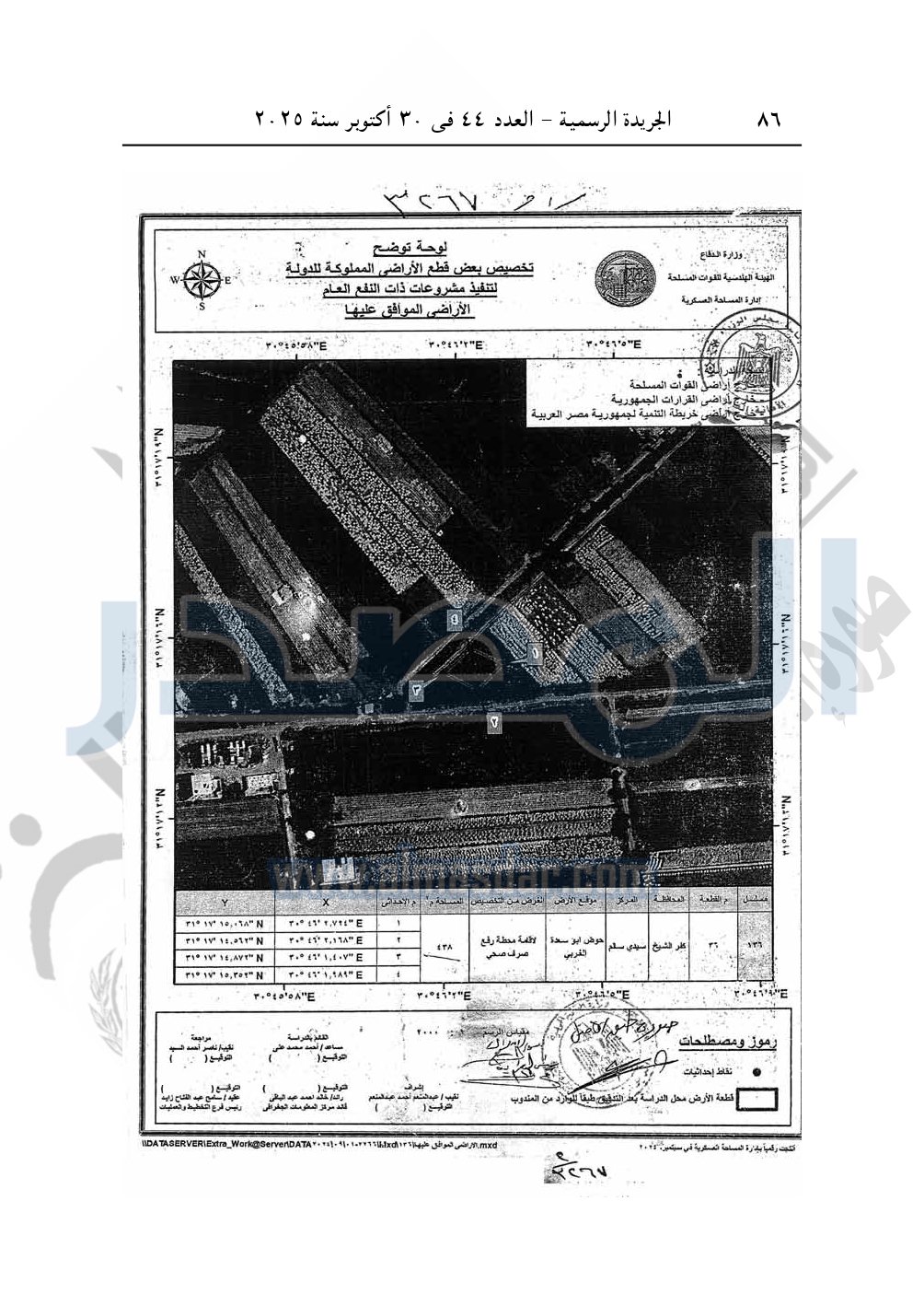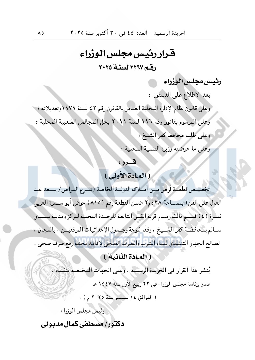 كما نشرت الجريدة الرسمية في العدد 44، بتاريخ 30 أكتوبر 2025، قرار رئيس مجلس الوزراء، رقم 3267 لسنة 2025، بشأن تخصيص قطعة أرض لإقامة محطة رفع صرف صحي بكفر الشيخ.