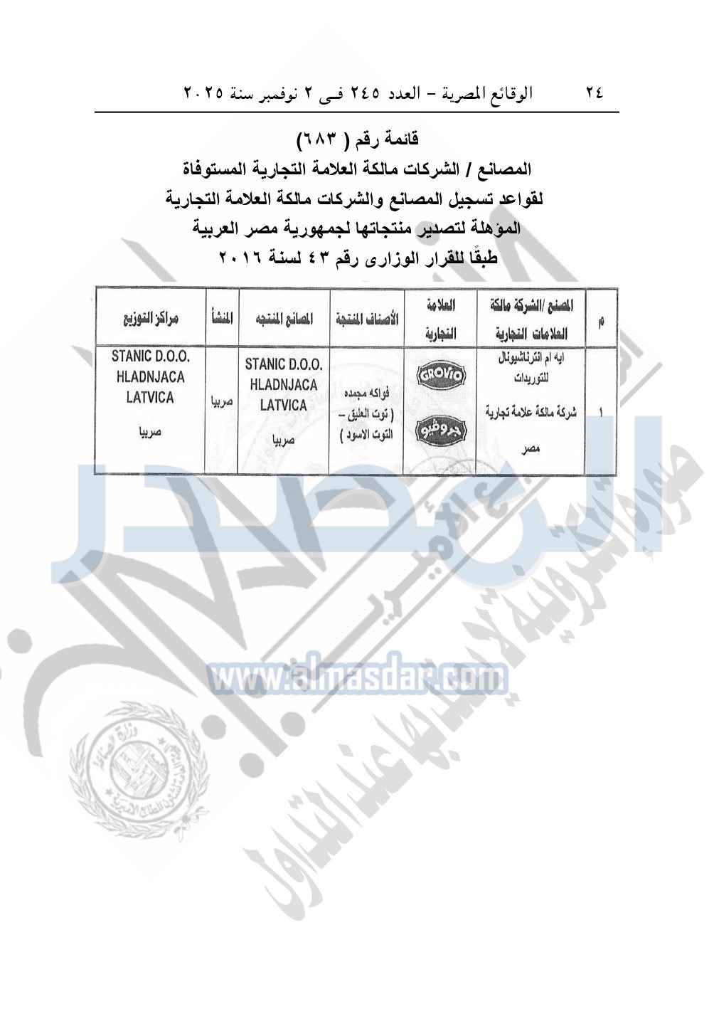 تقيد المصانع والشركات مالكة العلامة التجارية المبينة أسماؤها بالقوائم المرفقة رقم "683" طبقاً للقرار رقم 43 لسنة 2016 في سجل المصانع والشركات مالكة العلامة التجارية المؤهلة لتصدير منتجاتها إلى جمهورية مصر العربية والمنشأ لهذا الغرض بالهيئة العامة للرقابة على الصادرات والواردات.
