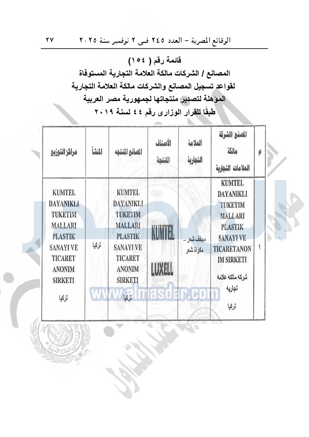 تقيد المصانع والشركات مالكة العلامة التجارية المبينة أسماؤها بالقوائم المرفقة رقم "154" طبقاً للقرار رقم 44 لسنة 2019 في سجل المصانع والشركات مالكة العلامة التجارية المؤهلة لتصدير منتجاتها إلى جمهورية مصر العربية والمنشأ لهذا الغرض بالهيئة العامة للرقابة على الصادرات والواردات.
