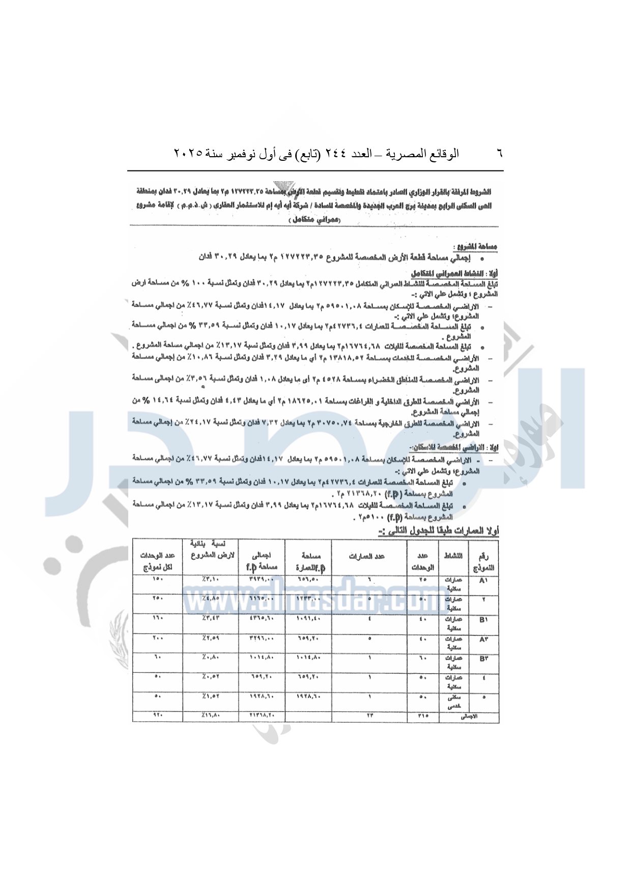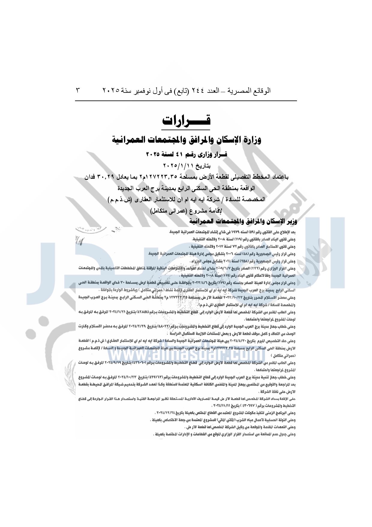 نشرت الوقائع المصرية في العدد 244 "تابع"، الصادر في أول نوفمبر 2025، قرار وزارة الإسكان والمرافق والمجتمعات العمرانية، رقم 41 لسنة 2025، بتاريخ 11-1-2025، بشأن اعتماد المخطط التفصيلى لقطعة أرض بمنطقة الحى السكنى الرابع بمدينة برج العرب الجديدة المخصصة لـ شركة ايه ايه ام ان للاستثمار العقارى لإقامة مشروع عمراني.