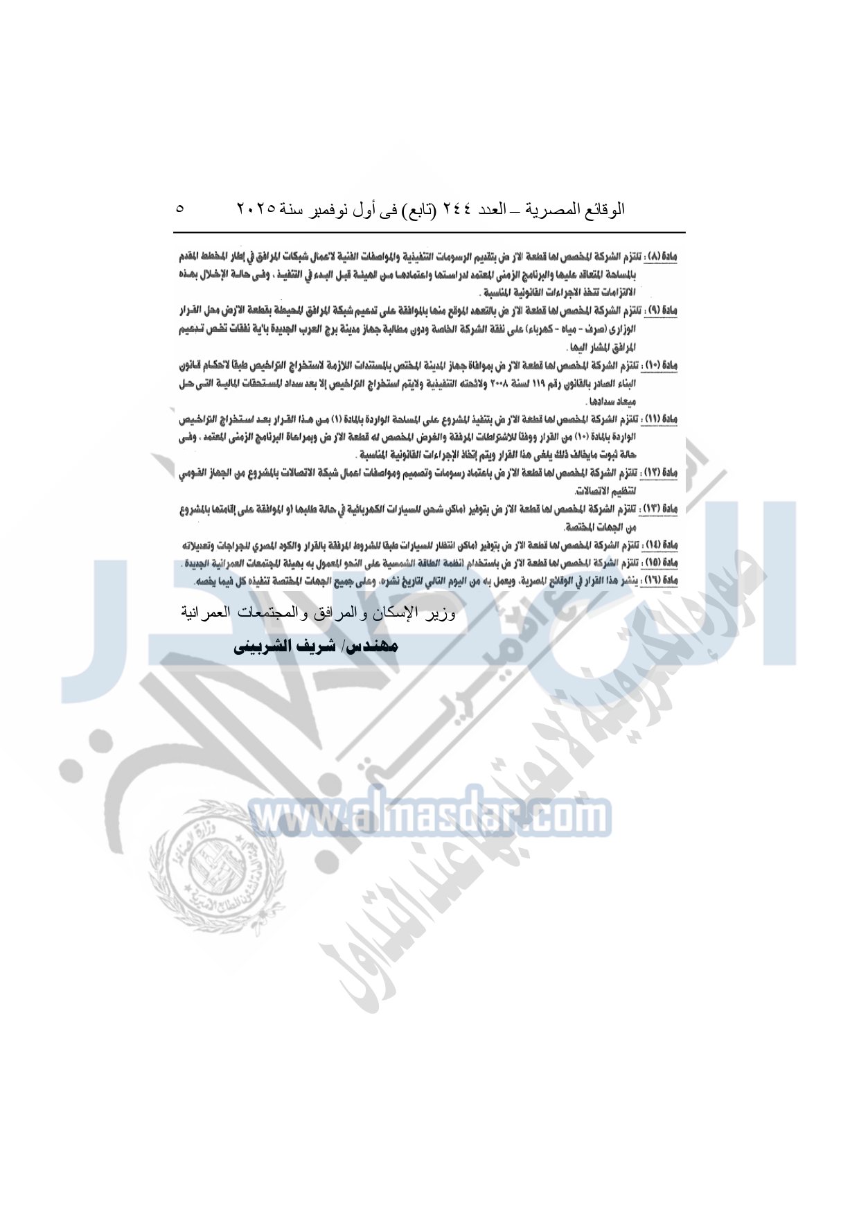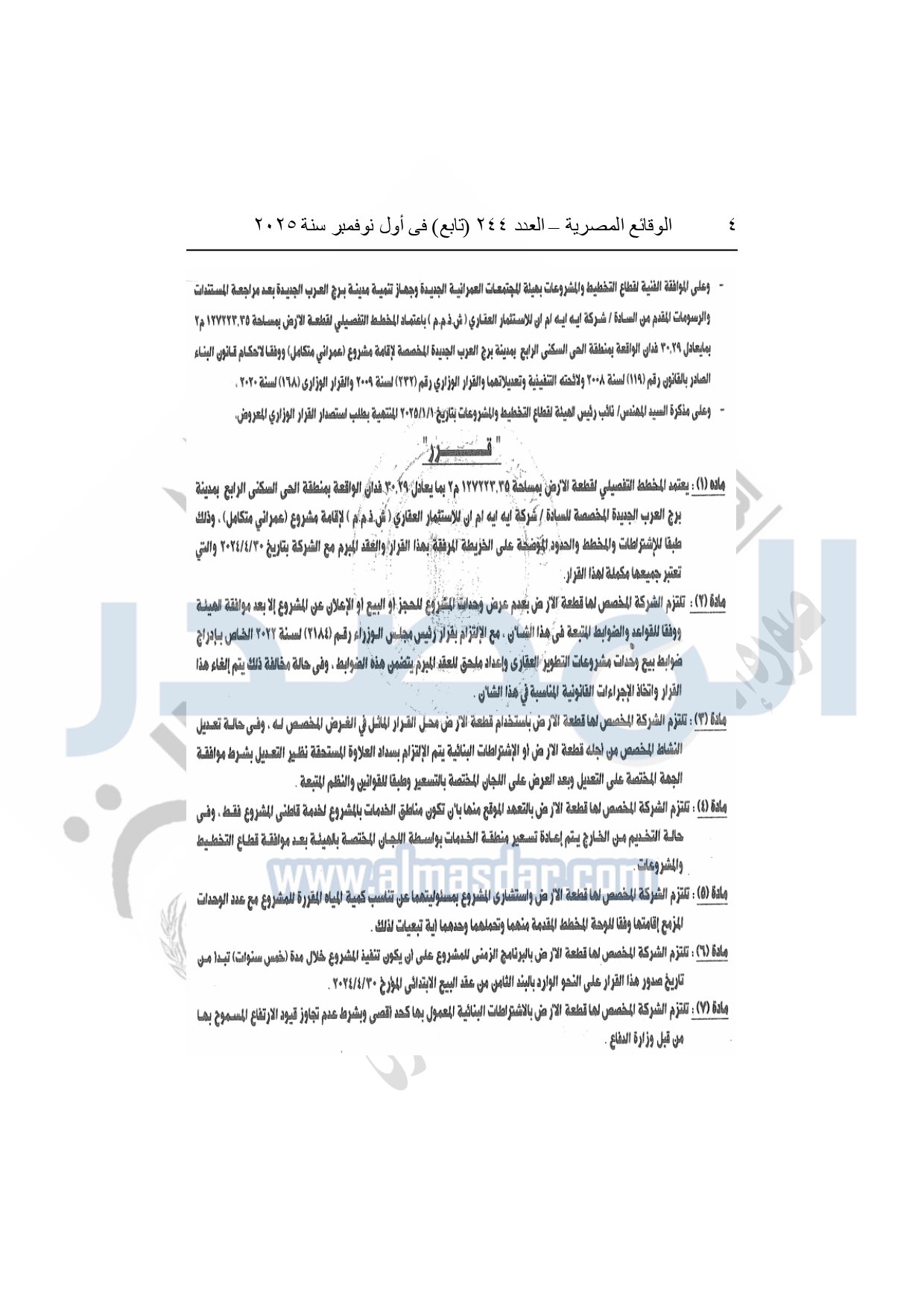 تلتزم الشركة المخصص لها قطعة الأرض بالبرنامج الزمنى للمشروع على أن يكون تنفيذ المشروع خلال مدة "خمس سنوات" تبدأ من تاريخ صدور هذا القرار على النحو الوارد بالبند الثامن من عقد البيع الابتدائى المؤرخ 30-4-2024.