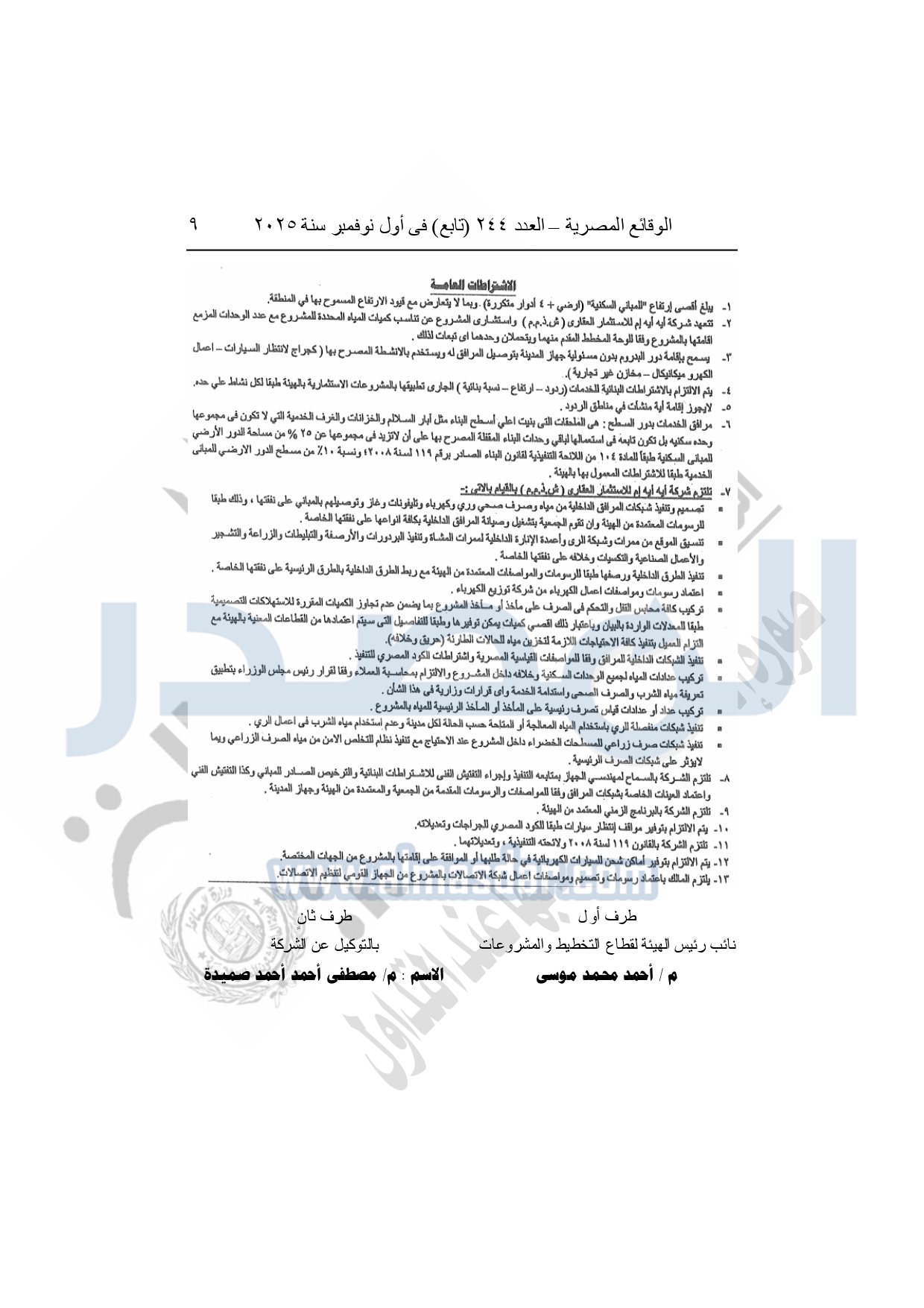 تلتزم الشركة المخصص لها قطعة الأرض واستشارى المشروع بمسئوليتهما عن تناسب كمية المياه المقررة للمشروع مع عدد الوحدات المزمع إقامتها وفقا للوحة المخطط المقدمة منهما وتحملهما وحدهما أية تبعيات لذلك.