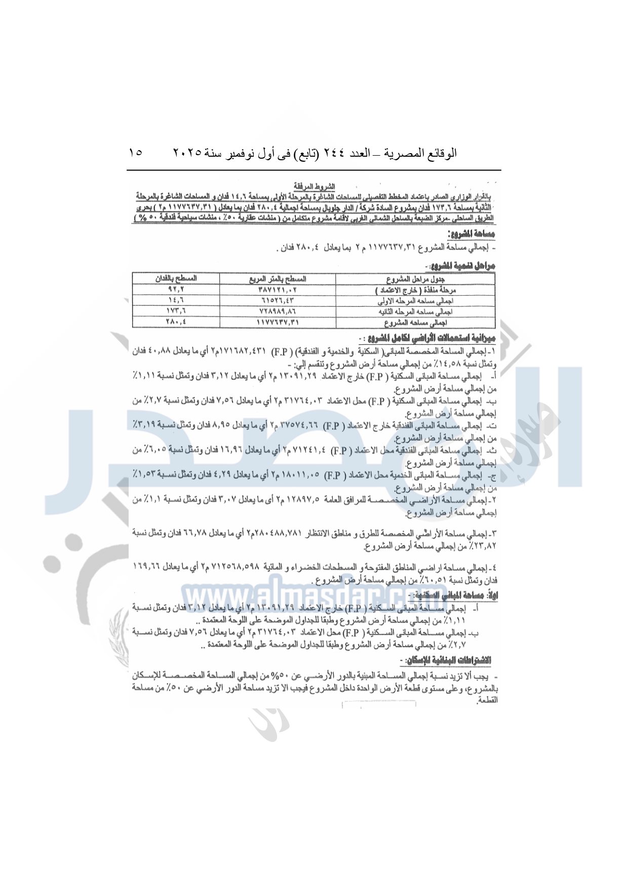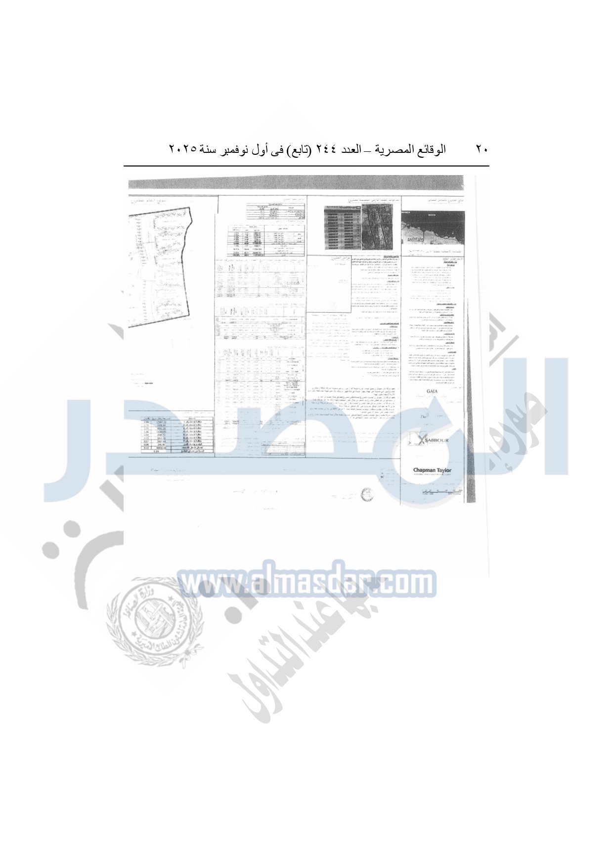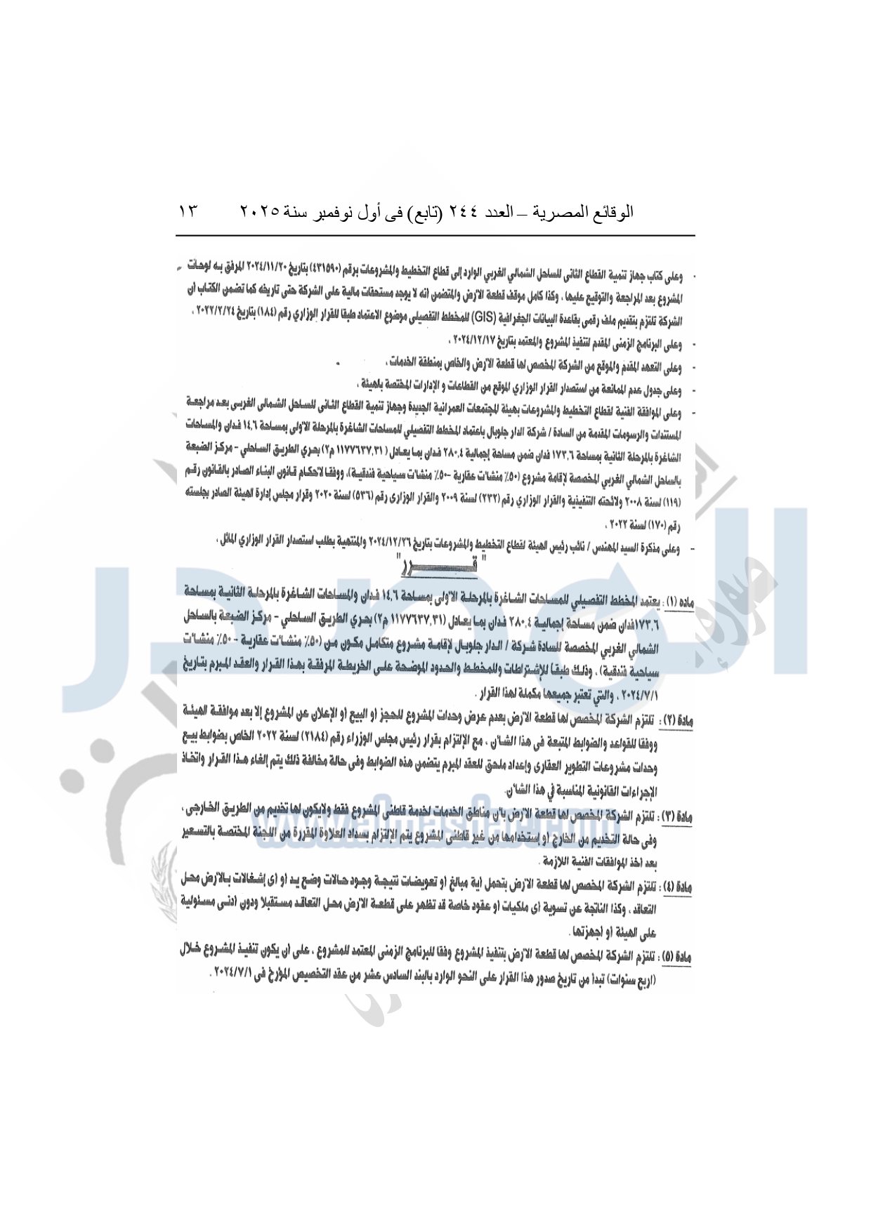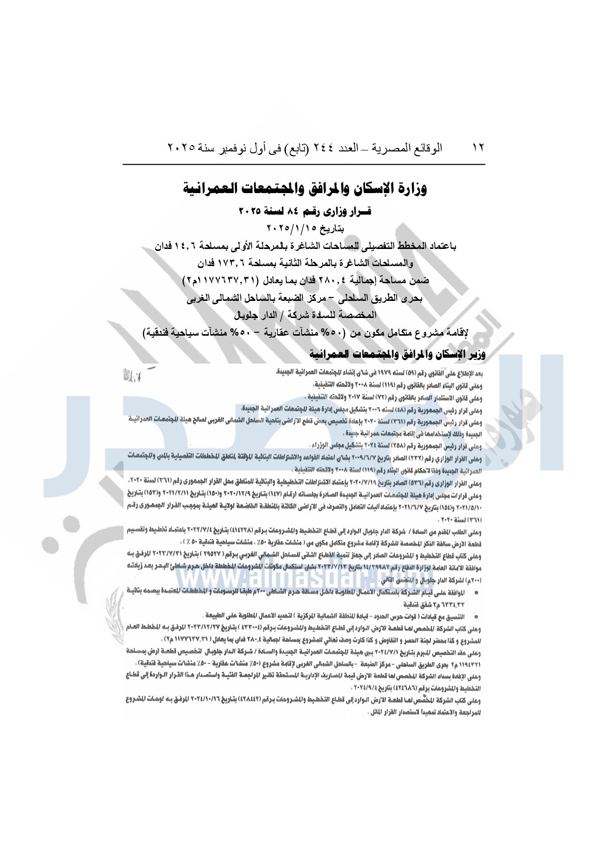 نشرت الوقائع المصرية في العدد 244 "تابع"، الصادر في أول نوفمبر 2025، قرار وزارة الإسكان والمرافق والمجتمعات العمرانية، رقم 84 لسنة 2025، بتاريخ 15-1-2025، بشأن اعتماد المخطط التفصيلى للمساحات الشاغرة بالمرحلة الأولى بمساحة 14.6 فدان والمساحات الشاغرة بالمرحلة الثانية بمساحة 173.6 فدان ضمن مساحة إجمالية 280.4 فدان بما يعادل "1177637.31م2" بحرى الطريق الساحلى - مركز الضبعة بالساحل الشمالي الغربي المخصصة لـ شركة الدار جلوبال لإقامة مشروع متكامل.