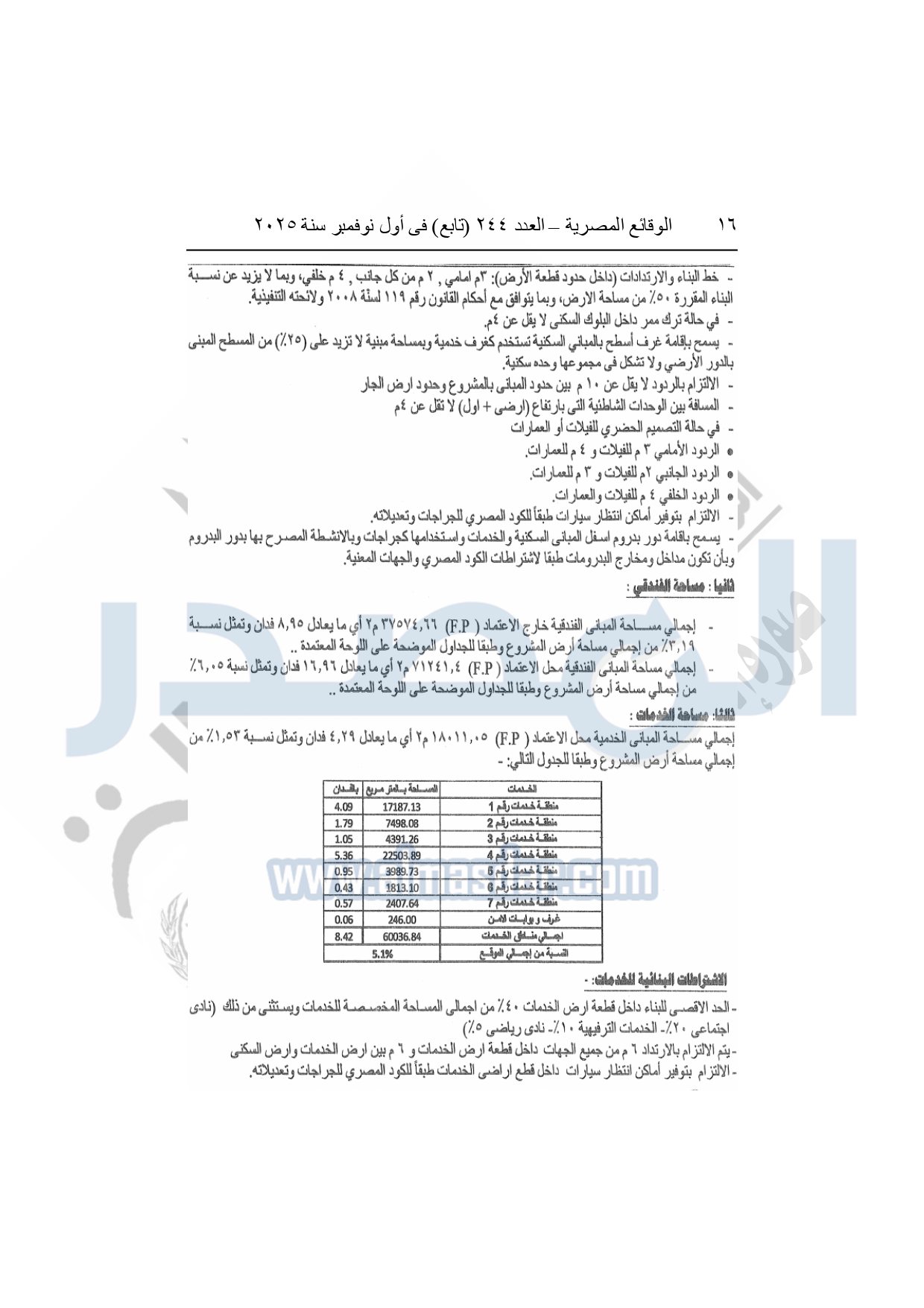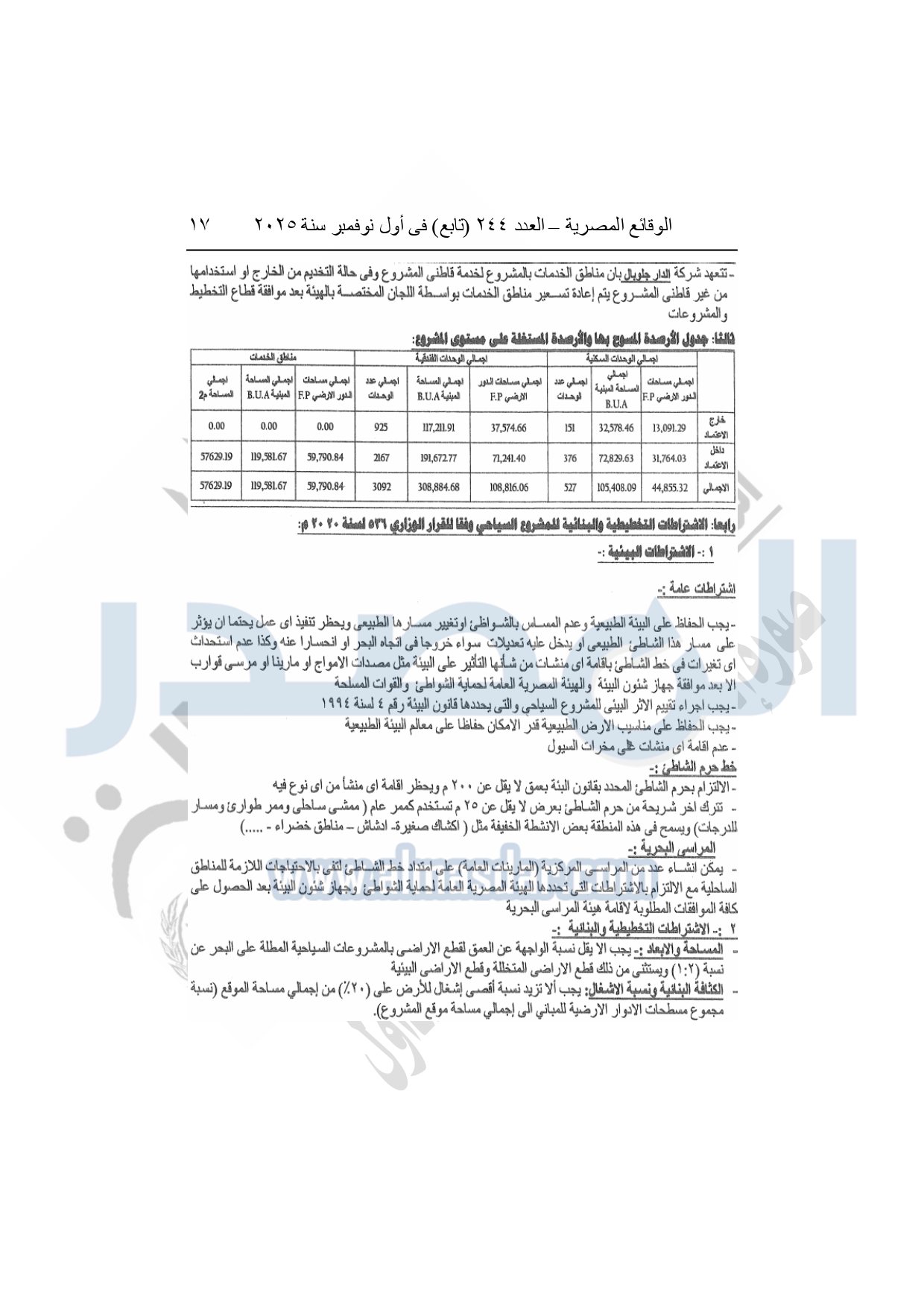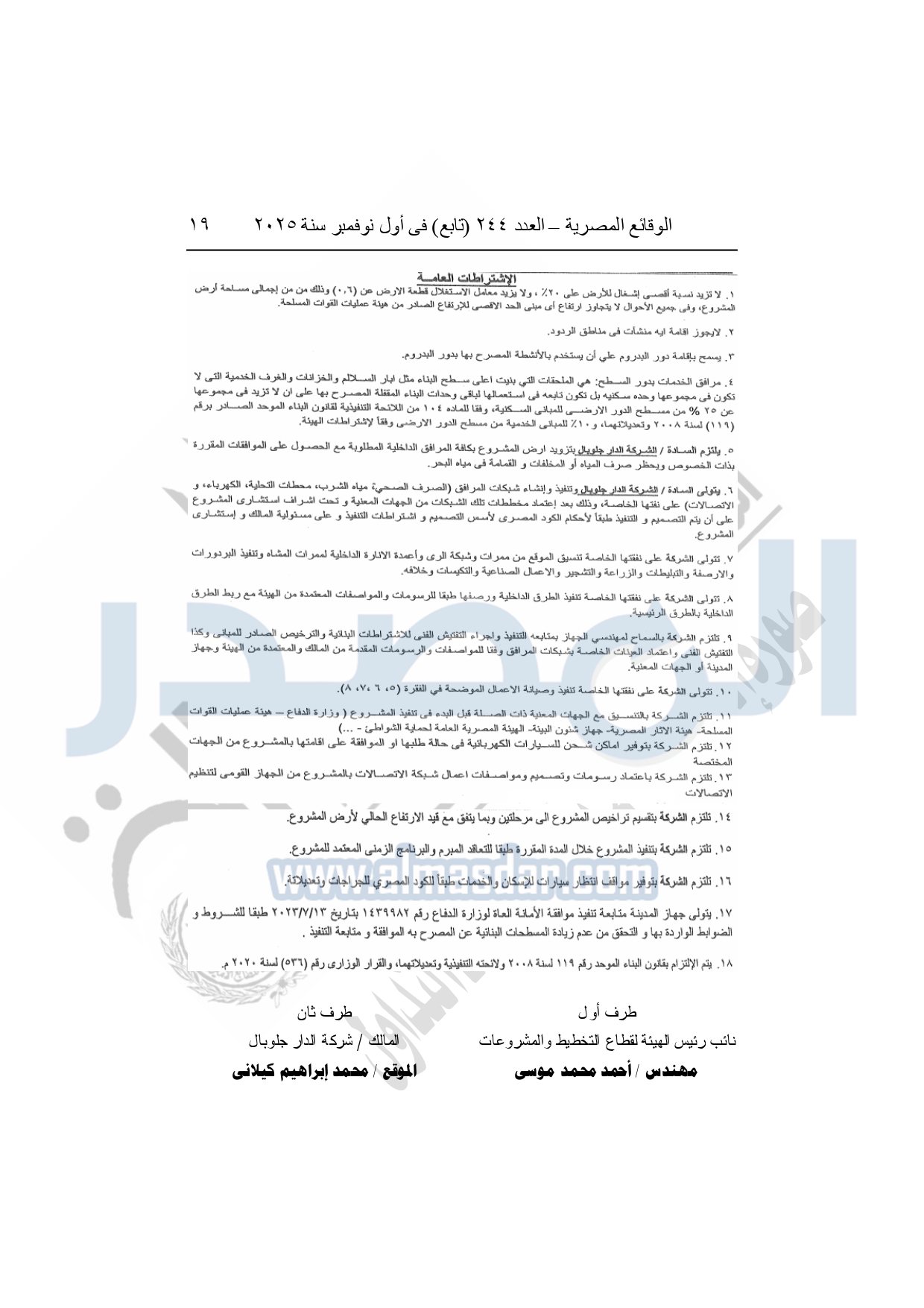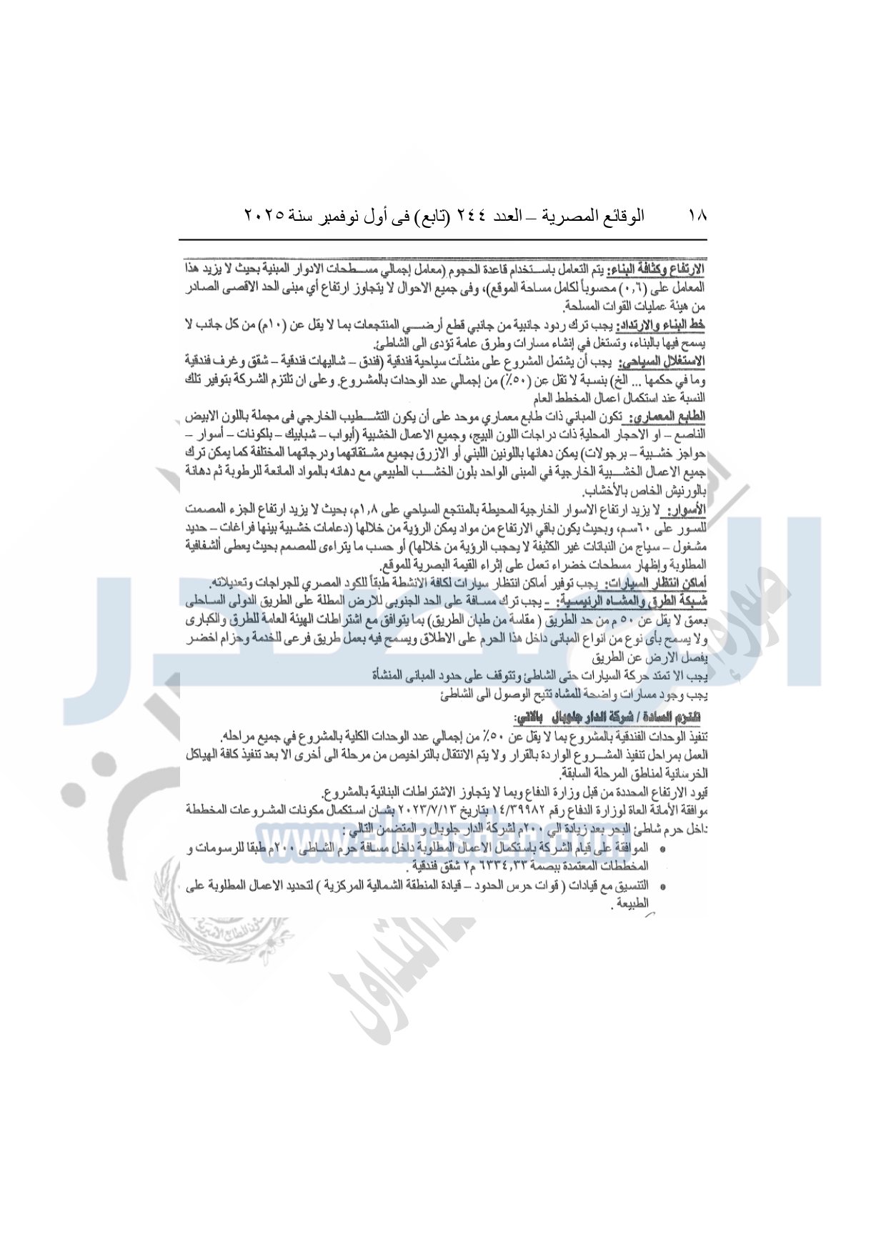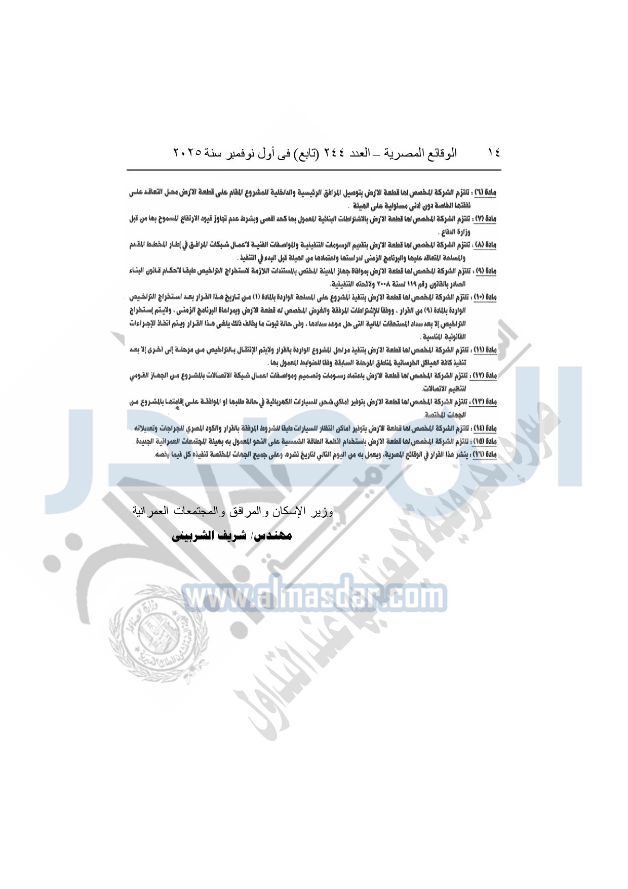 نشرت الوقائع المصرية في العدد 244 "تابع"، الصادر في أول نوفمبر 2025، قرار وزارة الإسكان والمرافق والمجتمعات العمرانية، رقم 84 لسنة 2025، بتاريخ 15-1-2025، بشأن اعتماد المخطط التفصيلى للمساحات الشاغرة بالمرحلة الأولى بمساحة 14.6 فدان والمساحات الشاغرة بالمرحلة الثانية بمساحة 173.6 فدان ضمن مساحة إجمالية 280.4 فدان بما يعادل "1177637.31م2" بحرى الطريق الساحلى - مركز الضبعة بالساحل الشمالي الغربي المخصصة لـ شركة الدار جلوبال لإقامة مشروع متكامل.