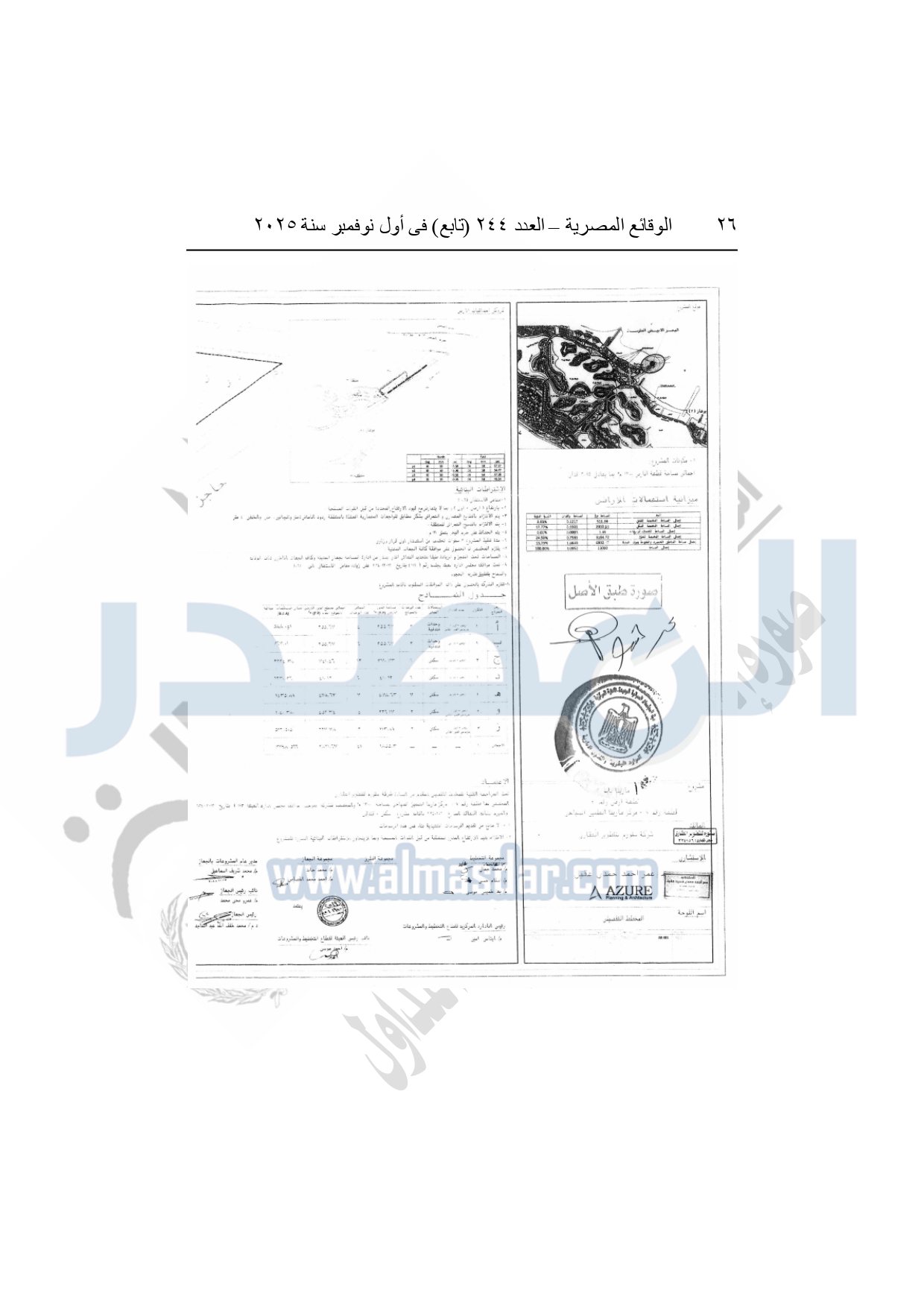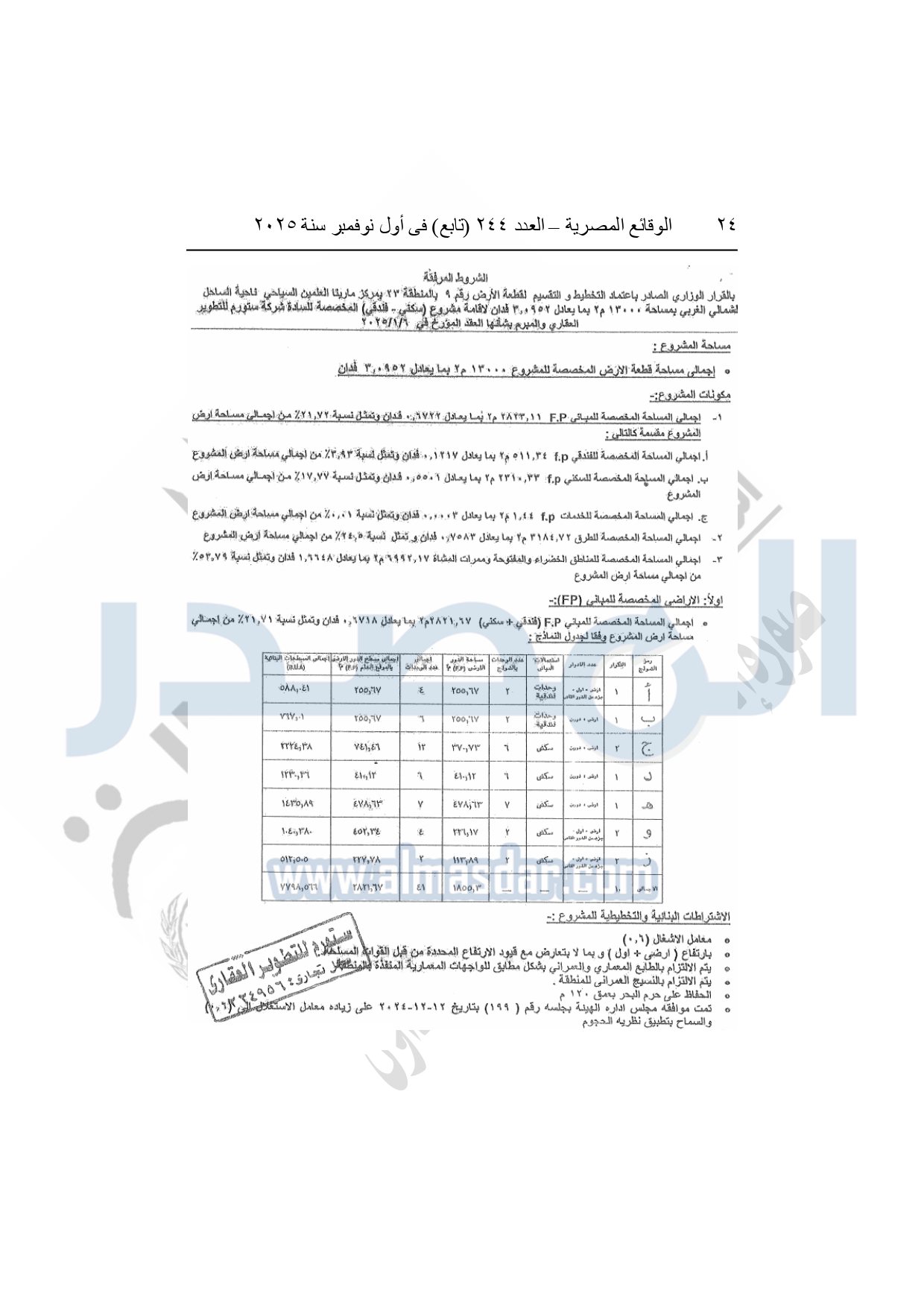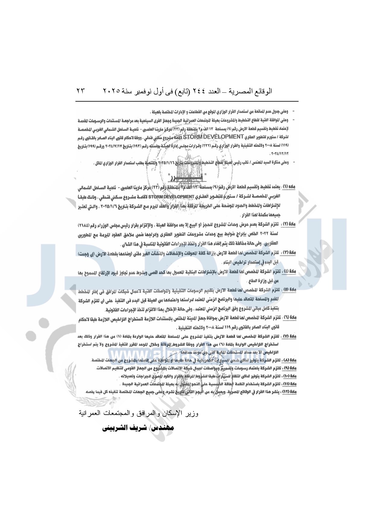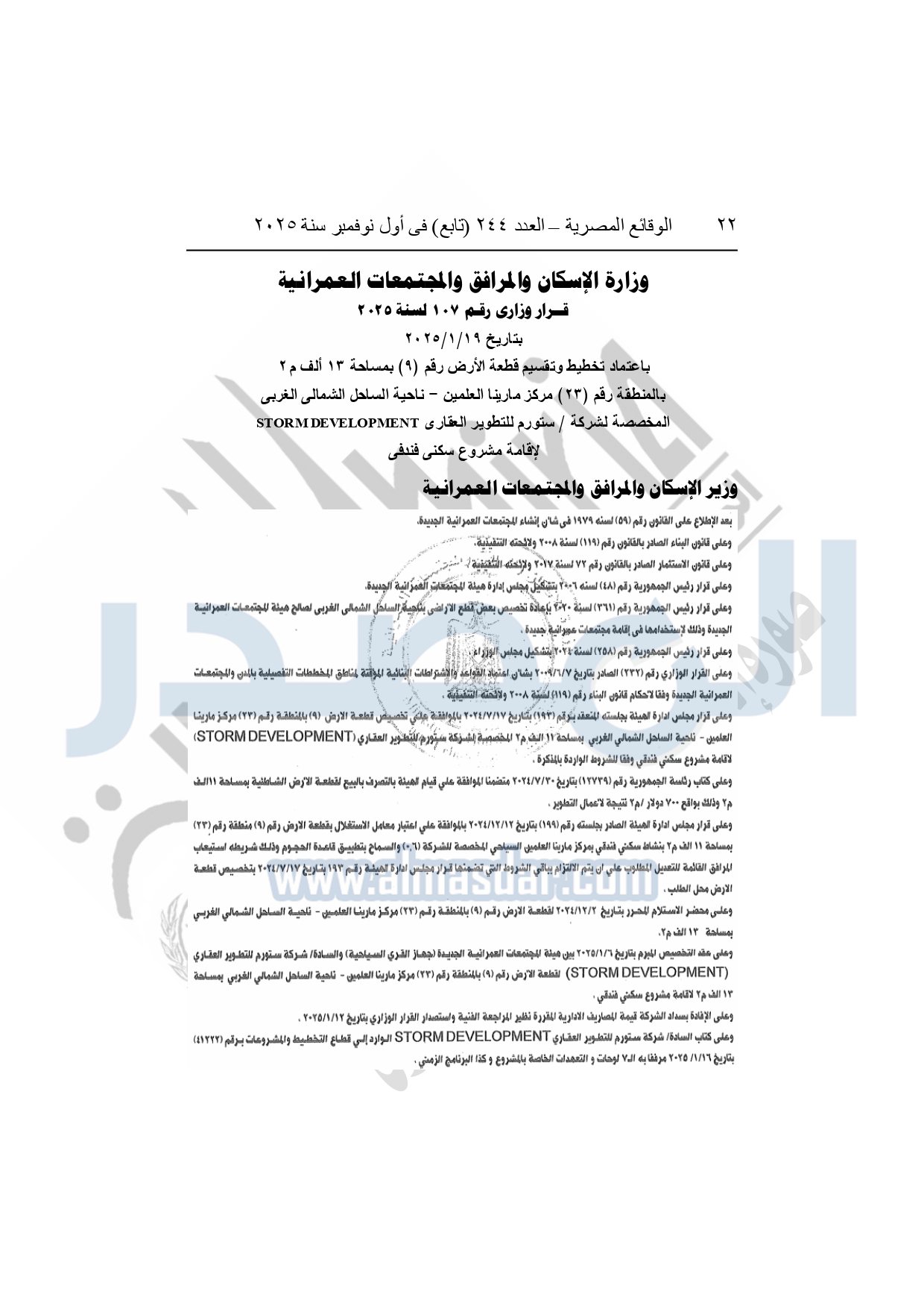 نشرت الوقائع المصرية في العدد 244 "تابع"، الصادر في أول نوفمبر 2025، قرار وزارة الإسكان والمرافق والمجتمعات العمرانية، رقم 107 لسنة 2025، بتاريخ 19-1-2025، بشأن اعتماد تخطيط وتقسيم قطعة الأرض رقم "9" بمساحة 13 ألف م2 بالمنطقة رقم "23" مركز مارينا العلمين - ناحية الساحل الشمالي الغربي المخصصة لشركة ستورم للتطوير العقارى STORM DEVELOPMENT لإقامة مشروع سكنى فندفي.