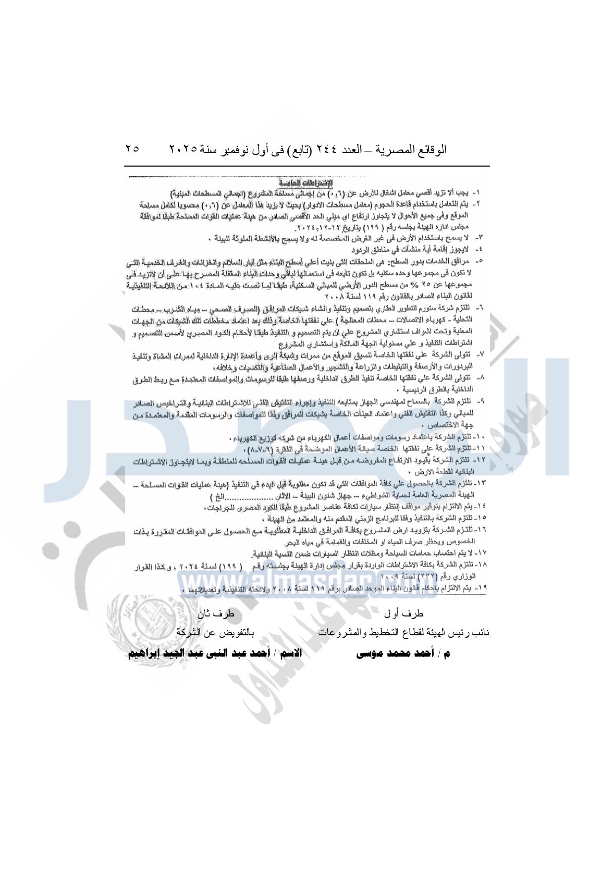 تلتزم الشركة المخصص لها قطعة الأرض بموافاة جهاز المدينة المختص بالمستندات اللازمة لاستخراج التراخيص اللازمة طبقا لأحكام قانون البناء الصادر بالقانون رقم 119 لسنة 2008 ولائحته التنفيذية.