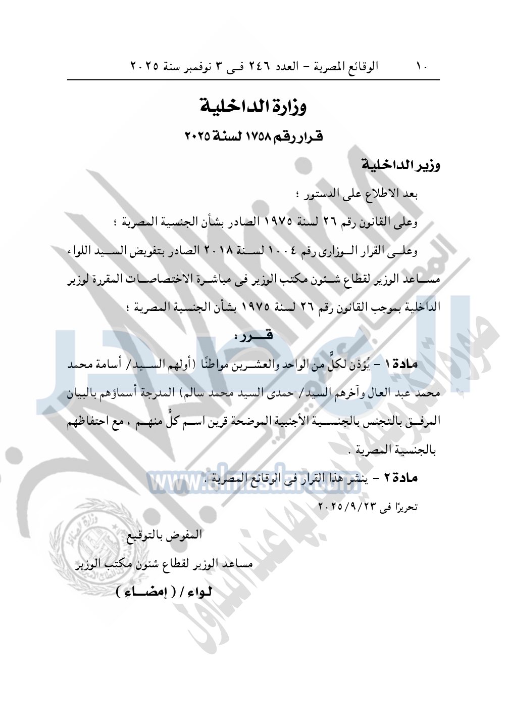 وأيضا نشرت الوقائع المصرية في العدد 246 الصادر في 3 نوفمبر سنة 2025، قرار وزارة الداخلية، رقم 1758 لسنة 2025، بشأن الإذن للواحد والعشرين مواطن بالحصول على الجنسية الأجنبية مع احتفاظهم بالجنسية المصرية.