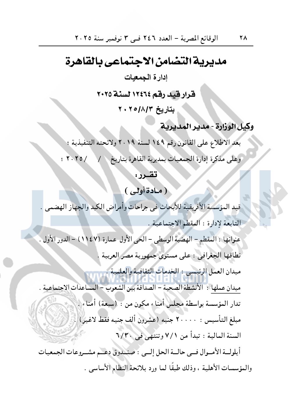 نشرت الوقائع المصرية في العدد 246، بتاريخ 3 نوفمبر 2025، قرار مديرية التضامن الاجتماعي بالقاهرة، قيد رقم 12464 لسنة 2025، بتاريخ 3-8-2025، بشأن قيد المؤسسة الأفريقية للأبحاث في جراحات وأمراض الكبد والجهاز الهضمي.