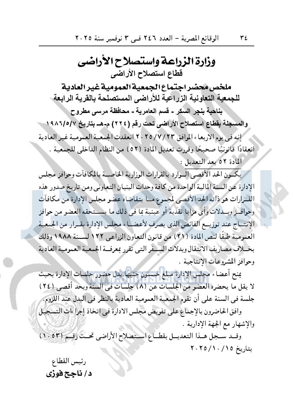 نشرت الوقائع المصرية في العدد 246، بتاريخ 3 نوفمبر 2025، قرار وزارة الزراعة واستصلاح الأراضى، قطاع استصلاح الأراضى، بشأن ملخص محضر اجتماع الجمعية العمومية غير العادية للجمعية التعاونية الزراعية للأراضى المستصلحة بالقرية الرابعة بناحية بنجر السكر - قسم العامرية - محافظة مرسى مطروح والمسجلة بقطاع استصلاح الأراضى تحت رقم "224" م - هـ بتاريخ 7-5-1986.