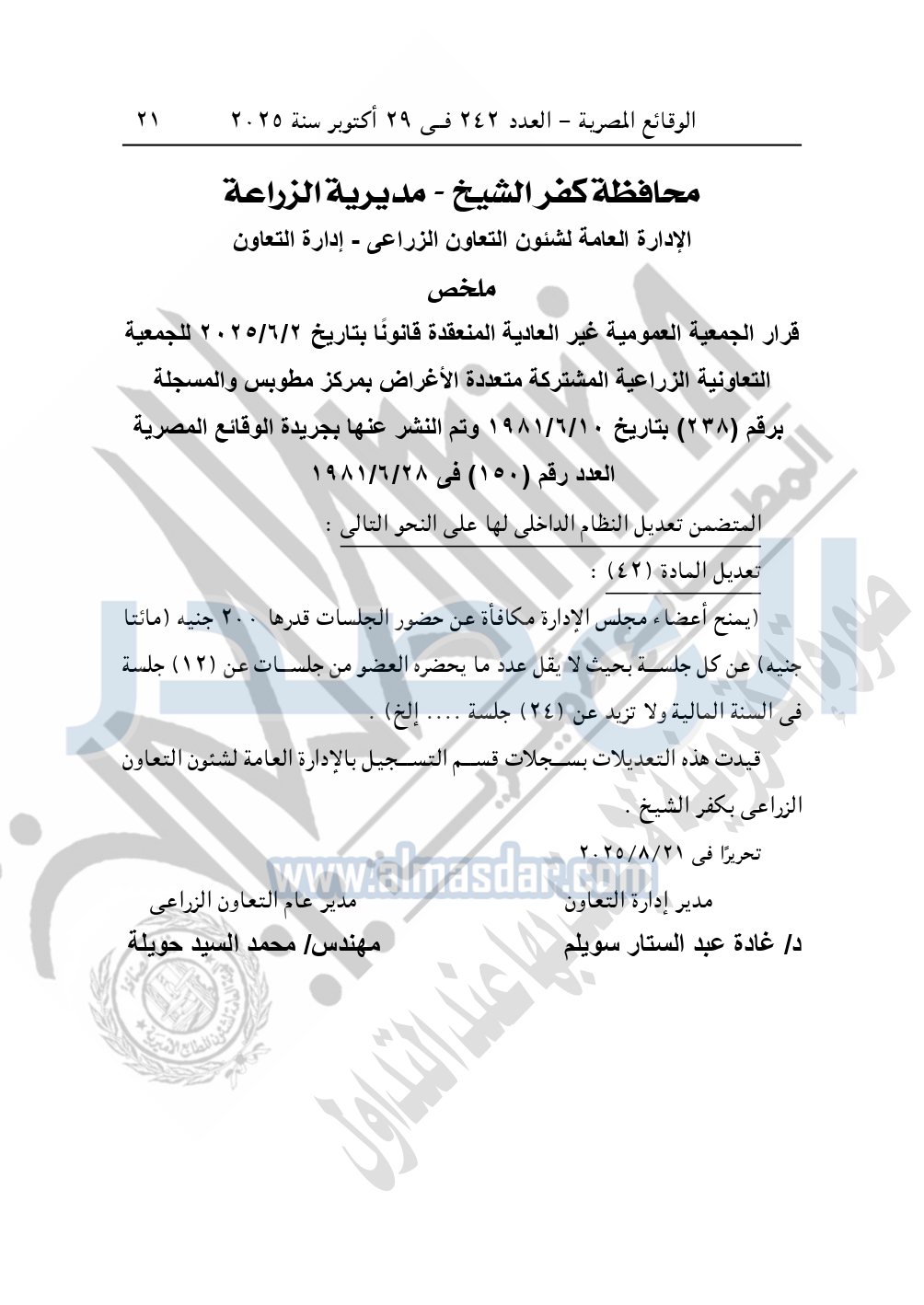 كما نشرت الوقائع المصرية في العدد 242، بتاريخ 29 أكتوبر 2025، قرار مديرية الزراعة بمحافظة كفر الشيخ، الإدارة العامة لشئون التعاون الزراعى - إدارة التعاون، بشأن ملخص قرار الجمعية العمومية غير العادية المنعقدة قانونًا بتاريخ 2-6-2025 للجمعية التعاونية الزراعية المشتركة متعددة الأغراض بمركز مطوبس والمسجلة برقم "238" بتاريخ 10-6-1981 وتم النشر عنها بجريدة الوقائع المصرية العدد رقم "150" في 28-6-1981.