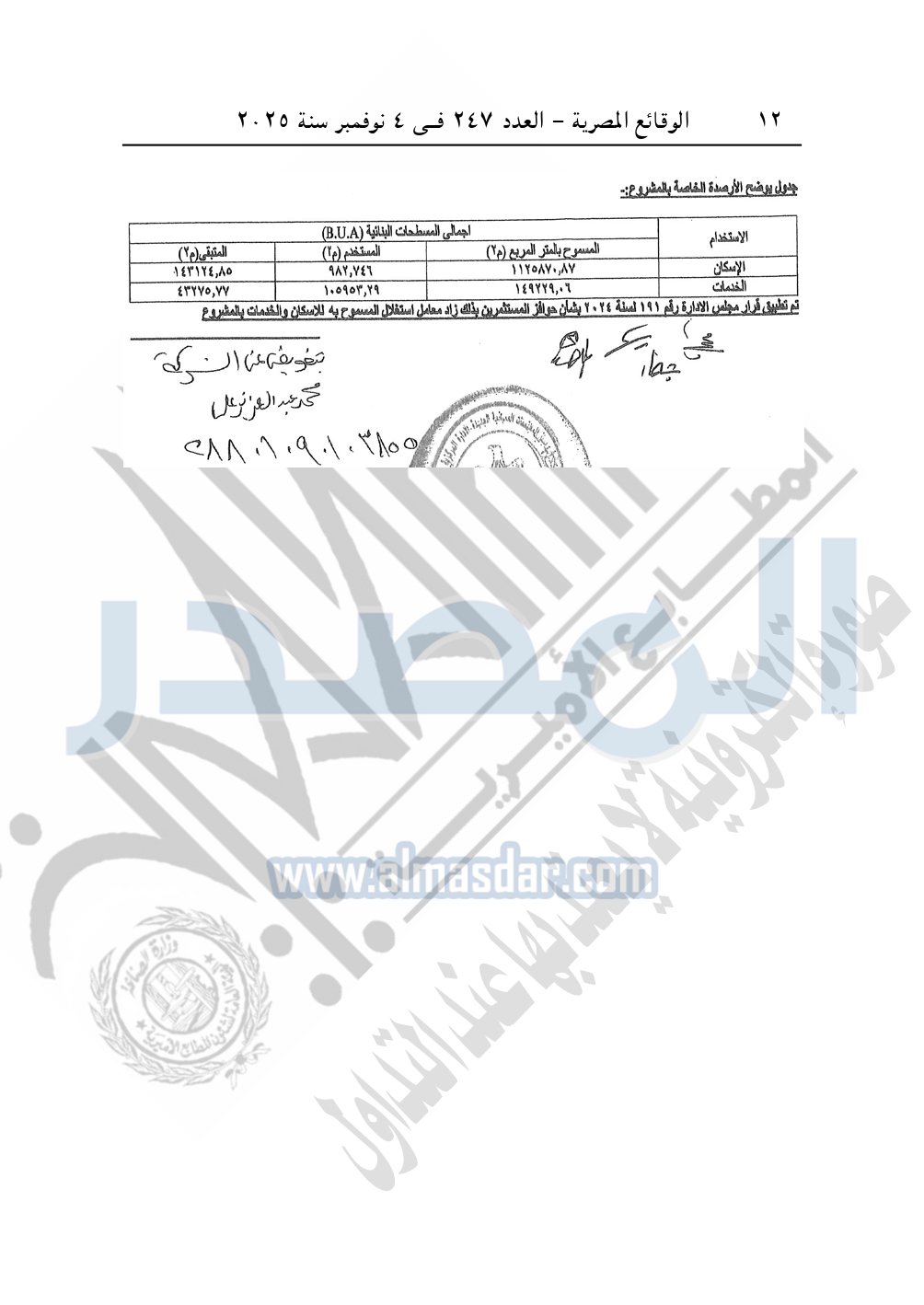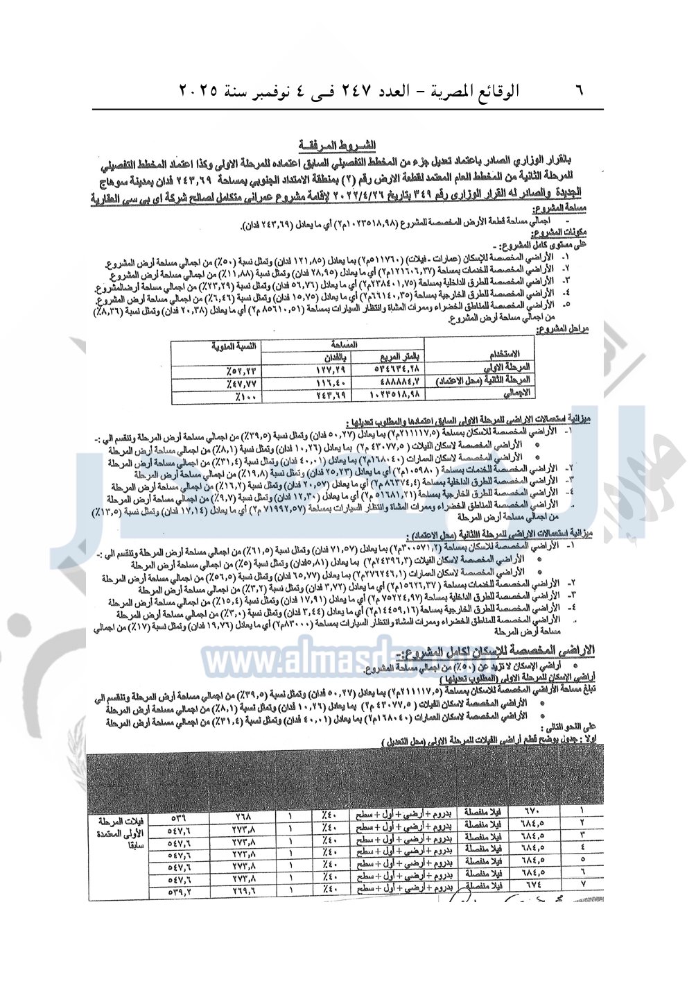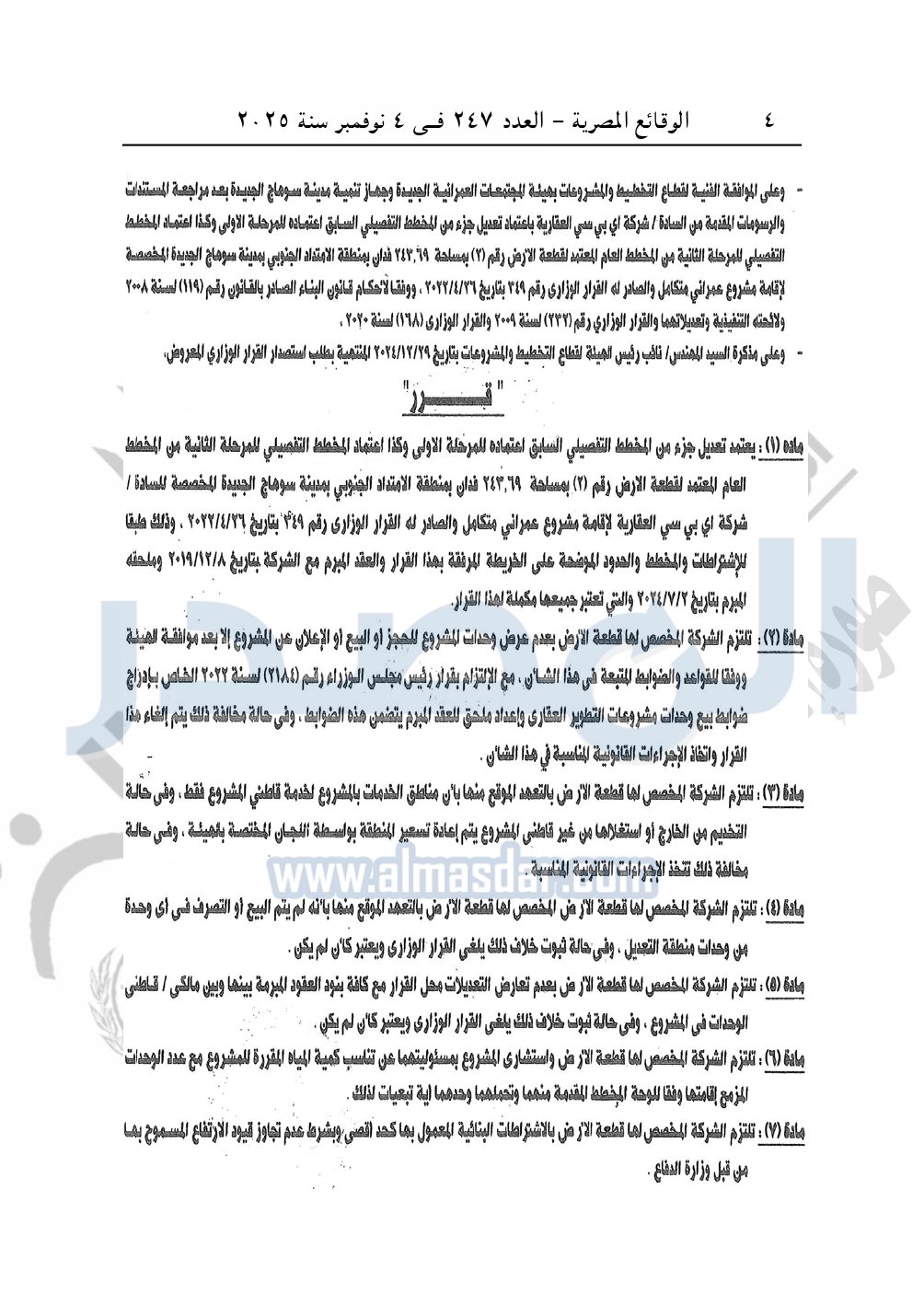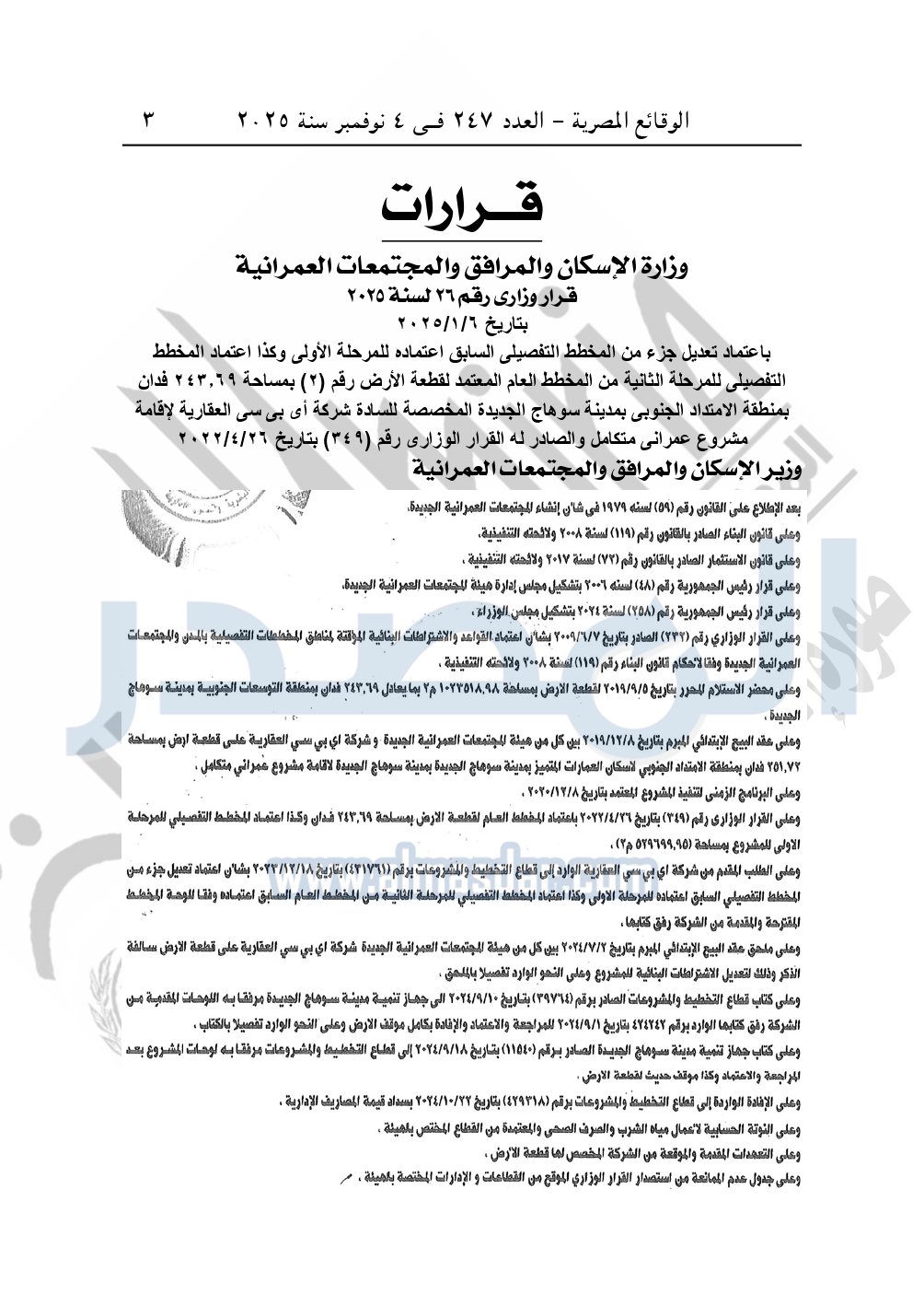 نشرت الوقائع المصرية في العدد 247، بتاريخ 4 نوفمبر 2025، قرار وزارة الإسكان والمرافق والمجتمعات العمرانية، رقم 26 لسنة 2025، بتاريح 6-1-2025، بشأن اعتماد تعديل جزء من المخطط التفصيلي السابق اعتماده للمرحلة الأولى وكذا اعتماد المخطط التفصيلي للمرحلة الثانية من المخطط العام المعتمد لقطعة الأرض رقم "2" بمساحة 243.69 فدان بمنطقة الامتداد الجنوبي بمدينة سوهاج الجديدة المخصصة لـ شركة أي بي سي العقارية لإقامة مشروع عمراني متكامل والصادر له القرار الوزارى رقم "349" بتاريخ 26-4-2022.