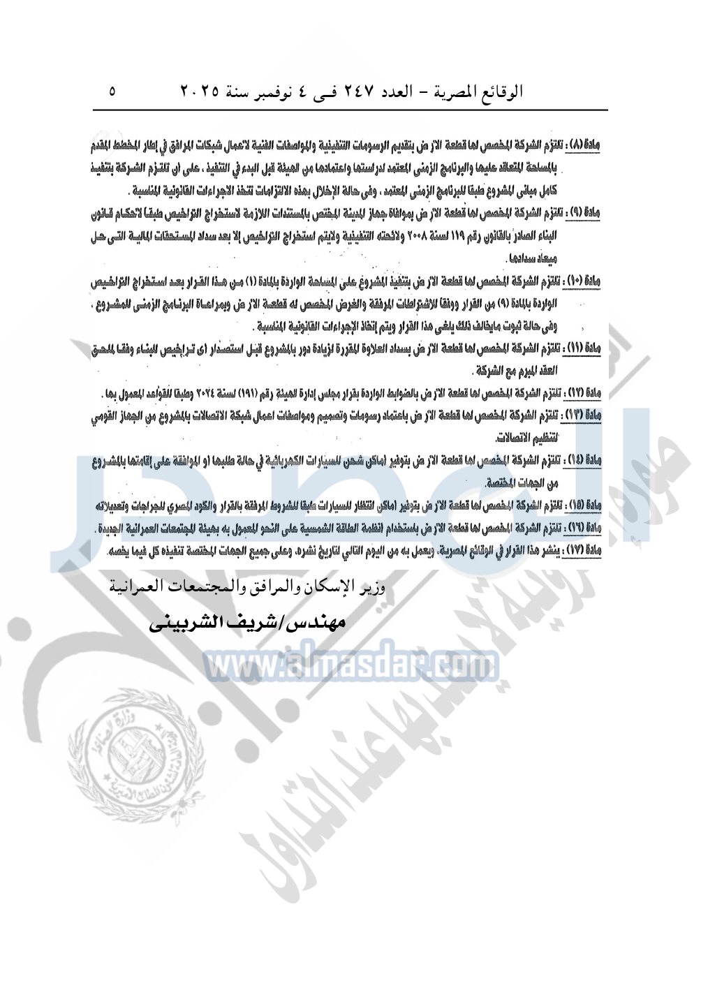 تلتزم الشركة المخصص لها قطعة الأرض بعدم تعارض التعديلات محل القرار مع كافة بنود العقود المبرمة بينها وبين مالكي - قاطنى الوحدات في المشروع، وفي حالة ثبوت خلاف ذلك يلغى القرار الوزارى ويعتبر كان لم يكن.