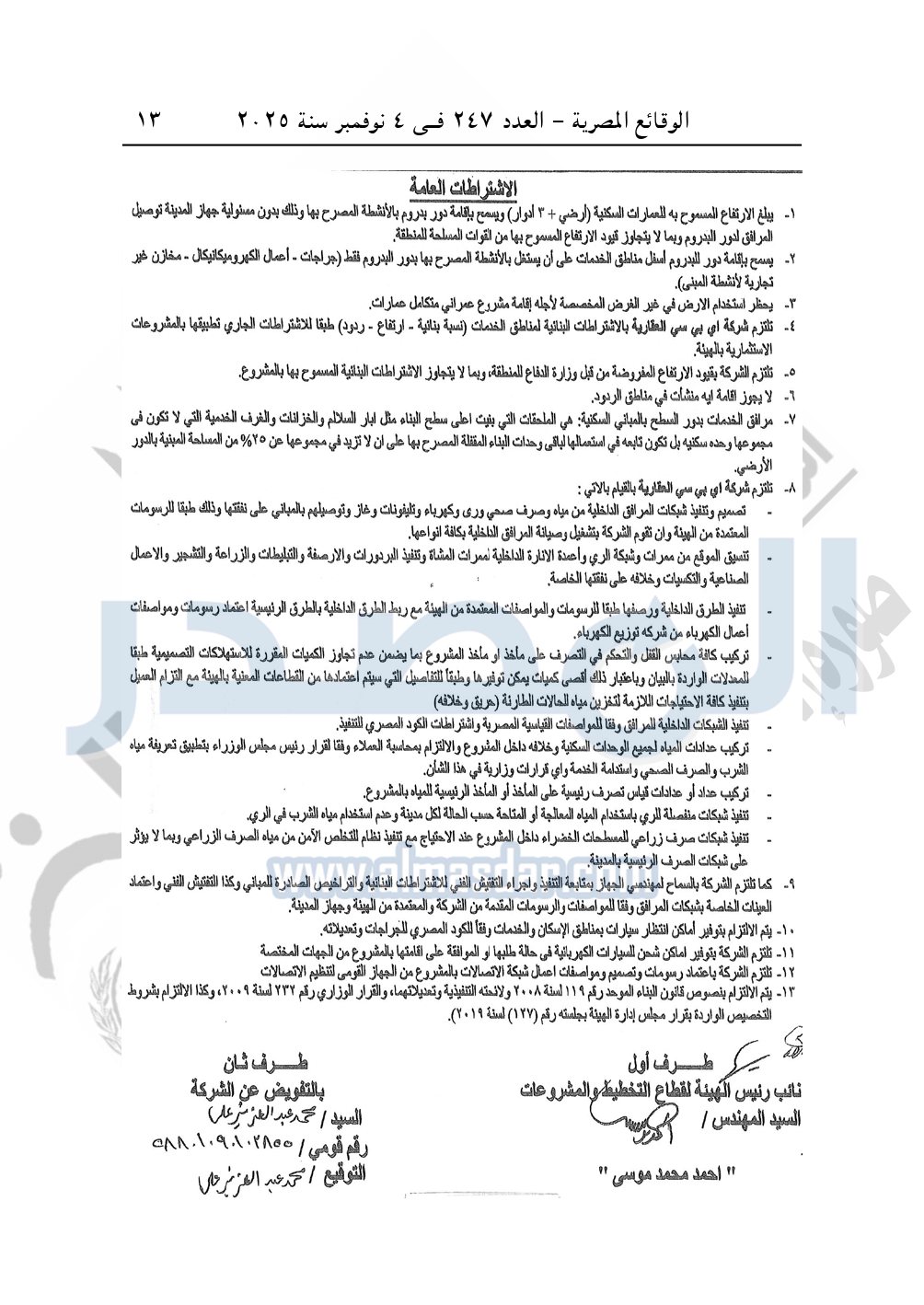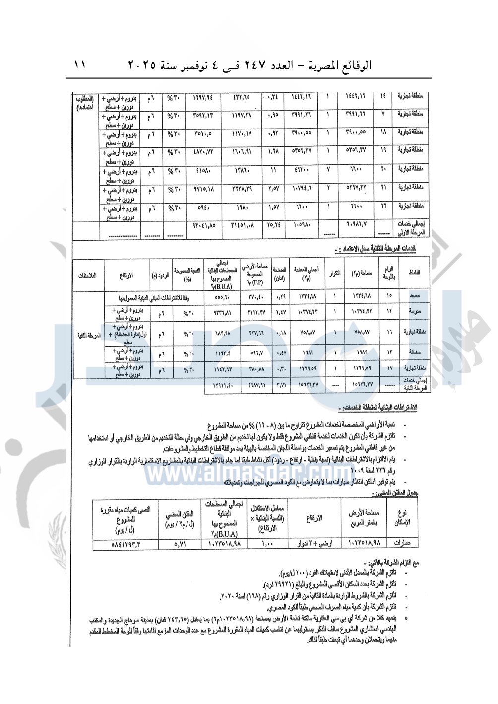 تلتزم الشركة المخصص لها قطعة الأرض واستشارى المشروع بمسئوليتهما عن تناسب كمية المياه المقررة للمشروع مع عدد الوحدات المزمع إقامتها وفقا للوحة المخطط المقدمة منهما وتحملهما وحدهما اية تبعيات لذلك.