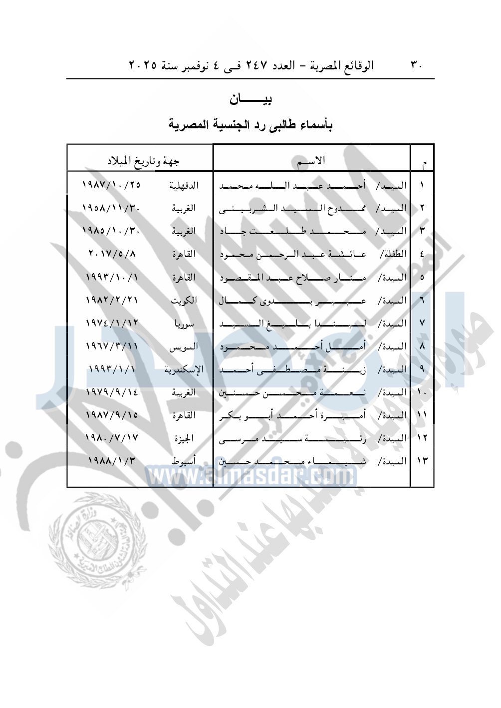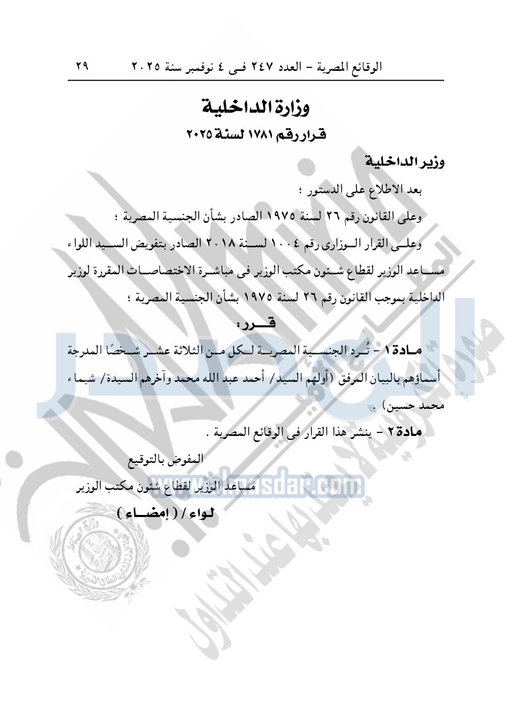 كما نشرت الوقائع المصرية في العدد 247 الصادر في 4 نوفمبر سنة 2025، قرار وزارة الداخلية، رقم 1781 لسنة 2025، بشأن رد الجنسية المصرية لـ13 شخص.