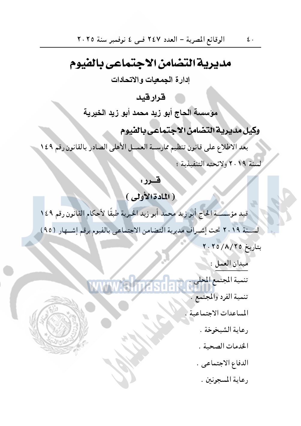 قيد مؤسسة الحاج أبو زيد محمد أبو زيد الخيرية طبقا لأحكام القانون رقم 149 لسنة 2019 تحت غشراف مديرية التضامن الاجتماعي بالفيوم برقم إشهار "95" بتاريخ 25-8-2025.