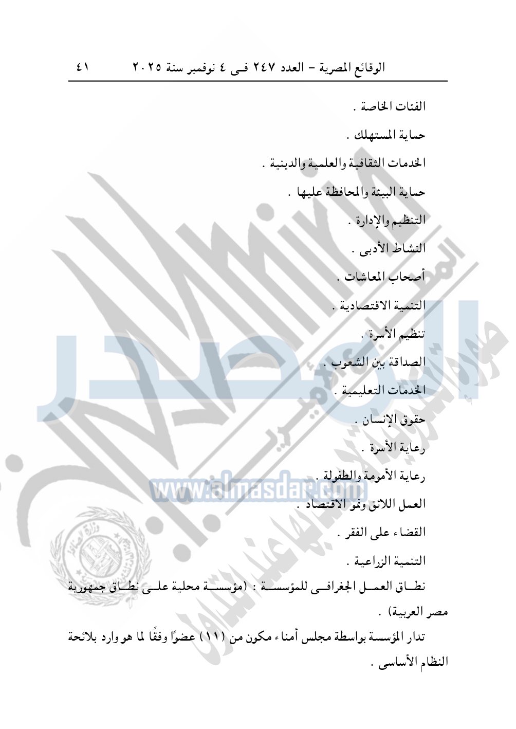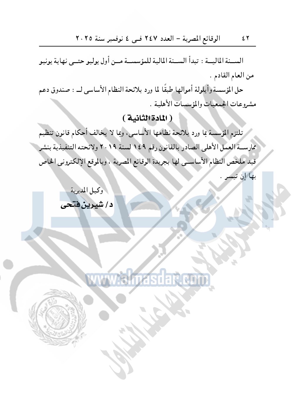 كما نشرت الوقائع المصرية في العدد 247، بتاريخ 4 نوفمبر 2025، قرار مديرية التضامن الاجتماعي بالفيوم، بشأن قيد مؤسسة الحاج أبو زيد محمد أبو زيد الخيرية.
