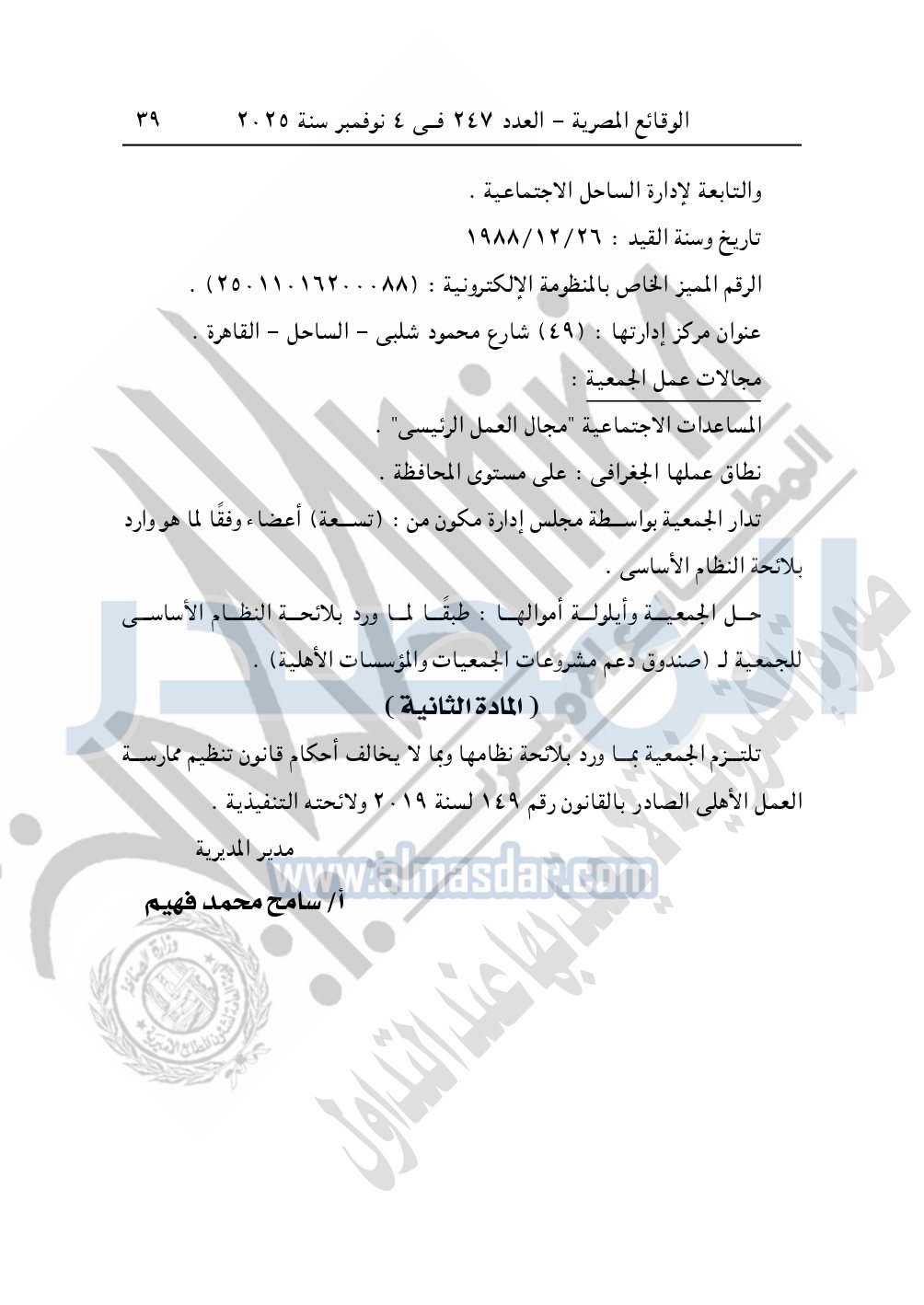 كما نشرت الوقائع المصرية في العدد 247، في 4 نوفمبر 2025، قرار مديرية التضامن الاجتماعي بالقاهرة، بشأن توفيق أوضاع مؤسسة سامي عطية للتنمية، المقيدة برقم "8367"، بتاريخ 8-12-2011.