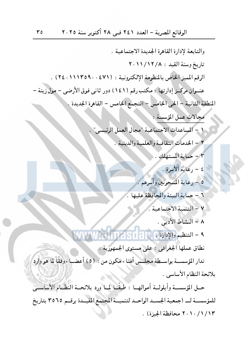 نشرت الوقائع المصرية في العدد 247، في 4 نوفمبر 2025، قرار مديرية التضامن الاجتماعي بالقاهرة، بشأن توفيق أوضاع الجمعية الخيرية لأبناء الصوامعة غرب القاهرة، المقيدة برقم "3603"، بتاريخ 26-12-1988.