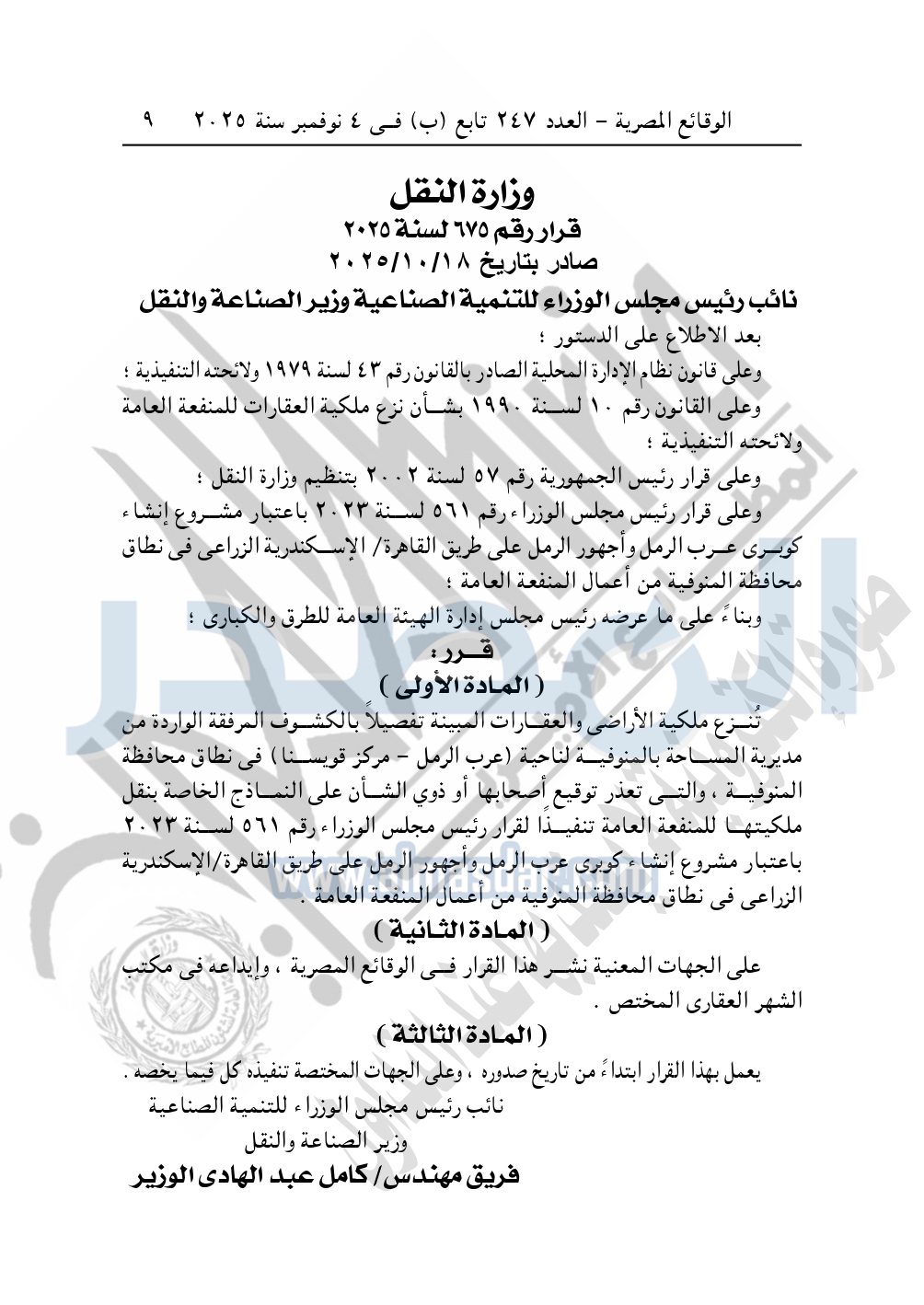 نشرت الوقائع المصرية في العدد 247 تابع "ب"، في 4 نوفمبر 2025، قرار وزارة النقل، رقم 675 لسنة 2025، بتاريخ 18-10-2025، بشأن نزع ملكية بعض الأراضي والعقارات لإقامة مشروع إنشاء كوبرى عرب الرمل وأجهور الرمل على طريق القاهرة - الإسكندرية الزراعي بالمنوفية.