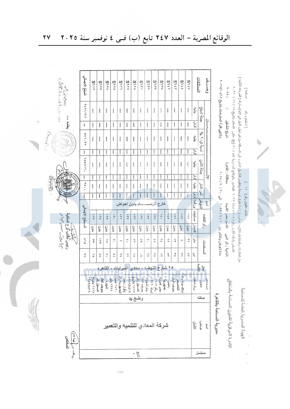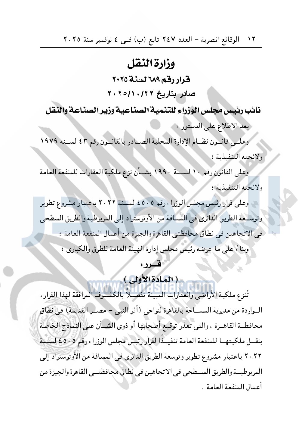 نشرت الوقائع المصرية في العدد 247 تابع "ب"، في 4 نوفمبر 2025، قرار وزارة النقل، رقم 689 لسنة 2025، بتاريخ 22-10-2025، بشأن نزع ملكية بعض الأراضي والعقارات لإقامة مشروع تطوير وتوسعة الطريق الدائرى في محافظتى القاهرة والجيزة.