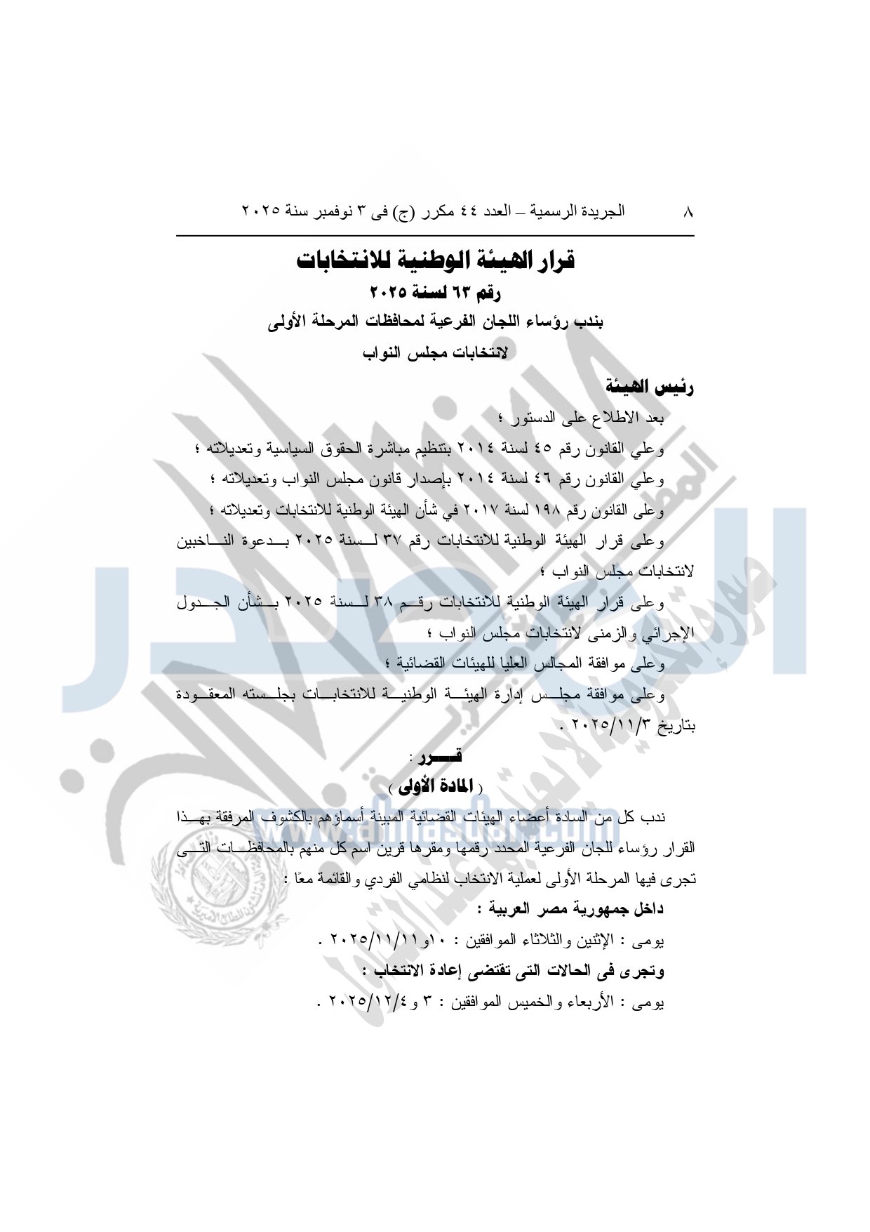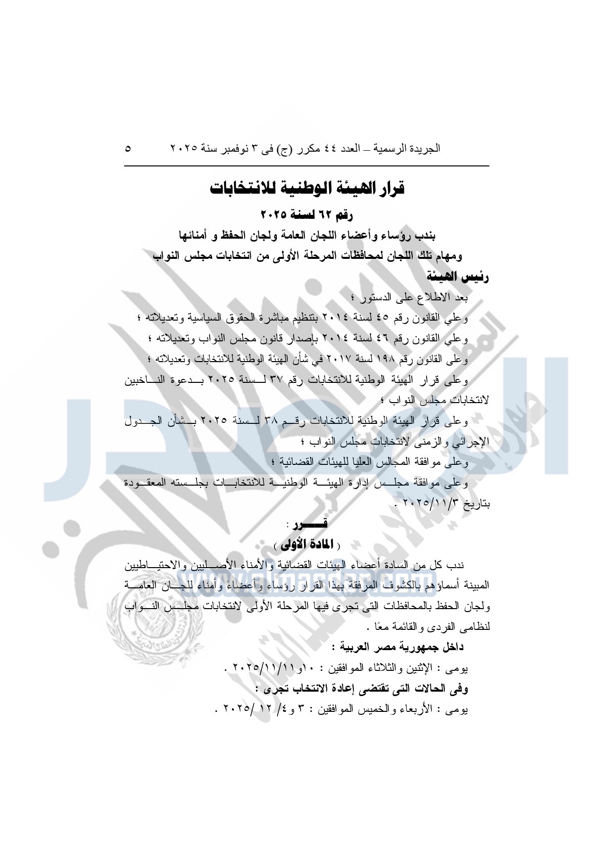 نشرت الجريدة الرسمية في العدد 44 مكرر "ج"، في 3 نوفمبر 2025، قرار الهيئة الوطنية للانتخابات، رقم 62 لسنة 2025، بشأن ندب رؤساء وأعضاء اللجان العامة ولجان الحفظ وأمنائها ومهام تلك اللجان لمحافظات المرحلة الأولى من انتخابات مجلس النواب.