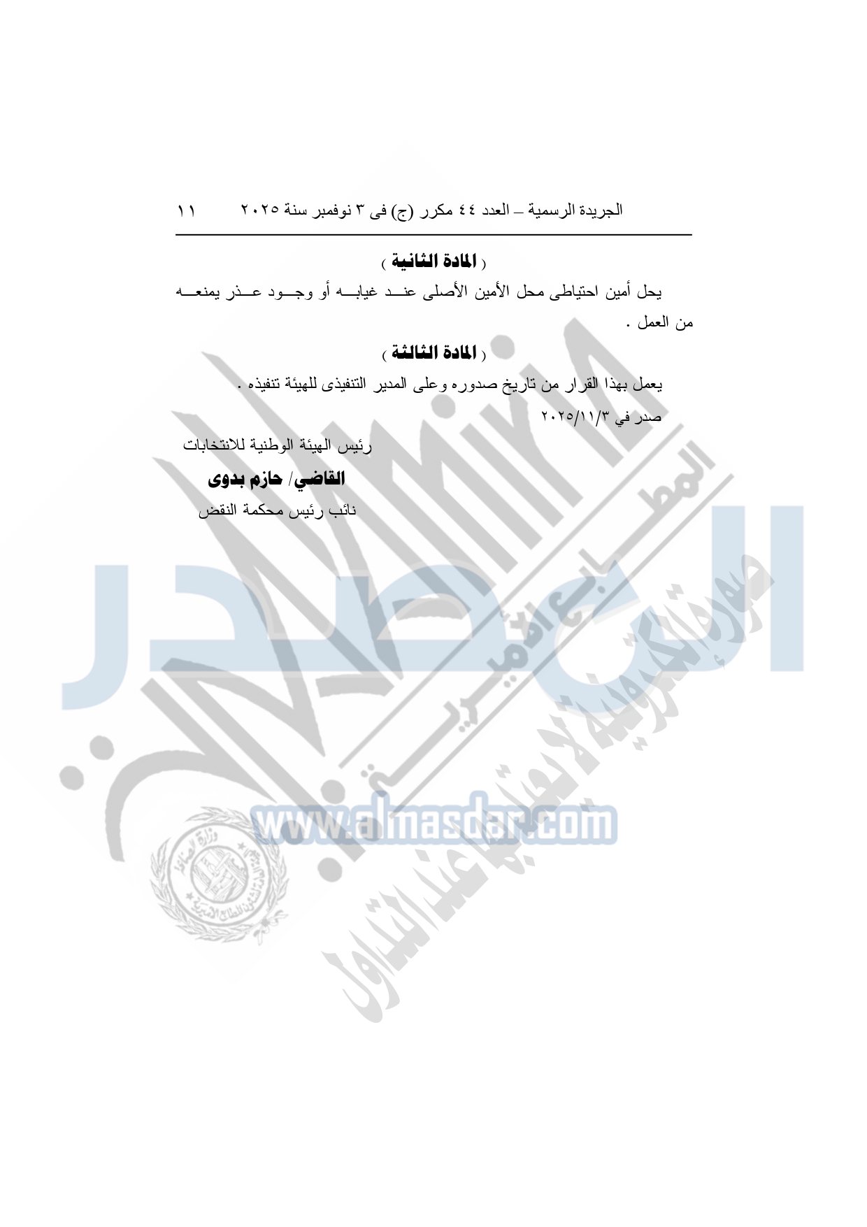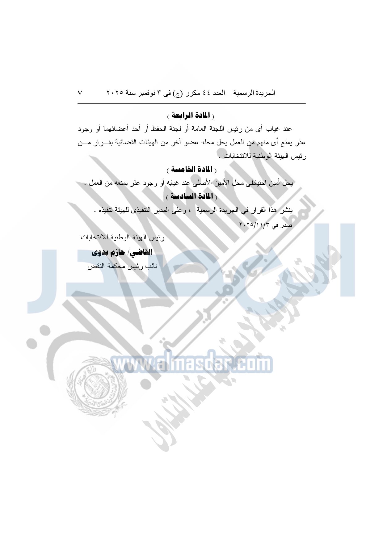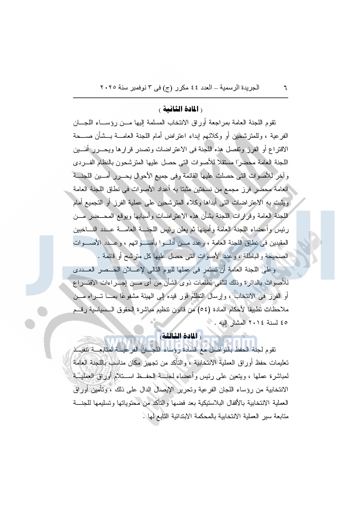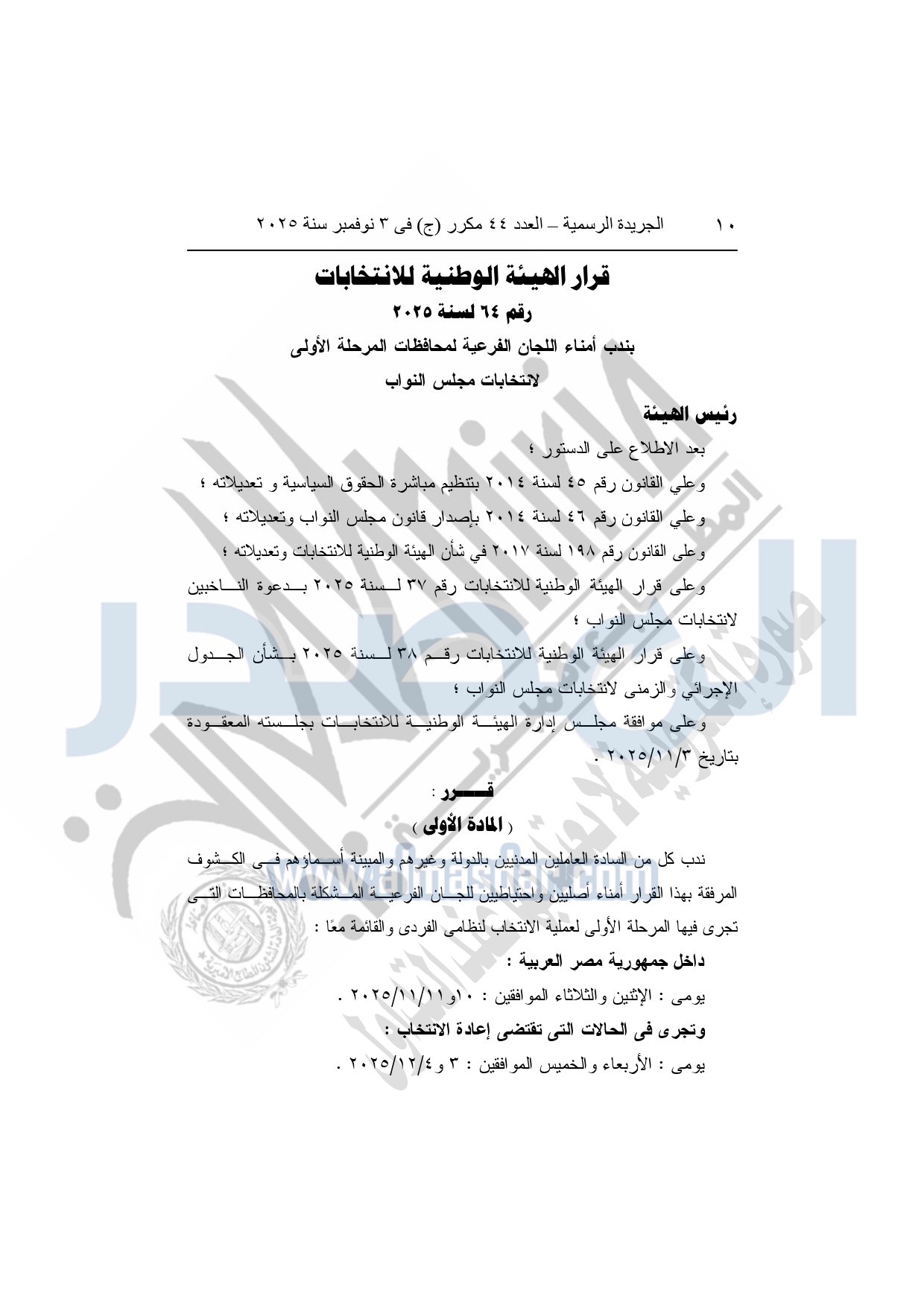 كما نشرت الجريدة الرسمية في العدد 44 مكرر "ج"، في 3 نوفمبر 2025، قرار الهيئة الوطنية للانتخابات، رقم 63 لسنة 2025، بشأن ندب رؤساء اللجان الفرعية لمحافظات المرحلة الأولى لانتخابات مجلس النواب.