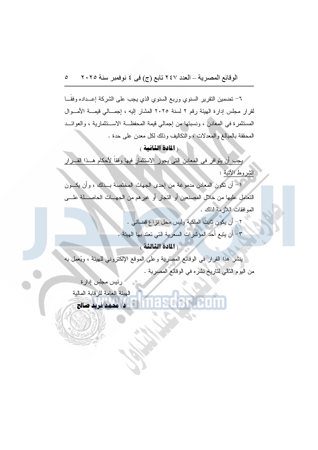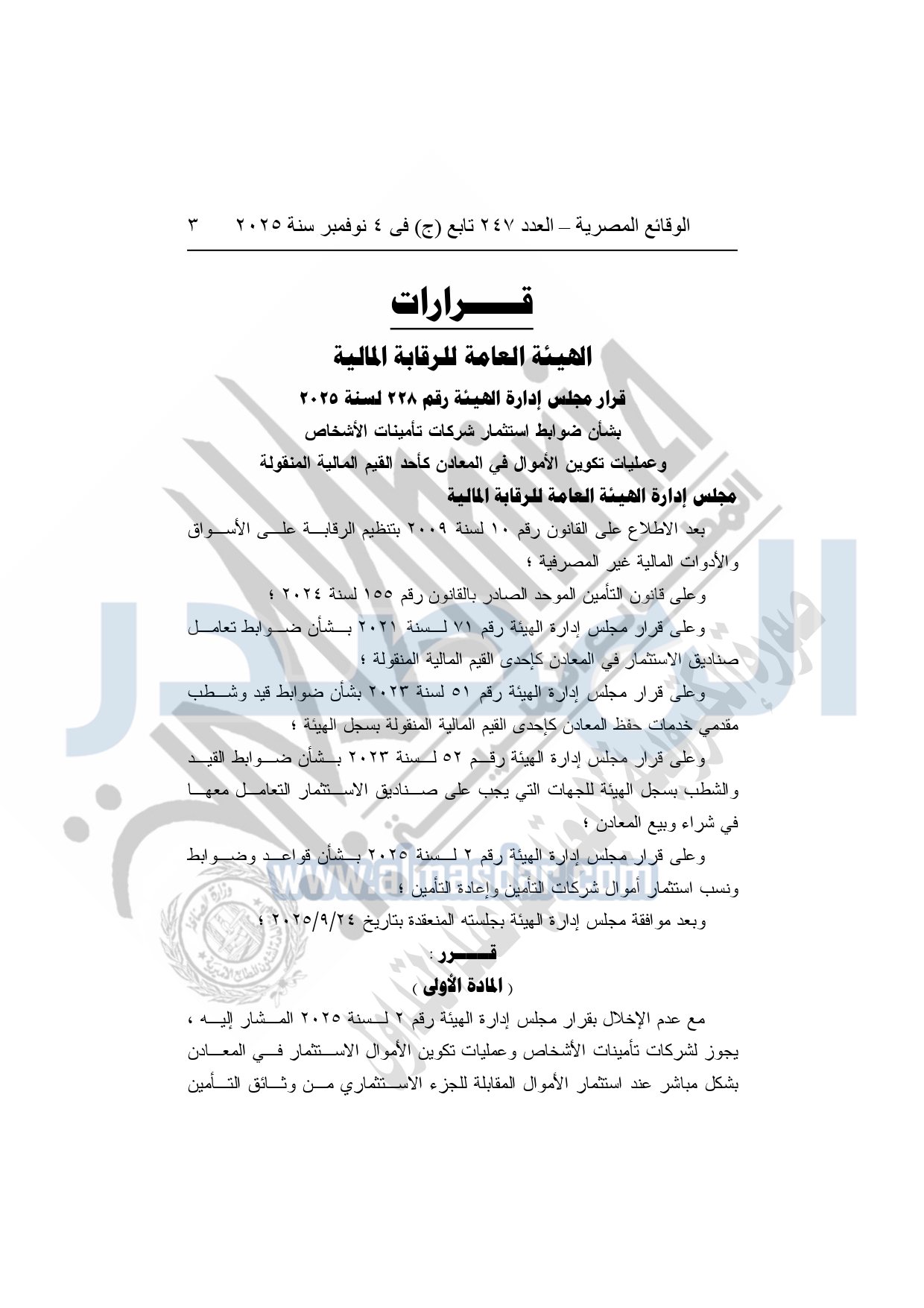 نشرت الوقائع المصرية في العدد 247 تابع "ج" الصادر في 4 نوفمبر سنة 2025، قرارات الهيئة العامة للرقابة المالية قرار مجلس إدارة الهيئة رقم 228 لسنة 2025، بشأن ضوابط استثمار شركات تأمينات الأشخاص وعمليات تكوين الأموال في المعادن كأحد القيم المالية المنقولة.