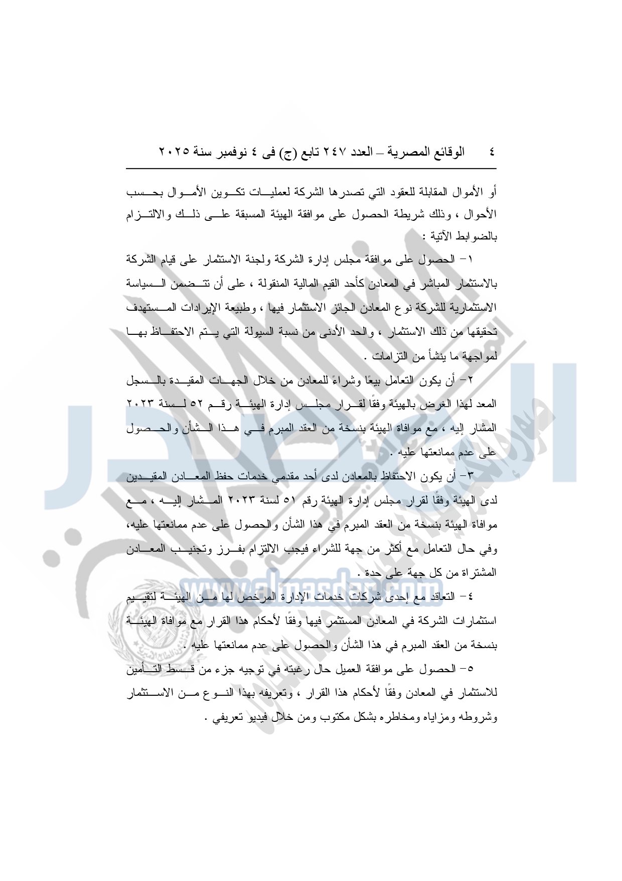 وعلى قرار مجلس إدارة الهيئة رقم 51 لسنة 2023 بشأن ضوابط قيد وشطب مقدمي خدمات حفظ المعادن كإحدى القيم المالية المنقولة بسجل الهيئة؛ وعلى قرار مجلس إدارة الهيئة رقم 52 لسنة 2023 بشأن ضوابط القيد والشطب بسجل الهيئة للجهات التي يجب على صناديق الاستثمار التعامل معها في شراء وبيع المعادن؛ وعلى قرار مجلس إدارة الهيئة رقم 2 لسنة 2025 بشأن قواعد وضوابط ونسب استثمار أموال شركات التأمين وإعادة التأمين؛ وبعد موافقة مجلس إدارة الهيئة بجلسته المنعقدة بتاريخ 24-9-2025.