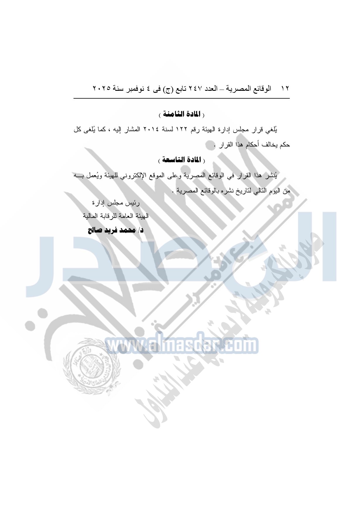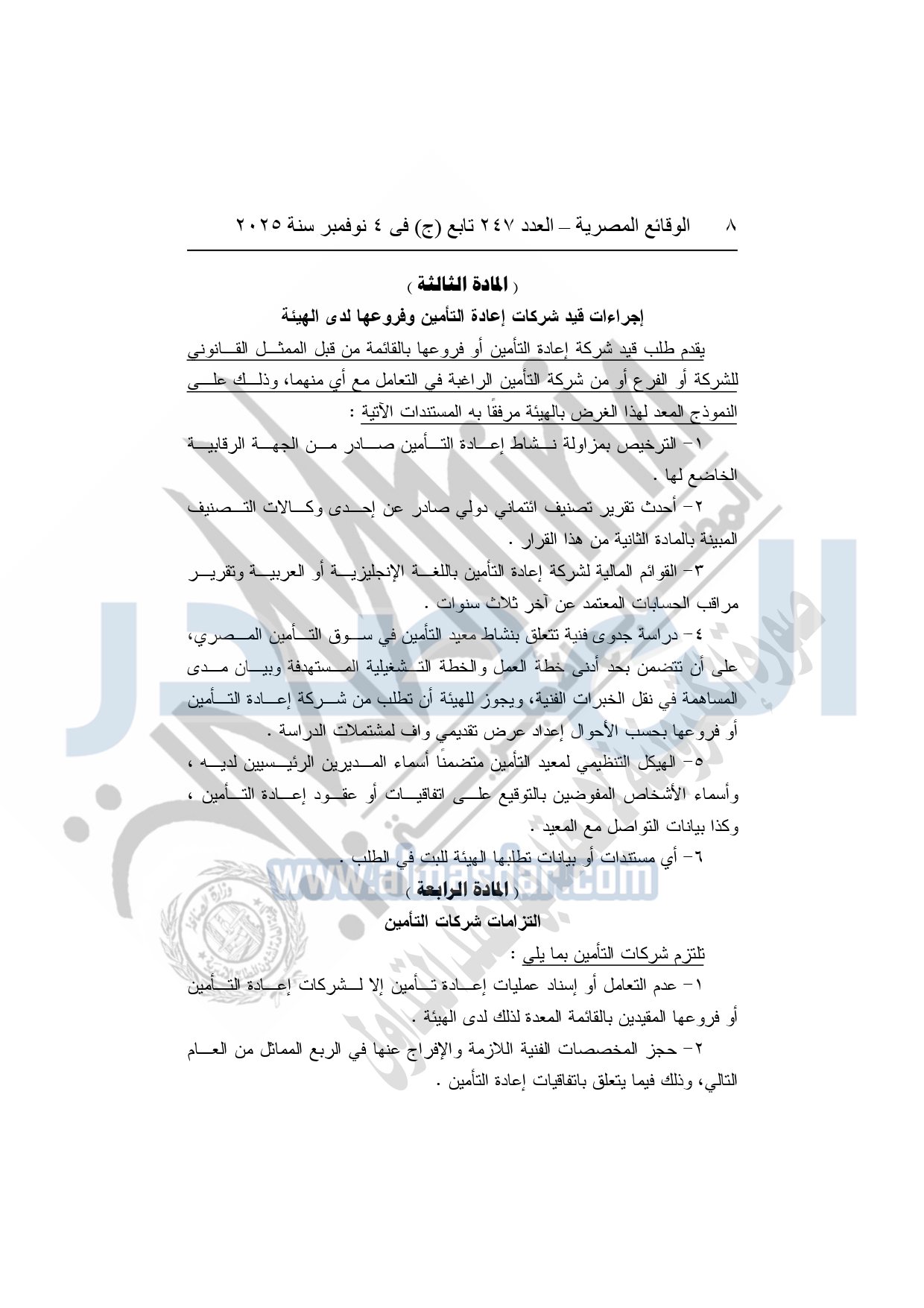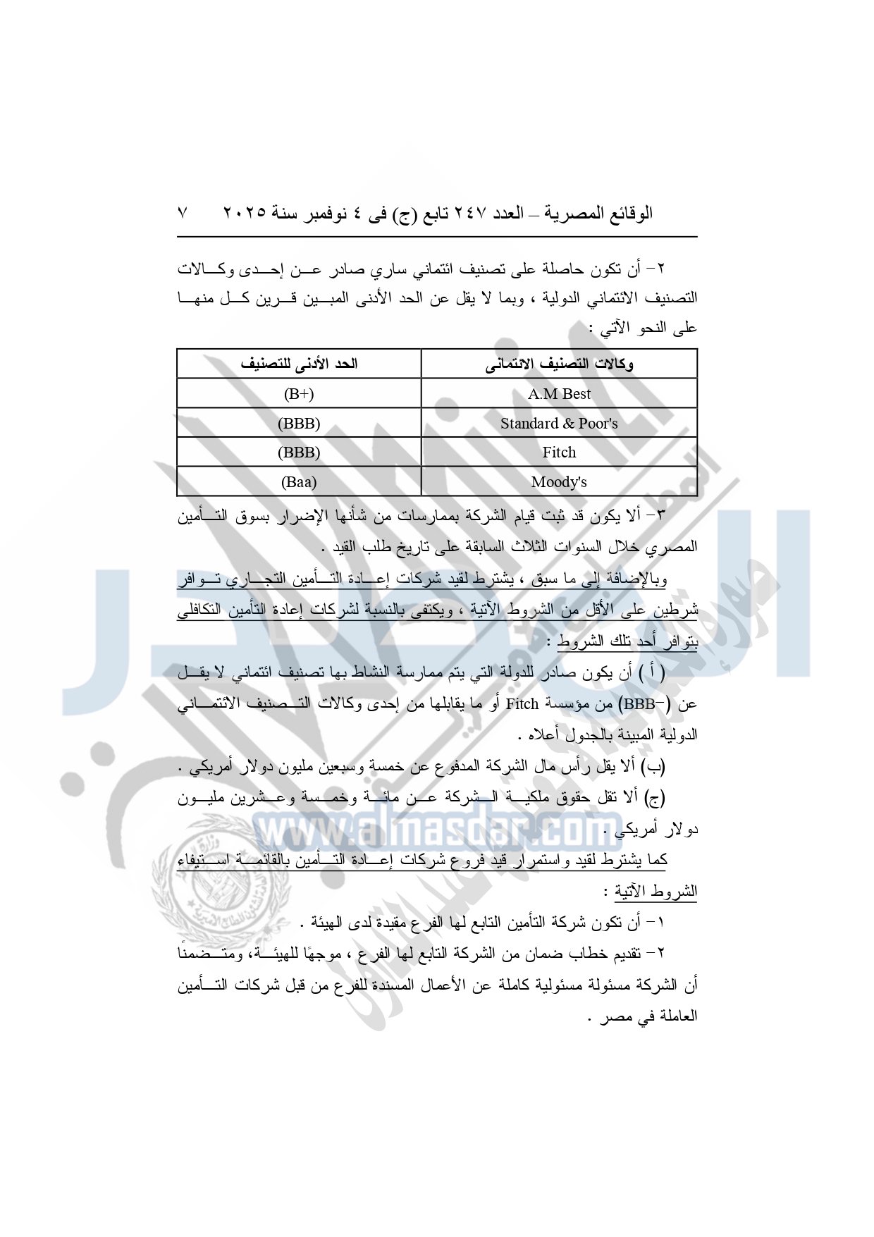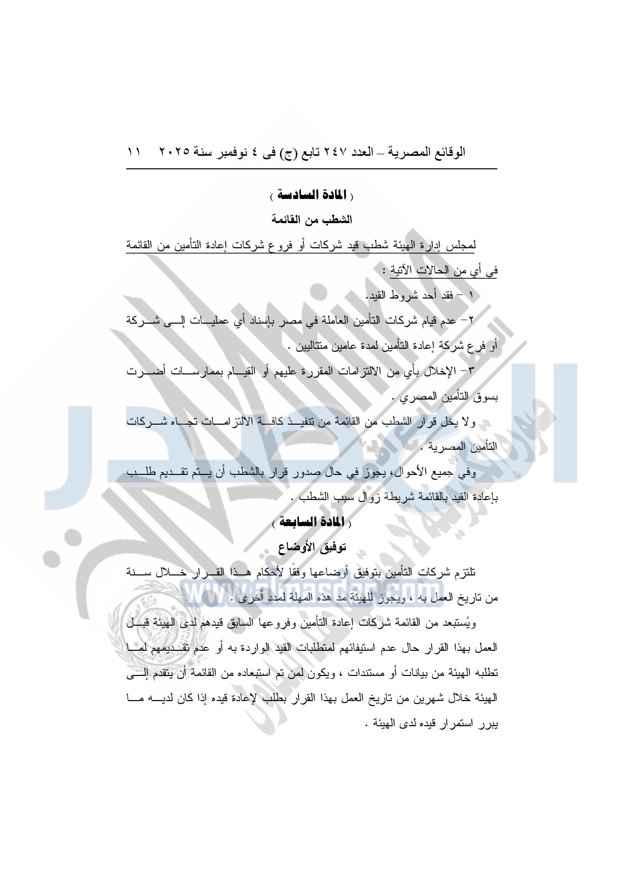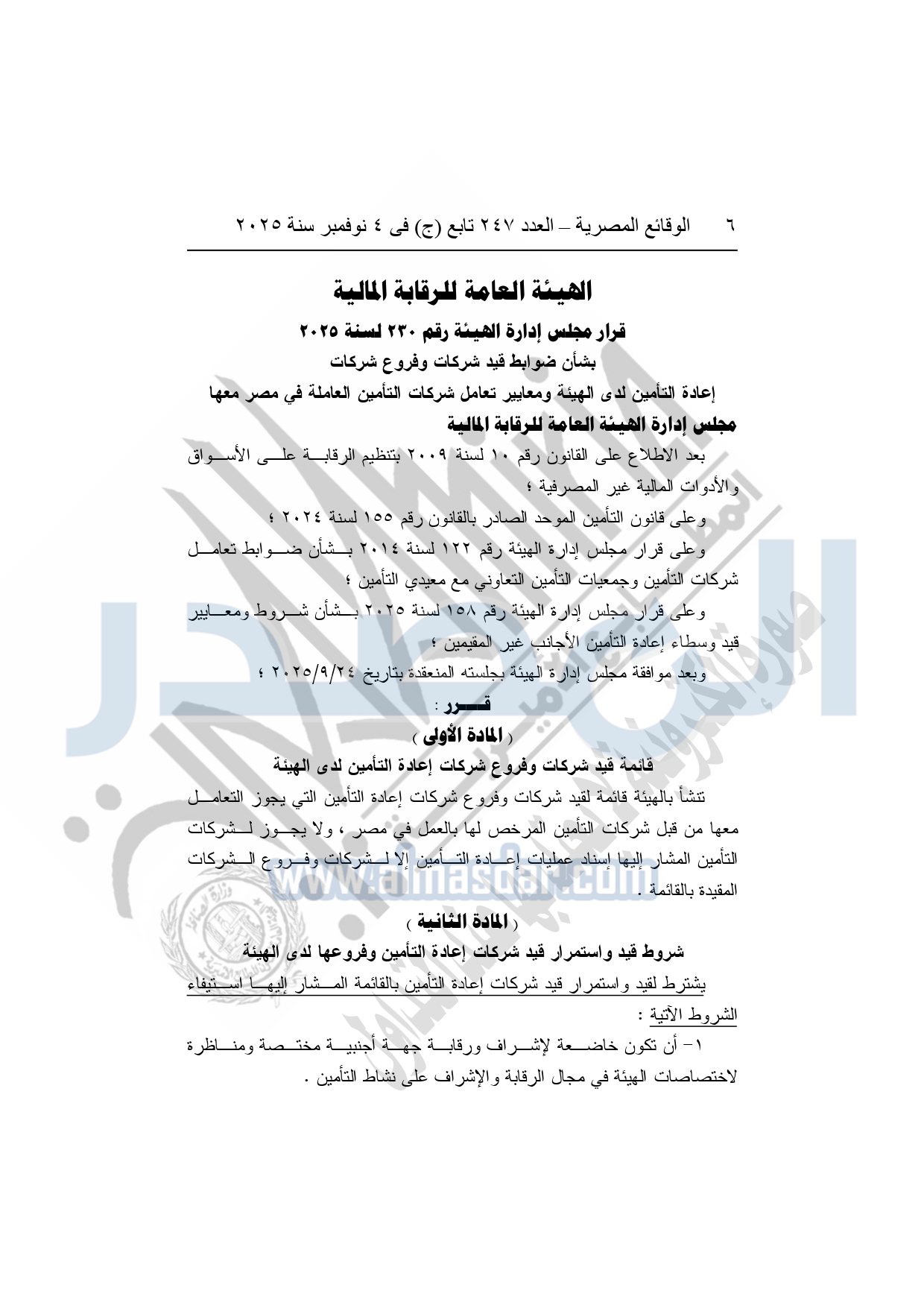 نشرت الوقائع المصرية في العدد 247 تابع "ج" الصادر في 4 نوفمبر سنة 2025، الهيئة العامة للرقابة المالية قرار مجلس إدارة الهيئة رقم 230 لسنة 2025، بشأن ضوابط قيد شركات وفروع شركات إعادة التأمين لدى الهيئة ومعايير تعامل شركات التأمين العاملة في مصر معها.