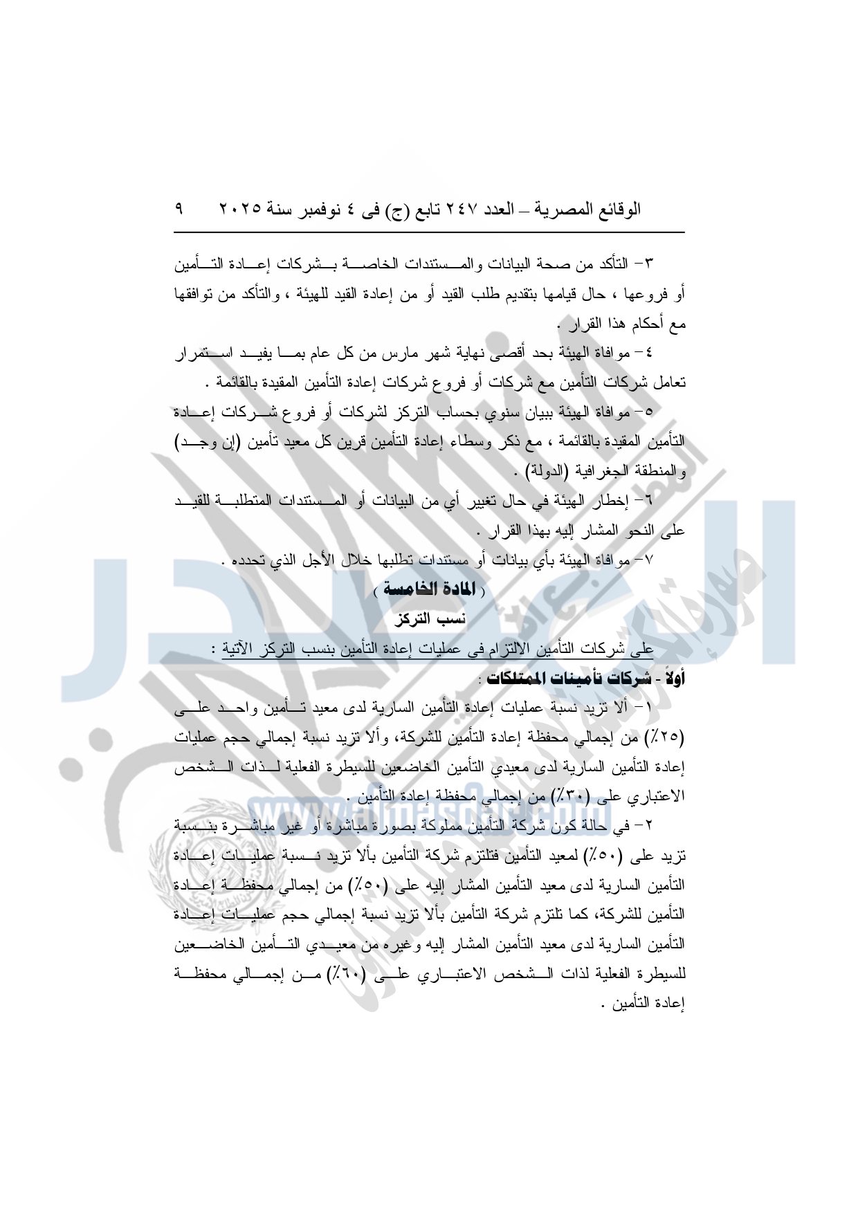 تنشأ بالهيئة قائمة لقيد شركات وفروع شركات إعادة التأمين التي يجوز التعامل معها من قبل شركات التأمين المرخص لها بالعمل في مصر، ولا يجوز لشركات التأمين المشار إليها إسناد عمليات التأمين إلا لشركات وفروع الشركات المقيدة بالقائمة.
