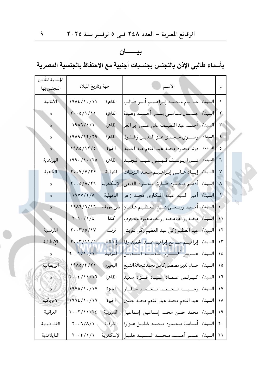 ونشرت الوقائع المصرية في العدد 248 الصادر في 5 نوفمبر سنة 2025، قرار وزارة الداخلية، رقم 1792 لسنة 2025، بشأن الإذن للواحد والعشرين مواطن بالحصول على الجنسية الأجنبية مع احتفاظهم بالجنسية المصرية.