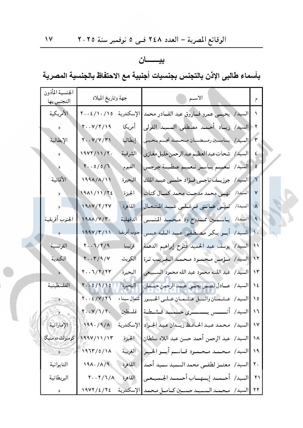كما نشرت الوقائع المصرية في العدد 248 الصادر في 5 نوفمبر سنة 2025، قرار وزارة الداخلية، رقم 1798 لسنة 2025، بشأن الإذن للإثنين والعشرين مواطن بالحصول على الجنسية الأجنبية مع احتفاظهم بالجنسية المصرية.