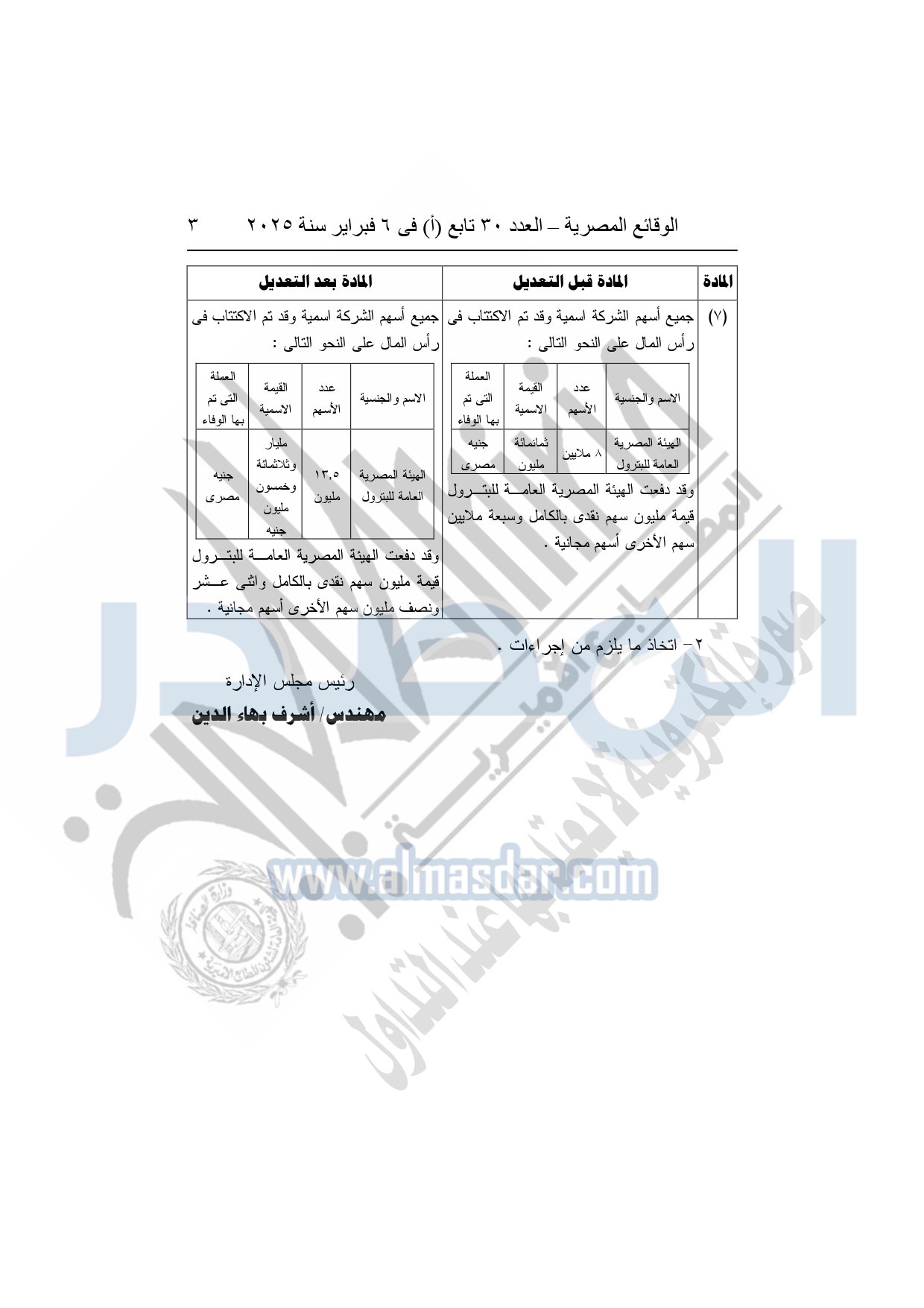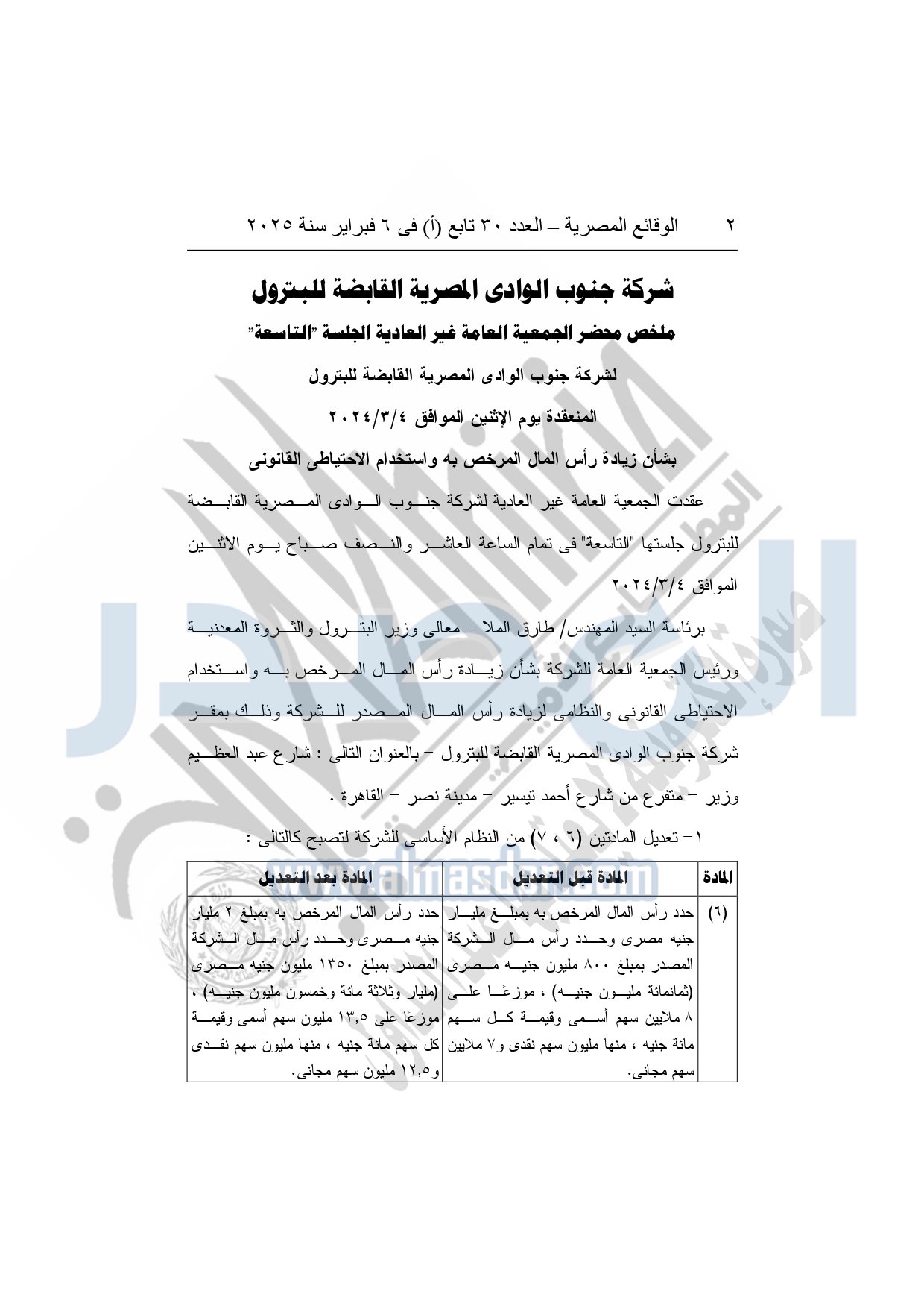 نشرت الوقائع المصرية في العدد 30 تابع "أ" الصادر في 6 فبراير سنة 2025، قرار شركة جنوب الوادى المصرية القابضة للبترول، ملخص محضر الجمعية العامة غير العادية الجلسة "التاسعة" لشركة جنوب الوادى المصرية القابضة للبترول، المنعقدة يوم الإثنين الموافق 4-3-2024، بشأن زيادة رأس المال المرخص به واستخدام الاحتياطي القانوني.
