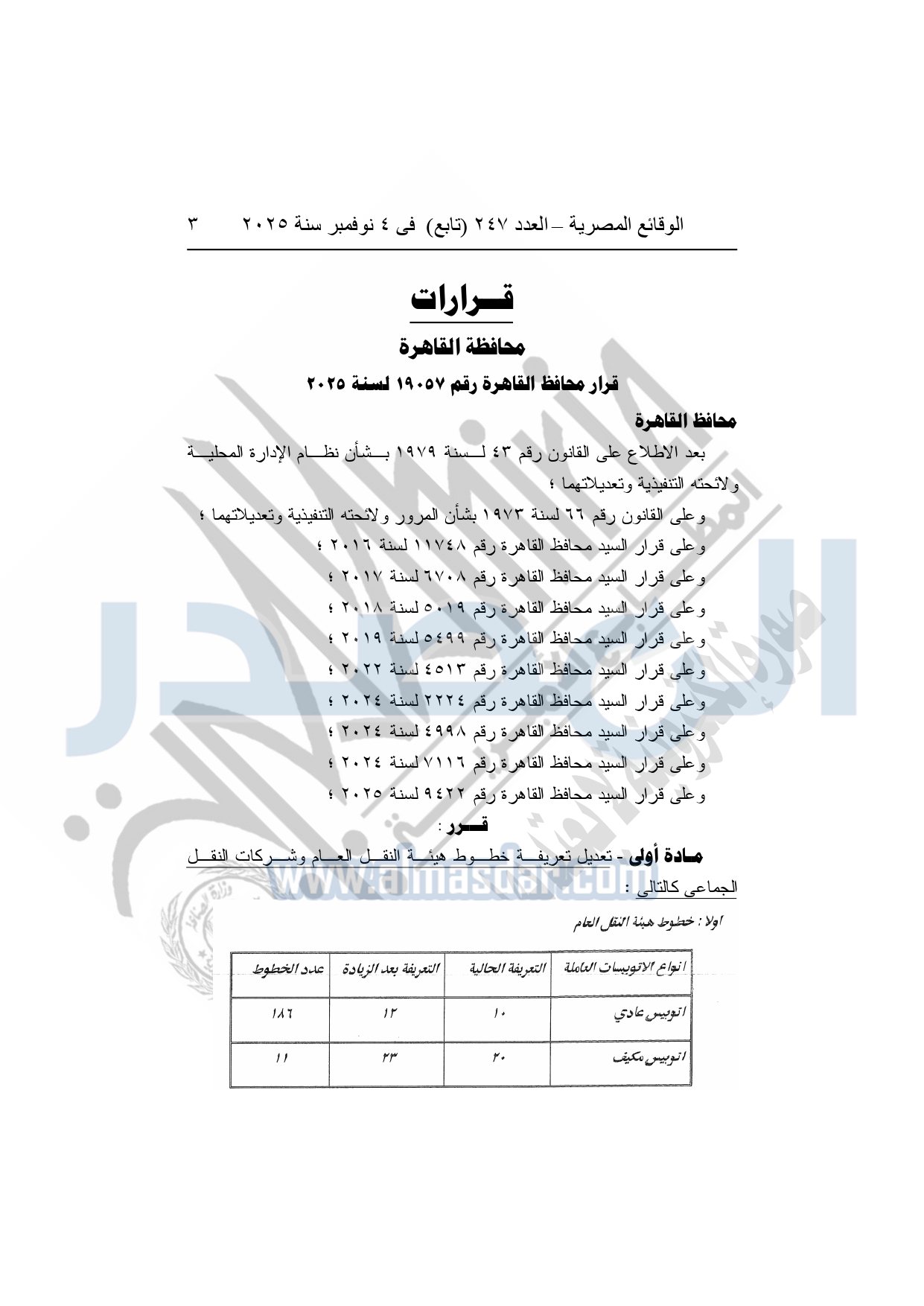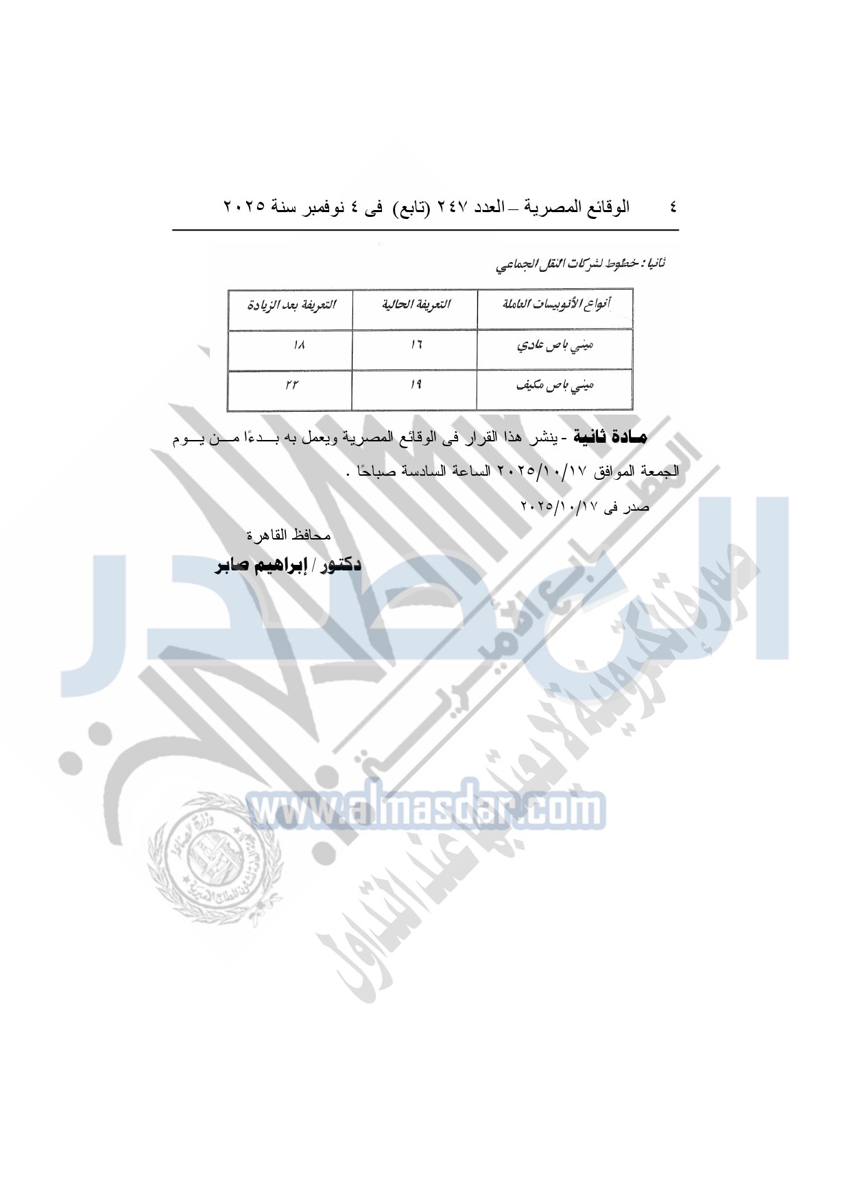 نشرت الوقائع المصرية في العدد 247 "تابع" الصادر في 4 نوفمبر سنة 2025، قرار محافظة القاهرة، رقم 19057 لسنة 2025، بشأن تعديل تعريفة خطوط هيئة النقل العام وشركات النقل الجماعي.