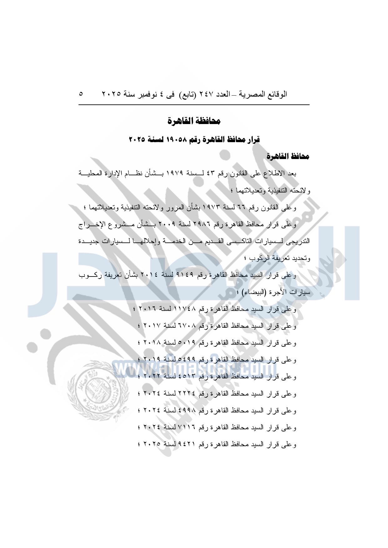وأضافت الوقائع المصرية، أن القرار جاء بعد الاطلاع أيضا على قرار محافظ القاهرة رقم 11748 لسنة 2016؛ وعلى قرار محافظ القاهرة رقم 6708 لسنة 2017؛ وعلى قرار محافظ القاهرة رقم 5019 لسنة 2018؛ وعلى قرار محافظ القاهرة رقم 5499 لسنة 2019؛ وعلى قرار محافظ القاهرة رقم 4513 لسنة 2022؛ وعلى قرار محافظ القاهرة رقم 2224 لسنة 2024؛ وعلى قرار محافظ القاهرة رقم 4998 لسنة 2024؛ وعلى قرار محافظ القاهرة رقم 7116 لسنة 2024؛ وعلى قرار محافظ القاهرة رقم 9421 لسنة 2025.