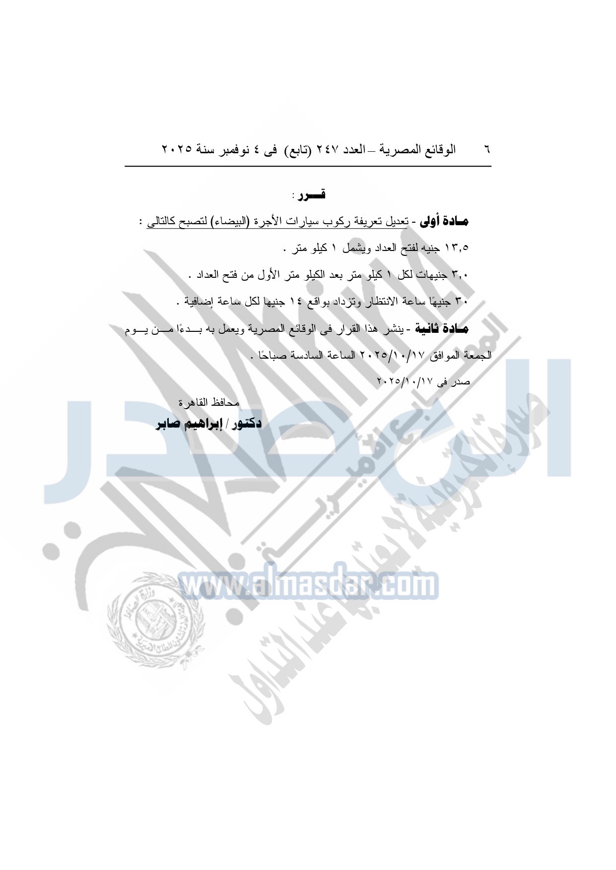 نشرت الوقائع المصرية في العدد 247 "تابع" الصادر في 4 نوفمبر سنة 2025، قرار محافظة القاهرة، رقم 19058 لسنة 2025، بشأن تعديل تعريفة ركوب سيارات الأجرة "التاكسي الأبيض".