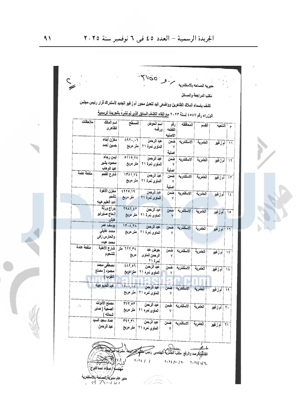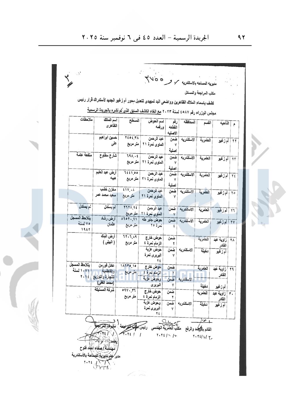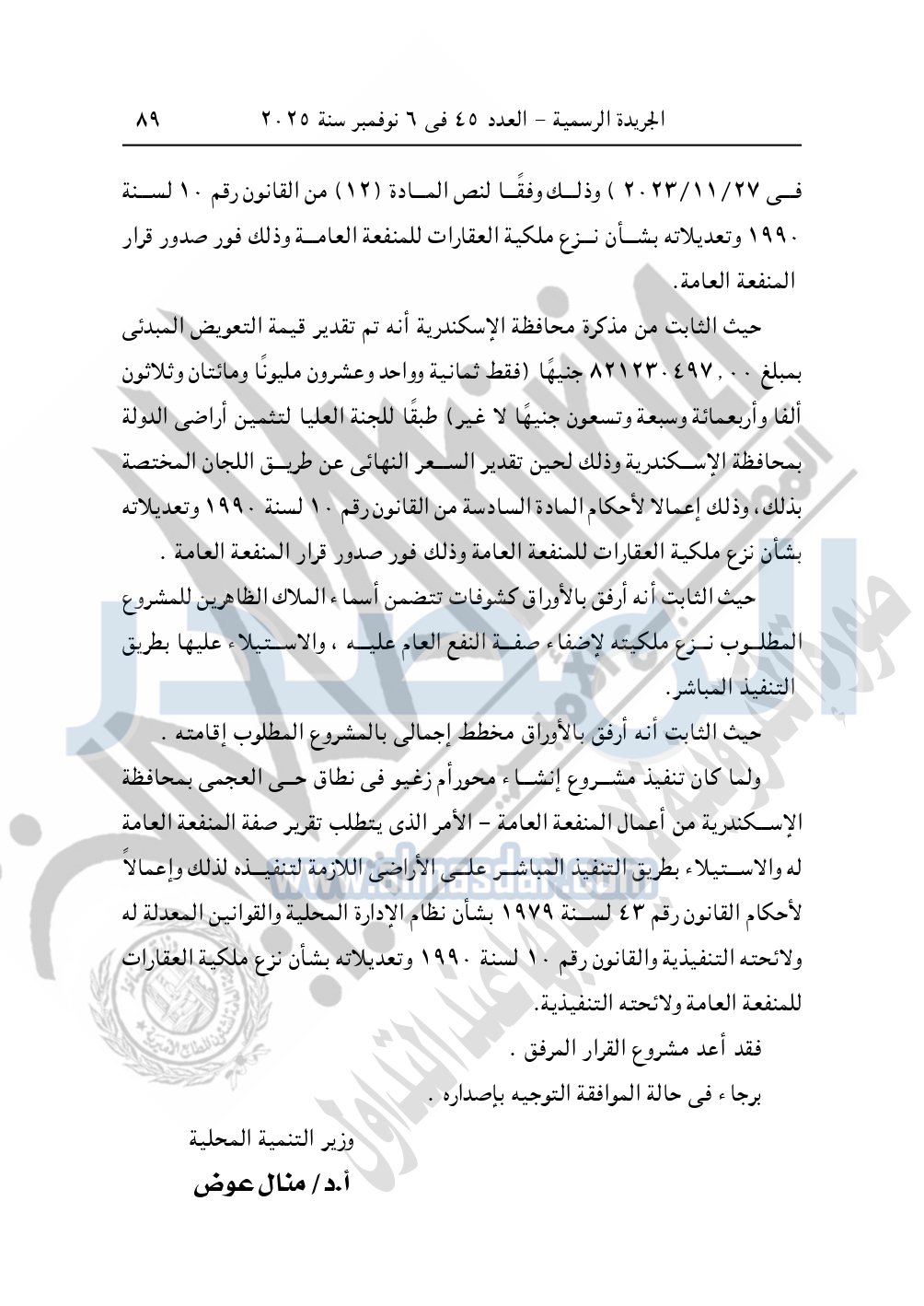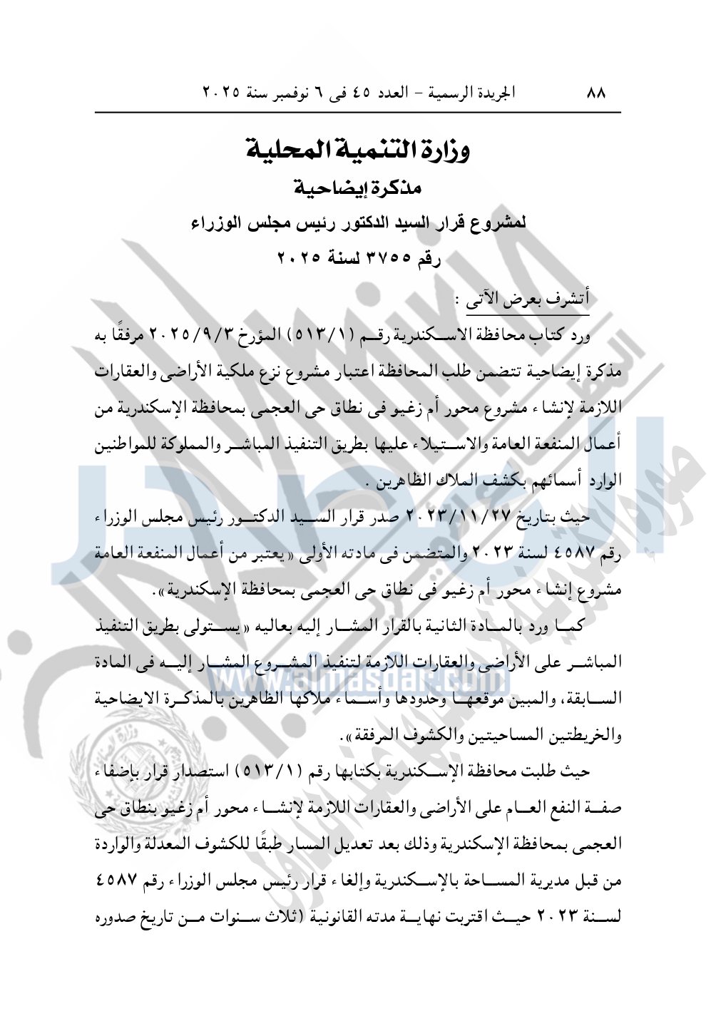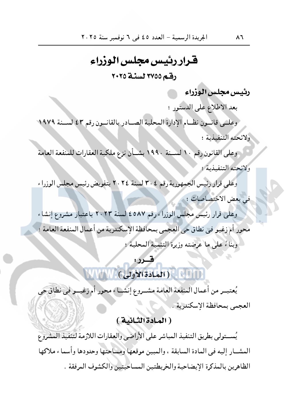 نشرت الجريدة الرسمية في العدد 45، الصادر في 6 نوفمبر سنة 2025، قرار رئيس مجلس الوزراء، رقم 3755 لسنة 2025، بشأن نزع ملكية الأراضي والعقارات لإقامة مشروع إنشاء محور أم زغيو بمحافظة الإسكندرية.