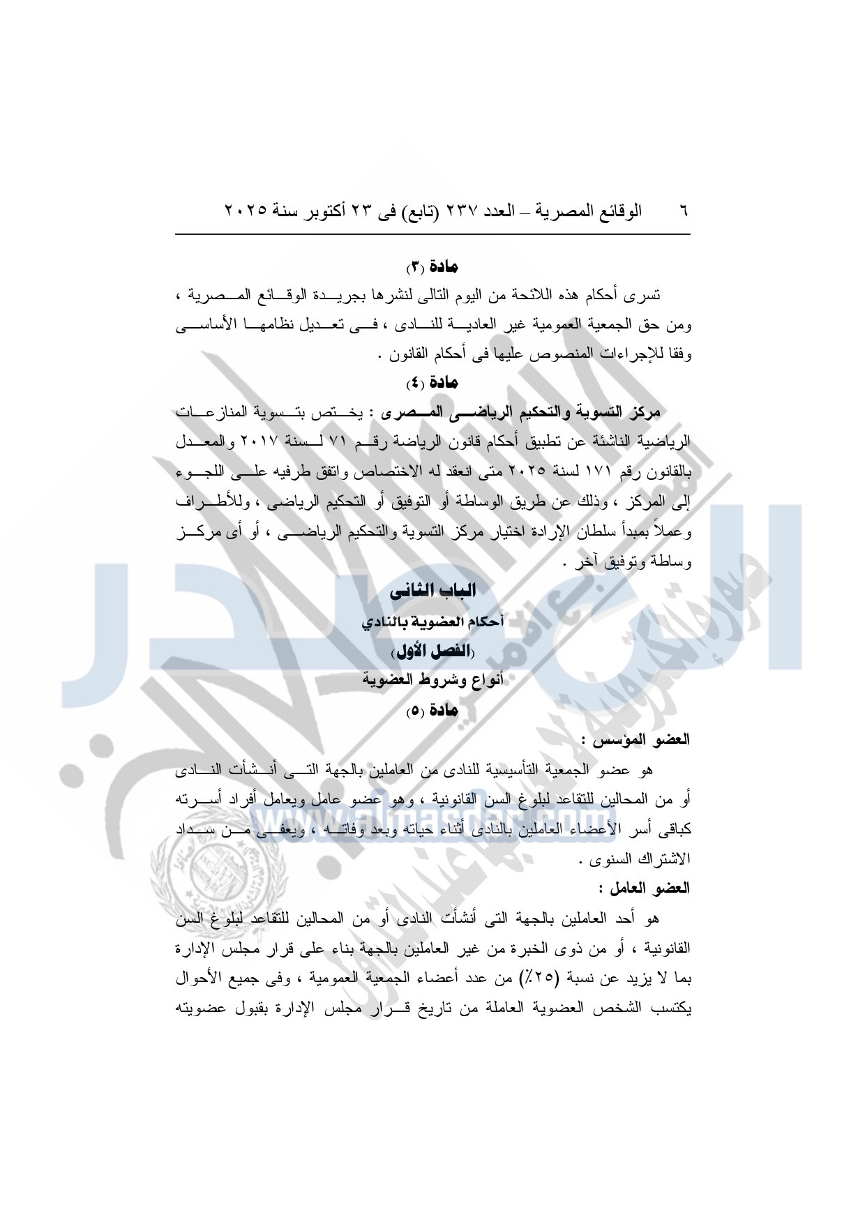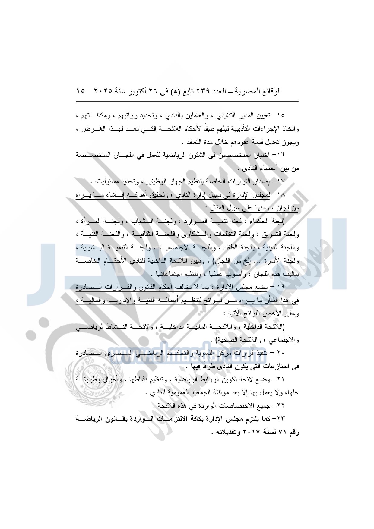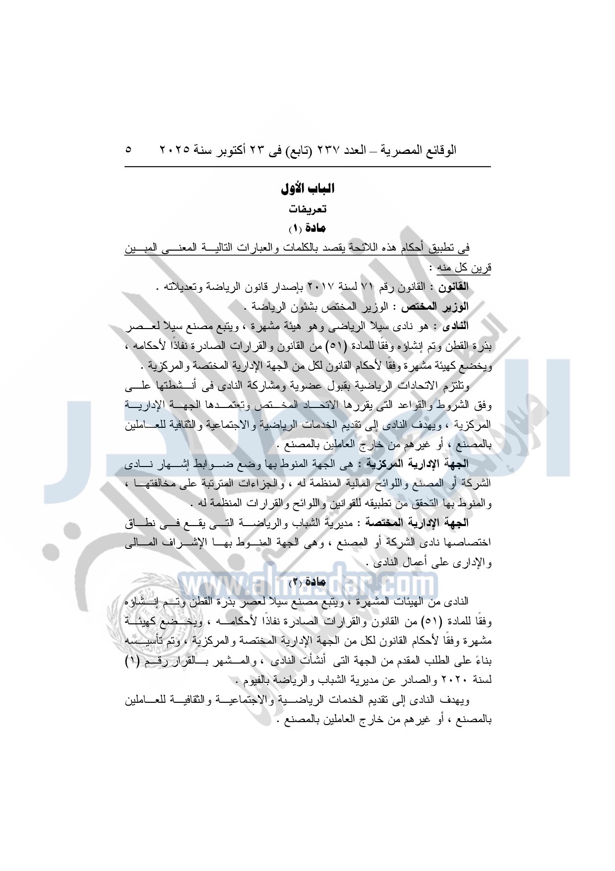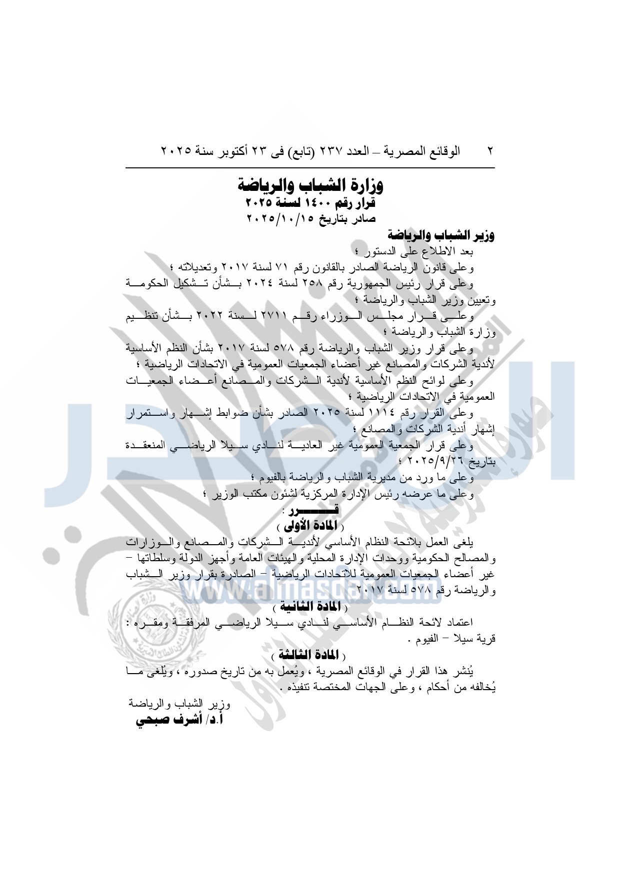 كما نشرت الوقائع المصرية في العدد 237 "تابع"، بتاريخ 23 أكتوبر 2025، قرار وزارة الشباب والرياضة، رقم 1400 لسنة 2025، بتاريخ 15-10-2025، بشأن اعتماد لائحة النظام الأساسي لنادي سيلا الريا.
