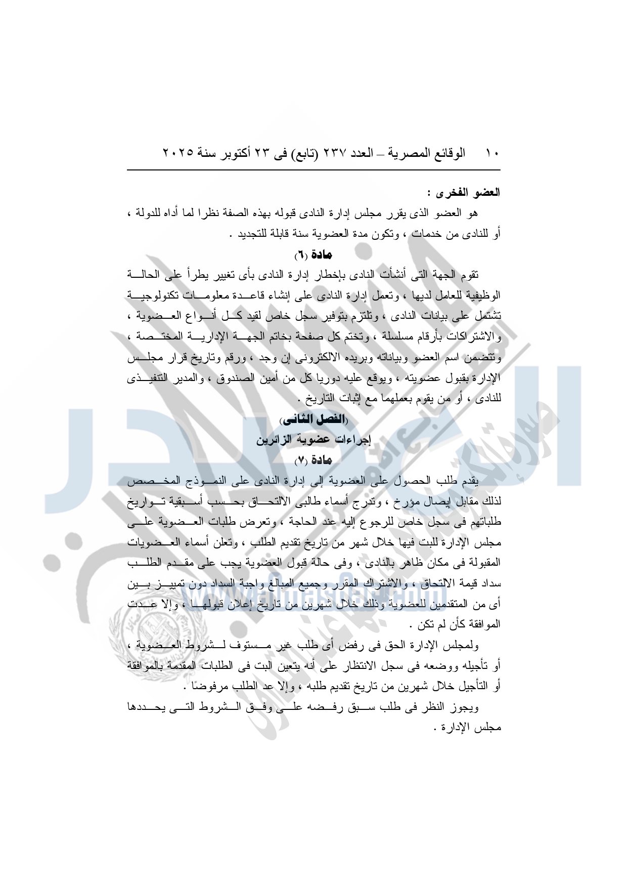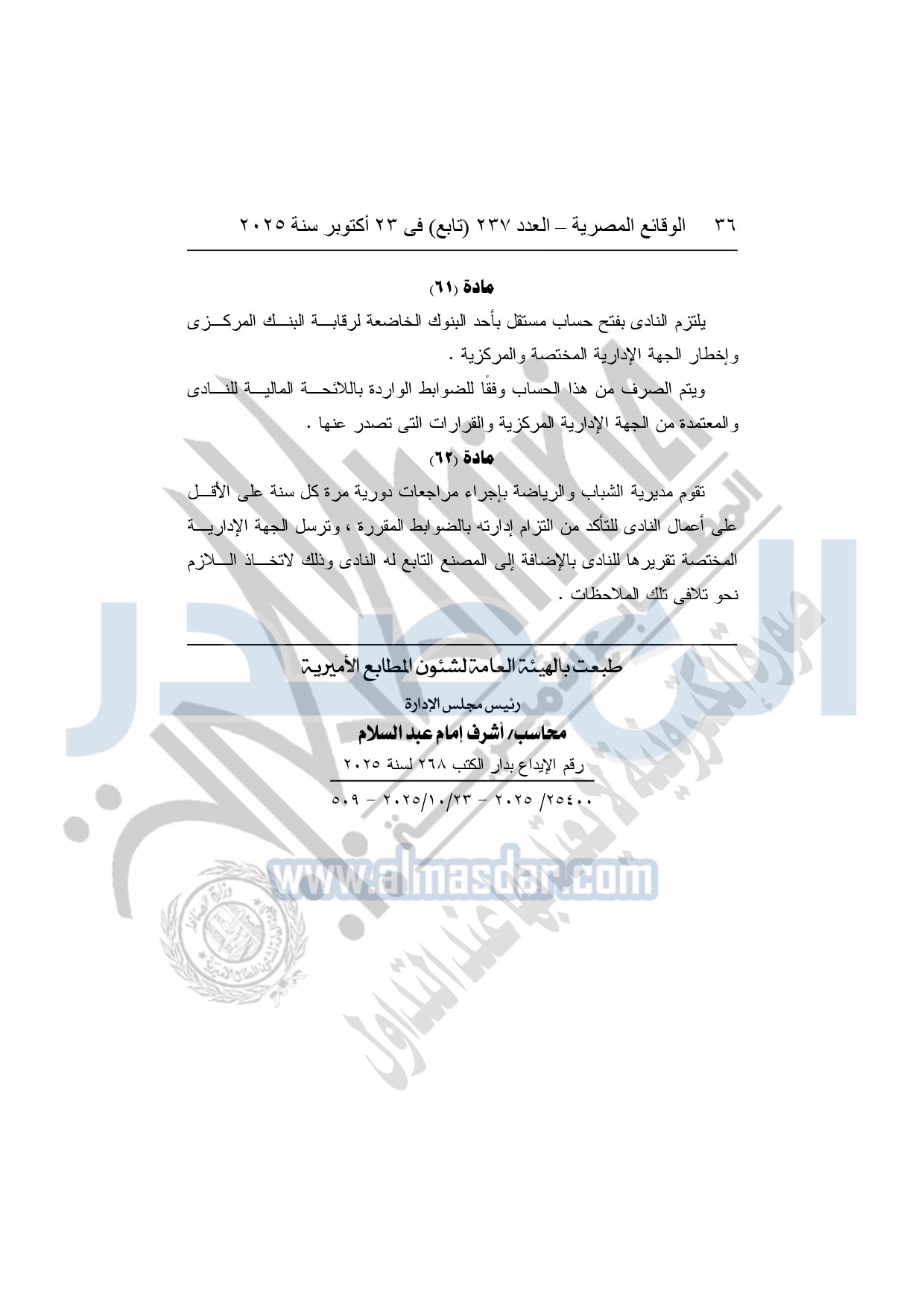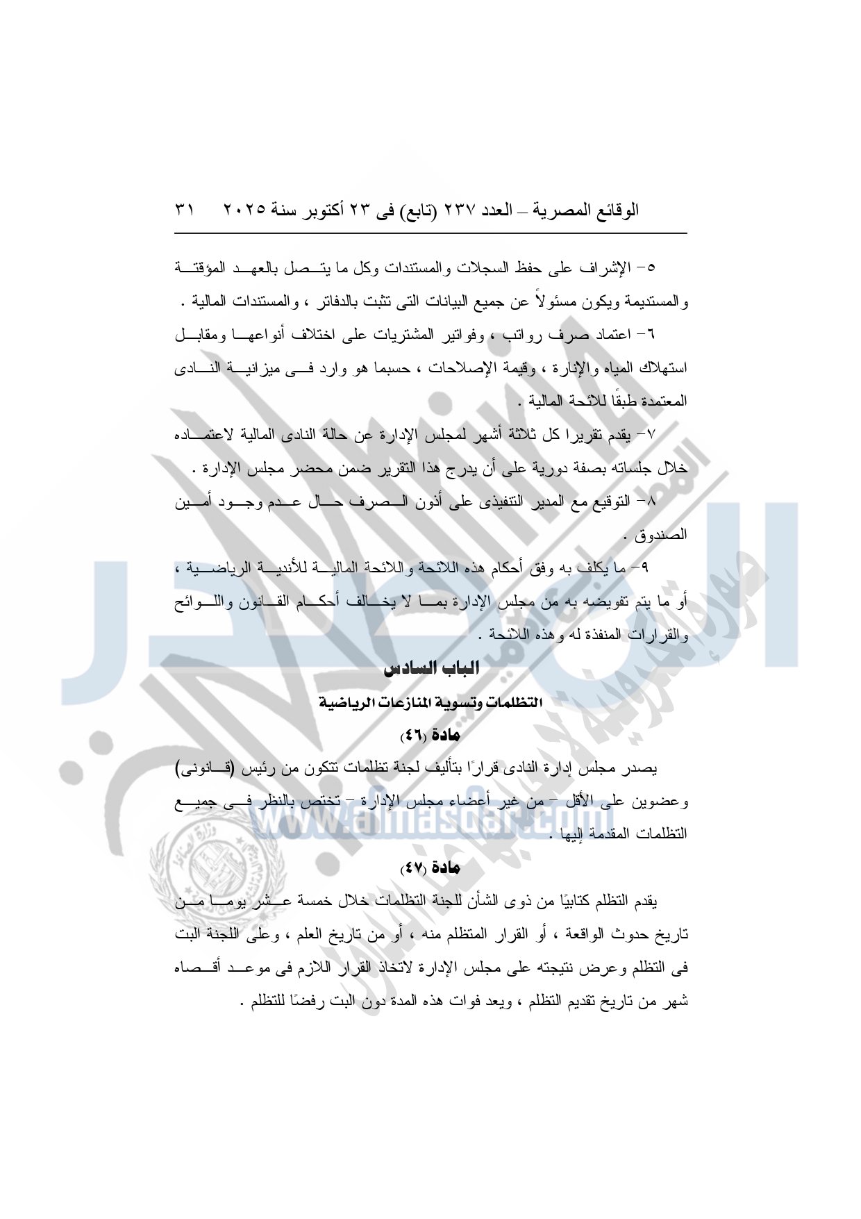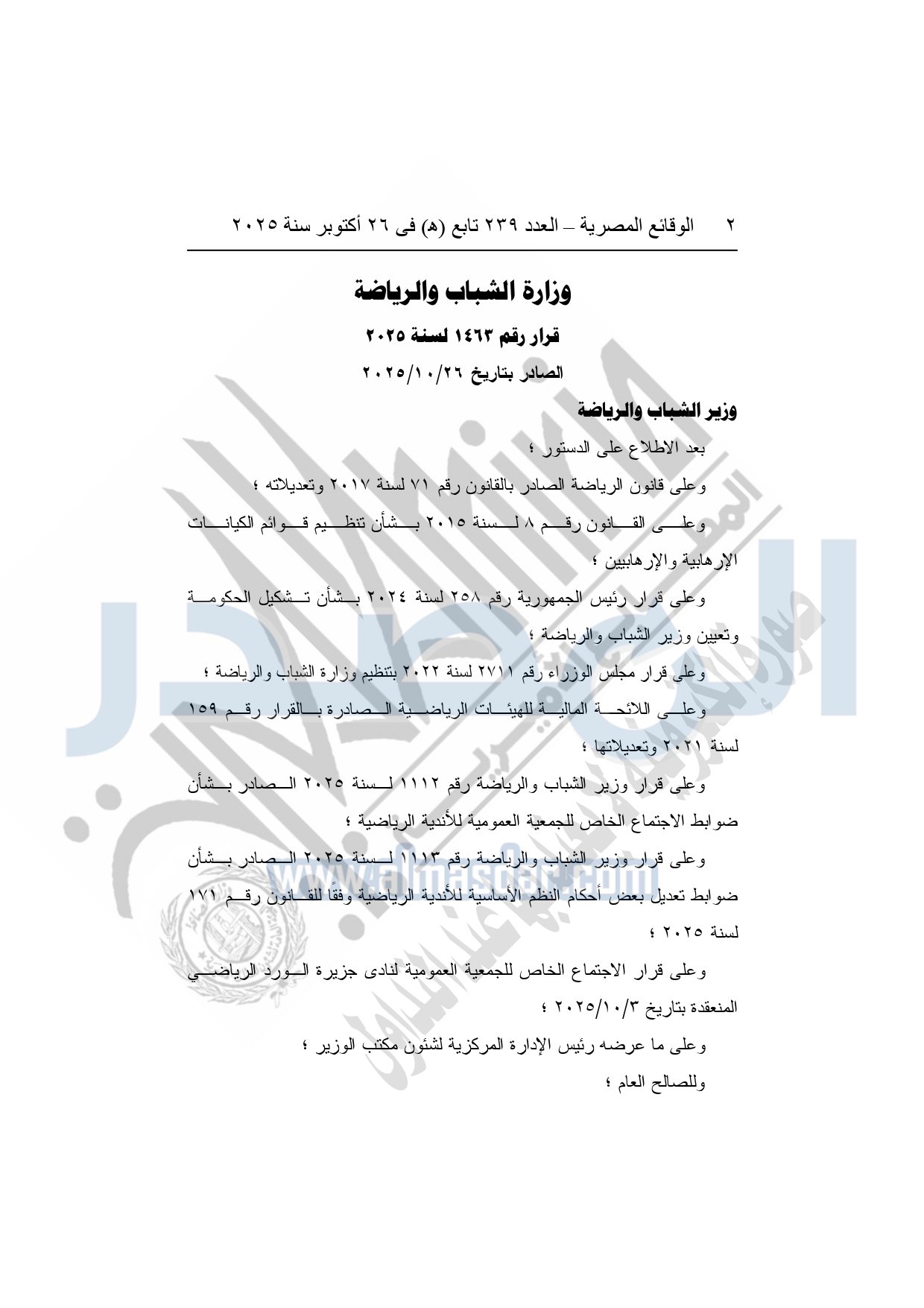 كما نشرت الوقائع المصرية في العدد 237 "تابع"، بتاريخ 23 أكتوبر 2025، قرار وزارة الشباب والرياضة، رقم 1400 لسنة 2025، بتاريخ 15-10-2025، بشأن اعتماد لائحة النظام الأساسي لنادي سيلا الريا.