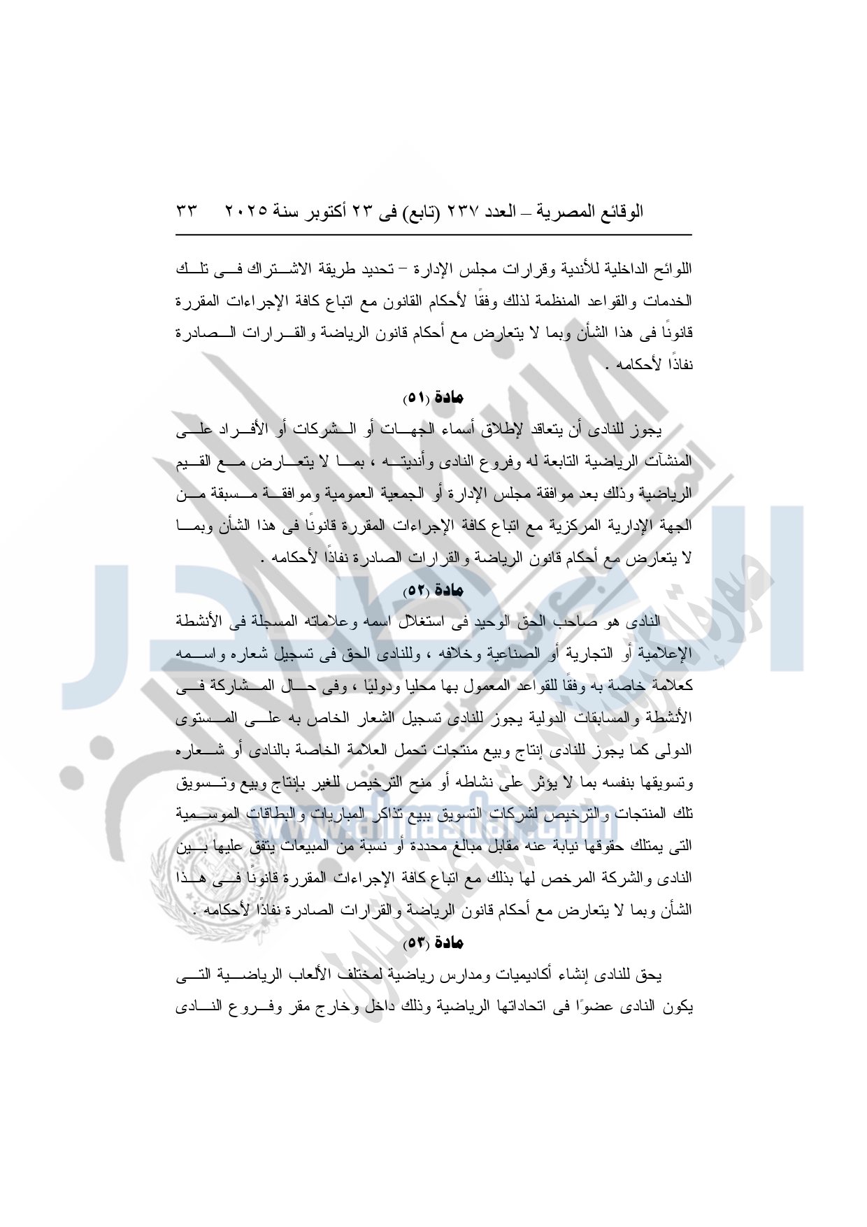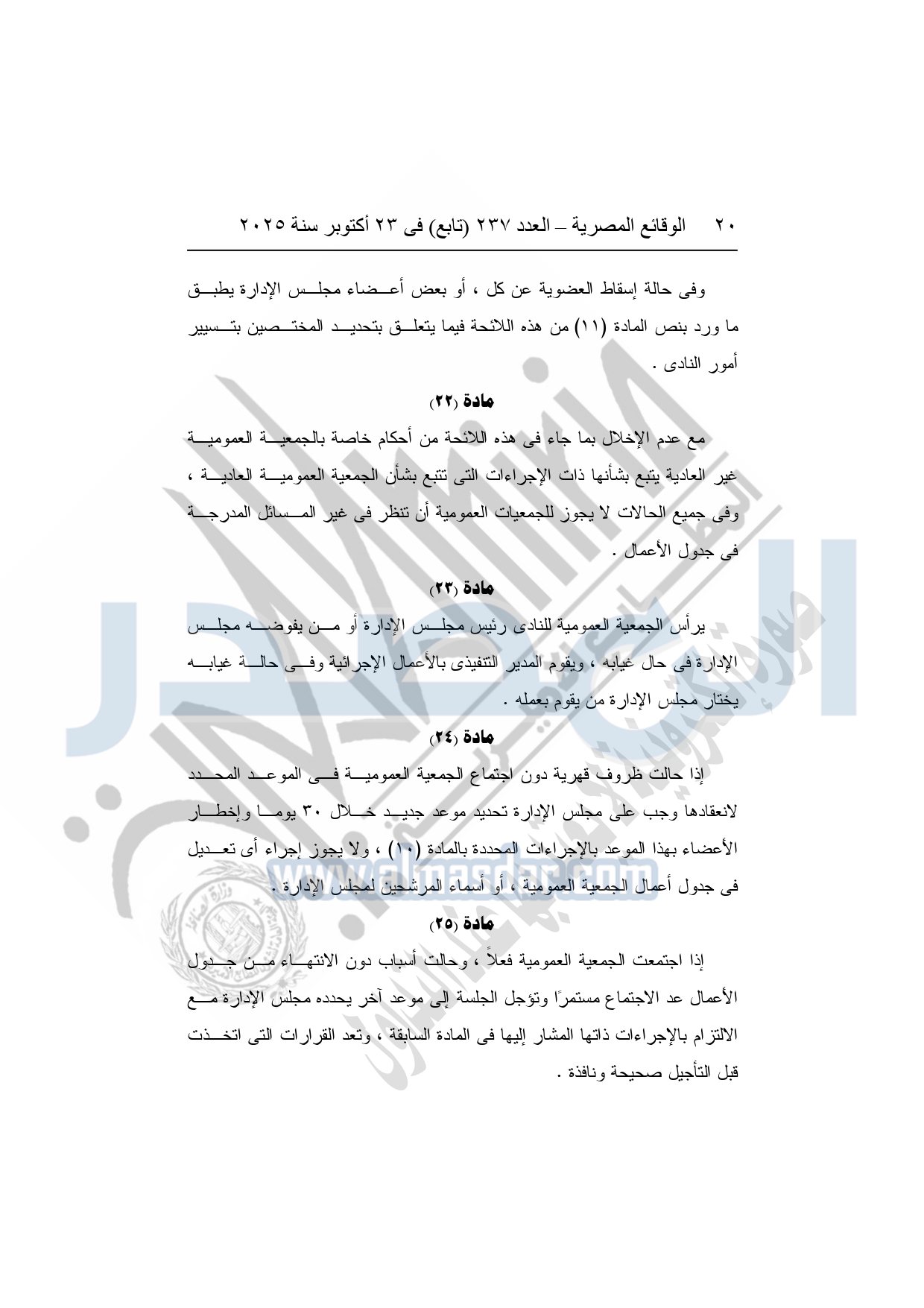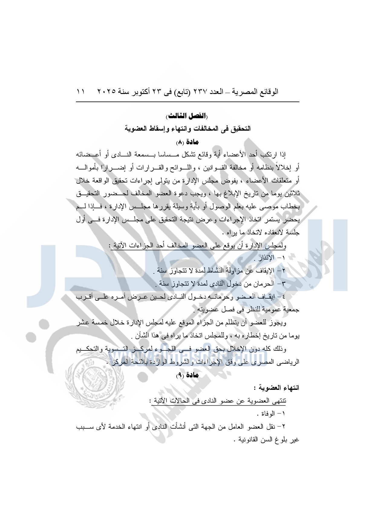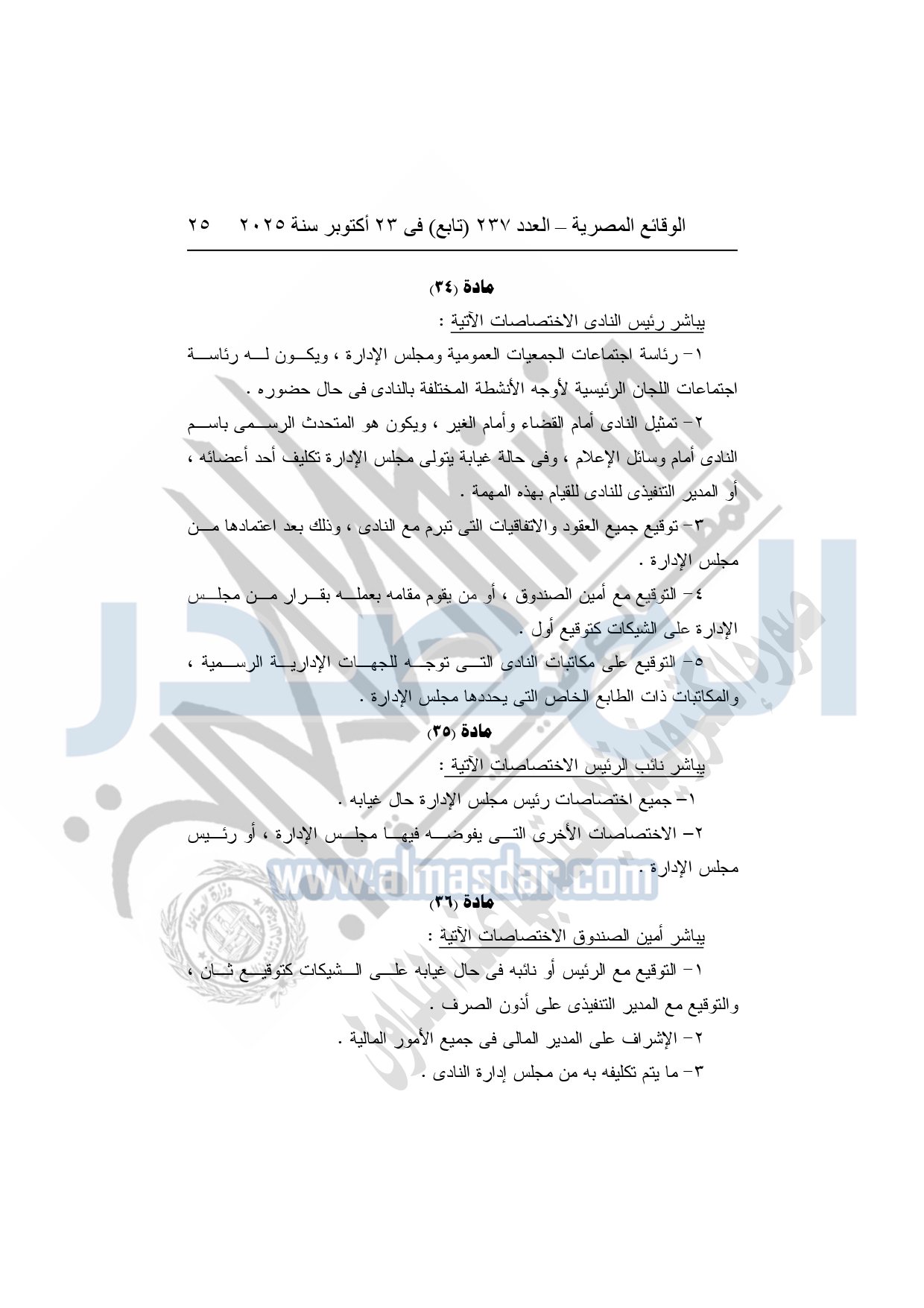 كما نشرت الوقائع المصرية في العدد 237 "تابع"، بتاريخ 23 أكتوبر 2025، قرار وزارة الشباب والرياضة، رقم 1400 لسنة 2025، بتاريخ 15-10-2025، بشأن اعتماد لائحة النظام الأساسي لنادي سيلا الريا.