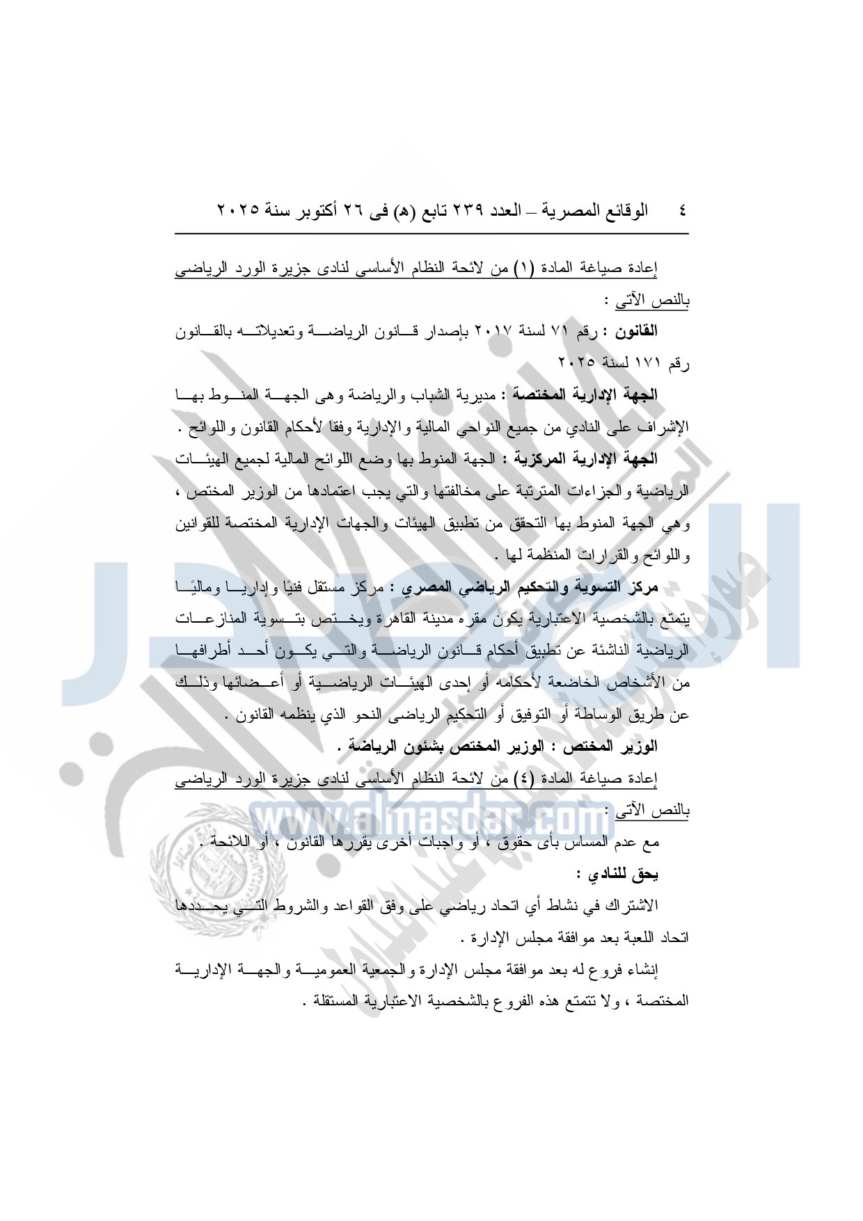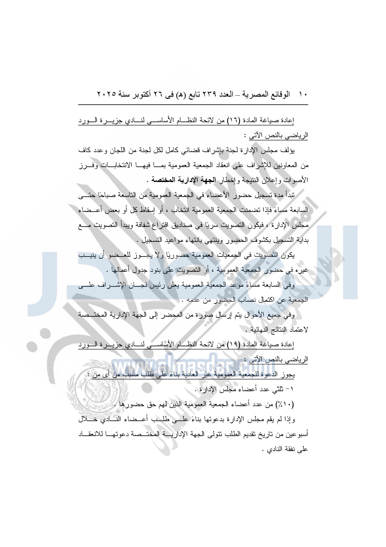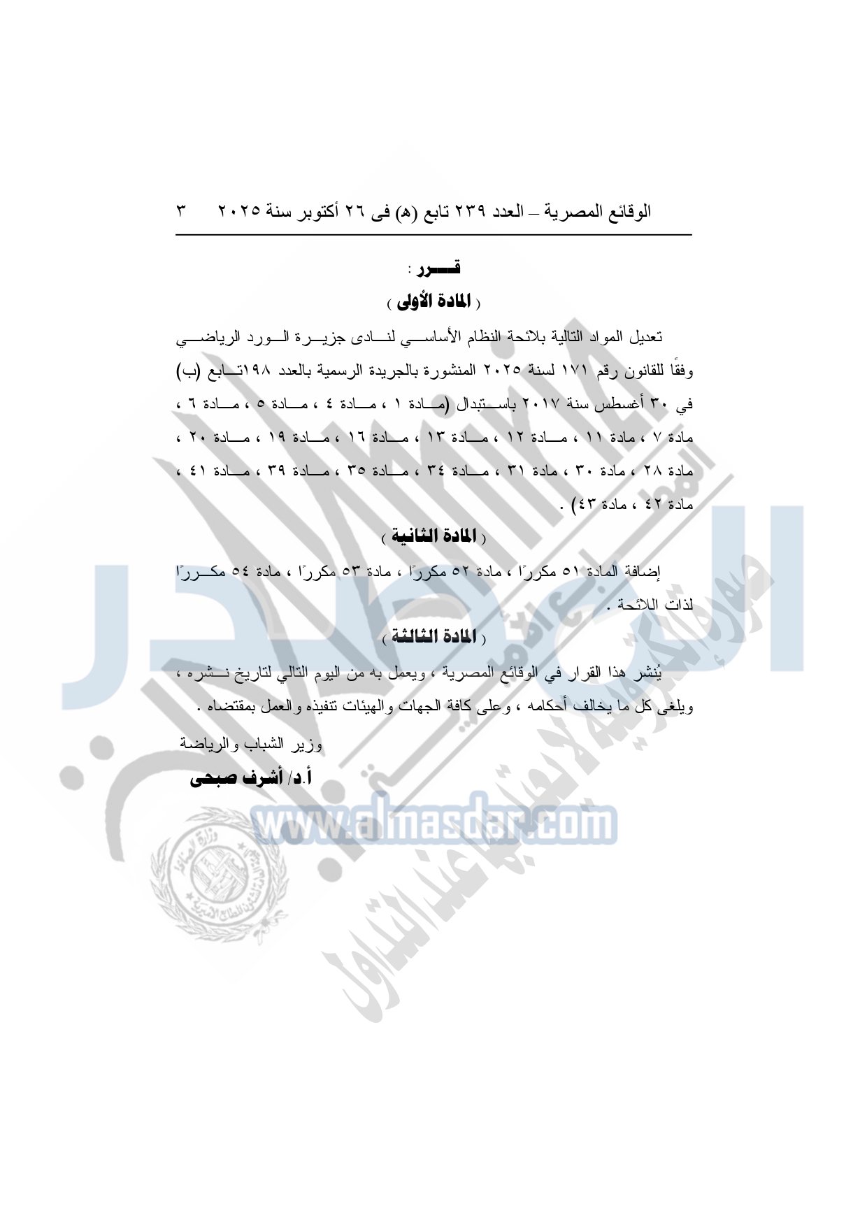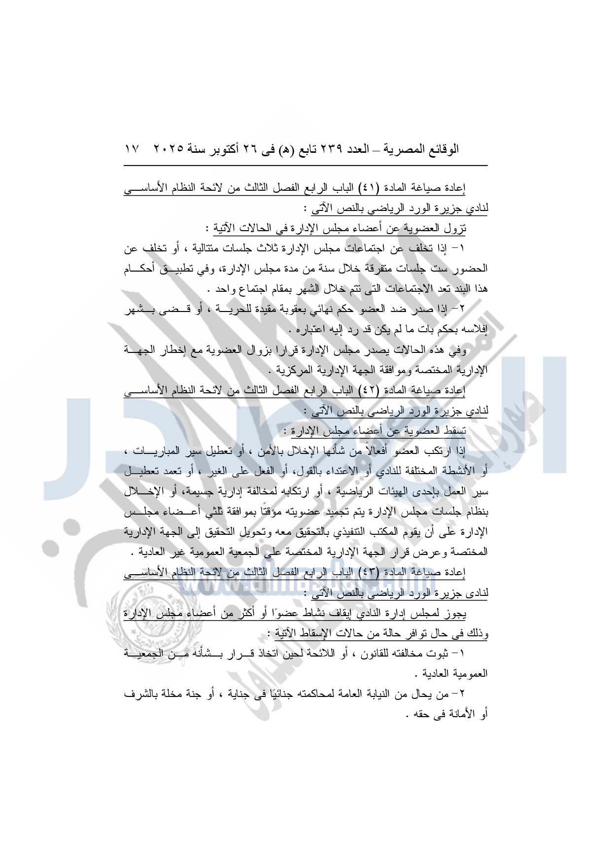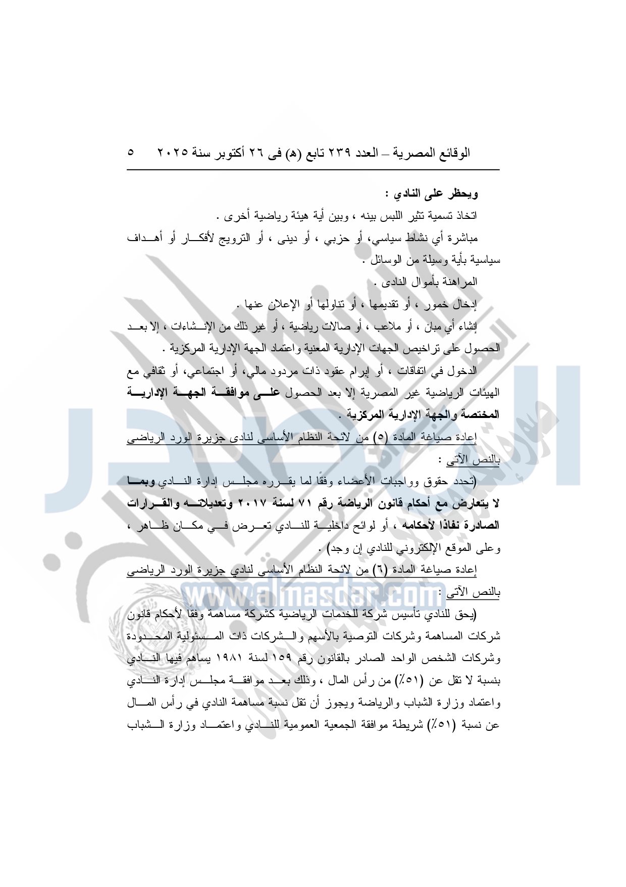تعديل المواد التالية بلائحة النظام الأساسي لنادى جزيرة الورد الرياضي وفقًا للقانون رقم 171 لسنة 2025 المنشورة بالجريدة الرسمية بالعدد 198 تابع "ب" في 30 أغسطس سنة 2017 باستبدال "مادة 1، مادة 4، مادة 5، مادة 6، مادة 7، مادة 11، مادة 12، مادة 13، مادة 16، مادة 19، مادة 20، مادة 28، مادة 30، مادة 31، مادة 34، مادة 35، مادة 39، مادة 41، مادة 42، مادة 43".